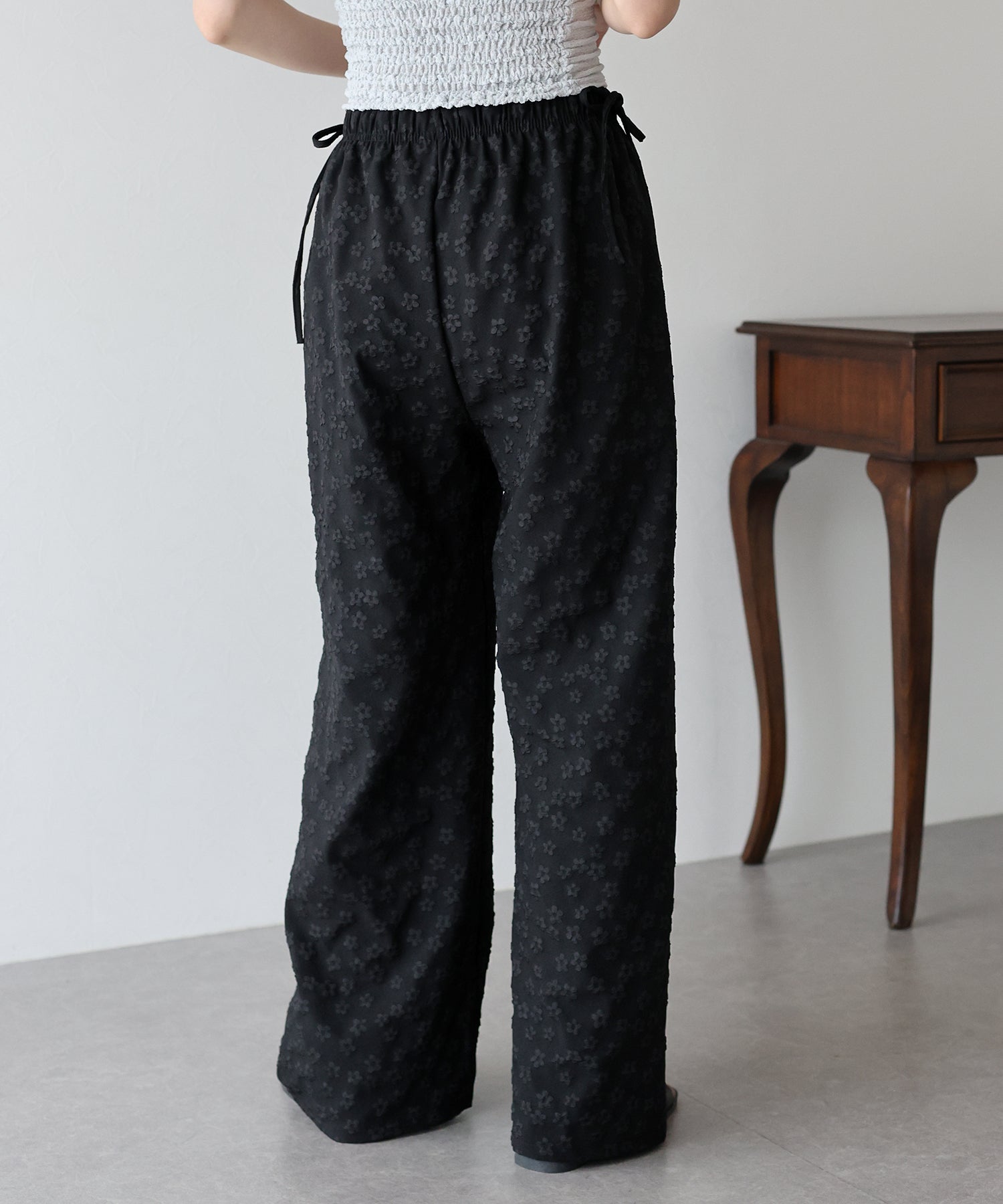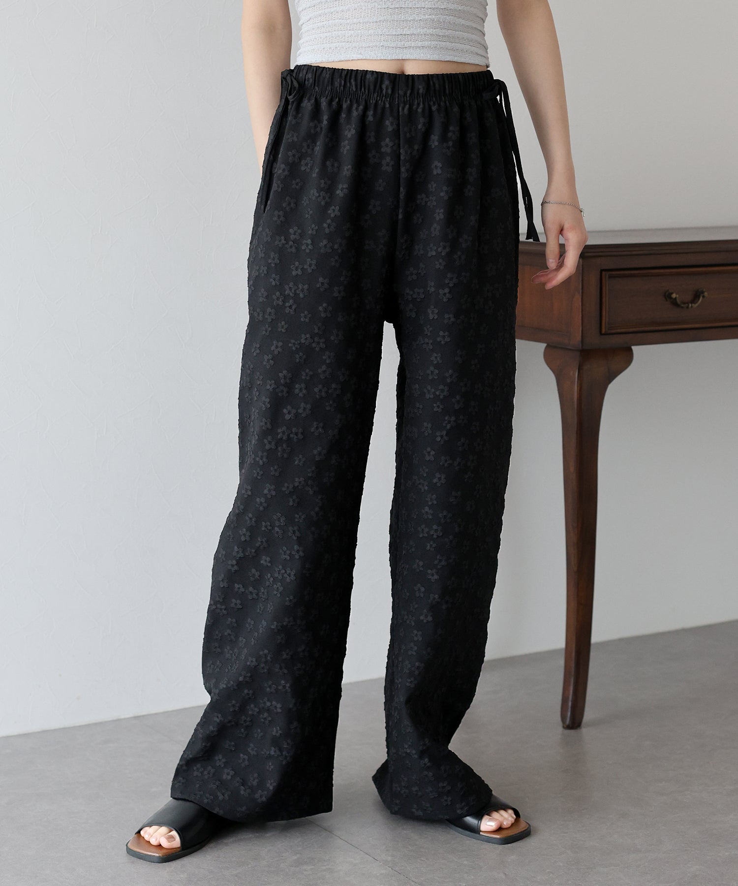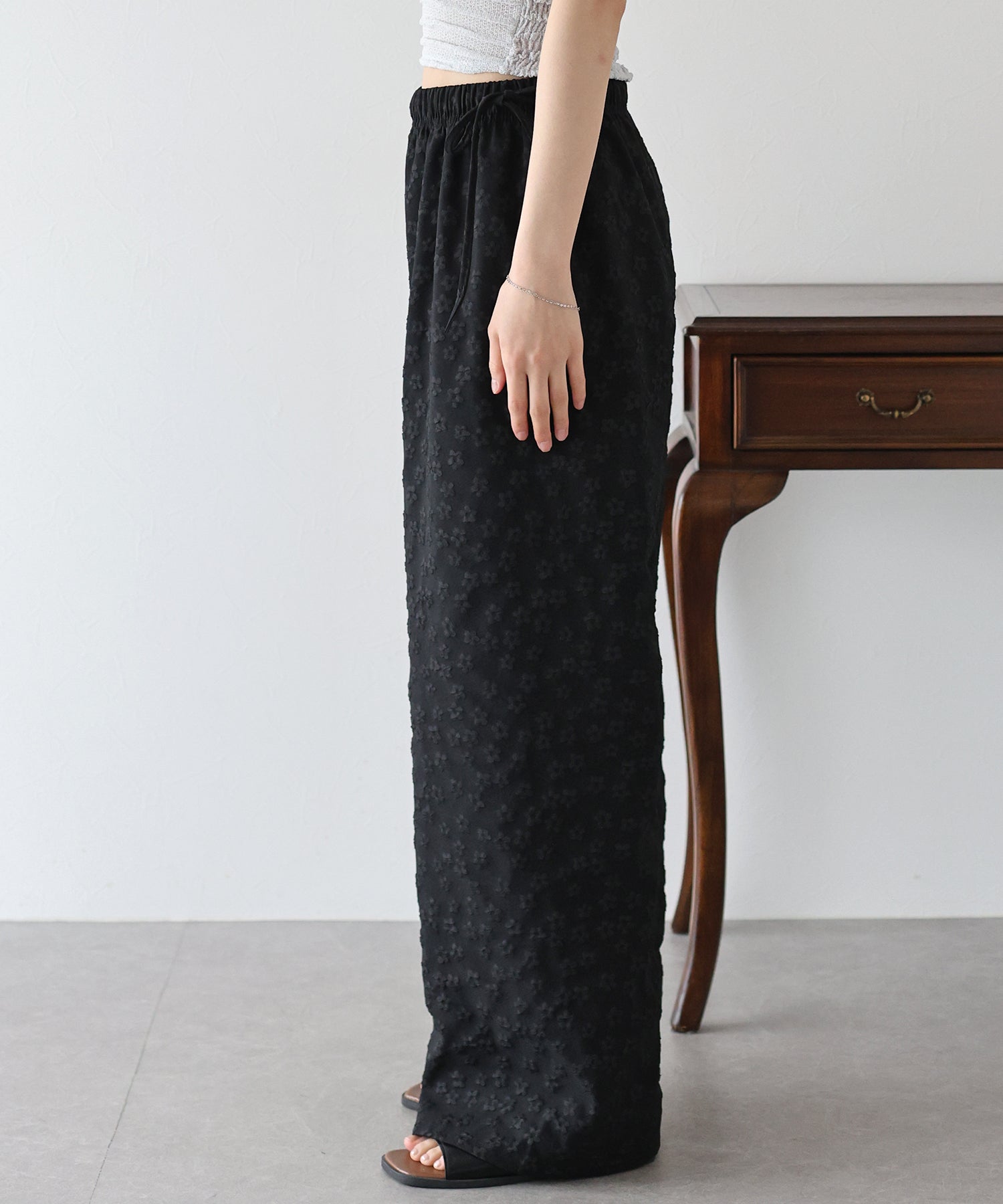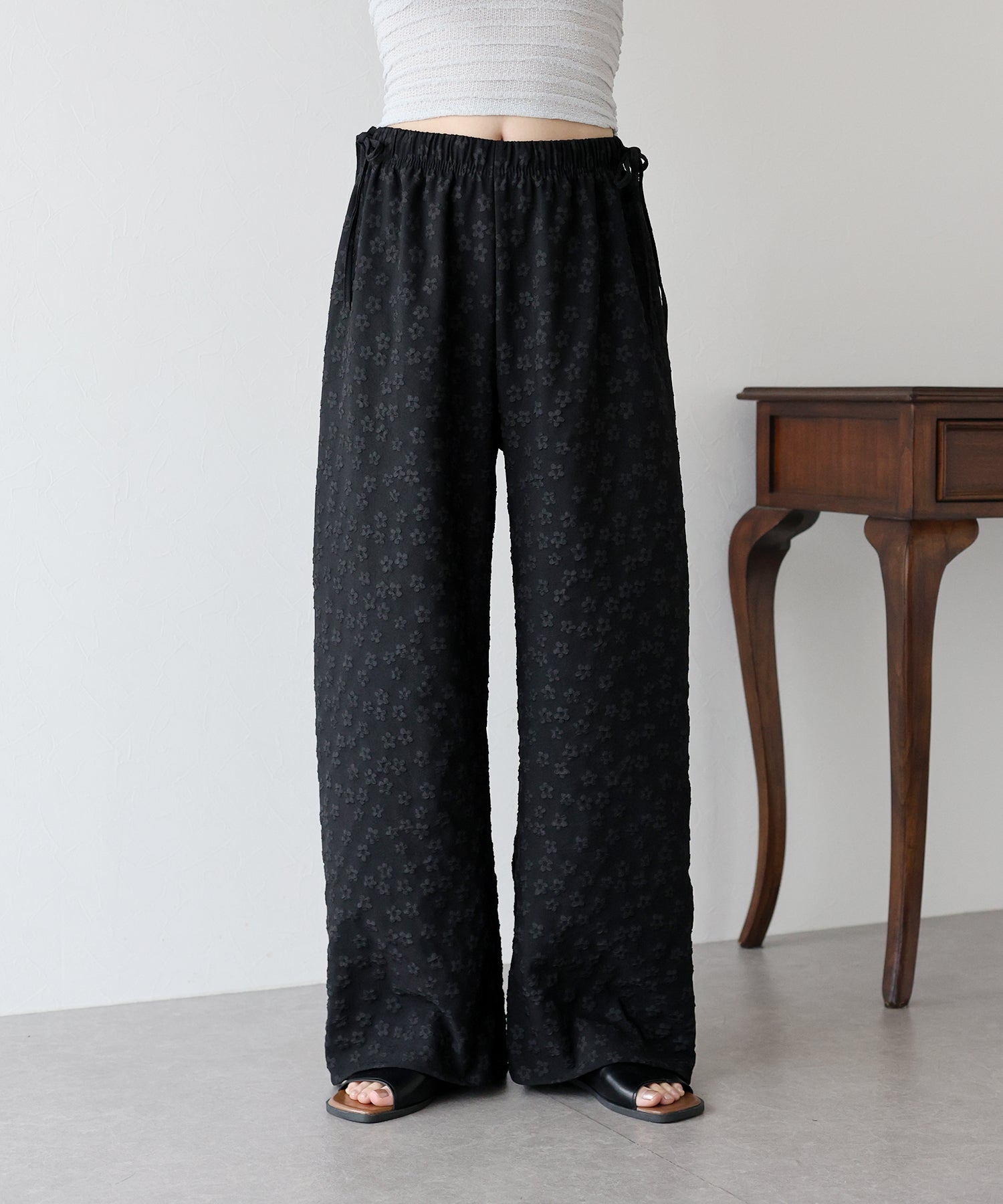 凹凸感のあるフラワー柄がキュートなワイドパンツ