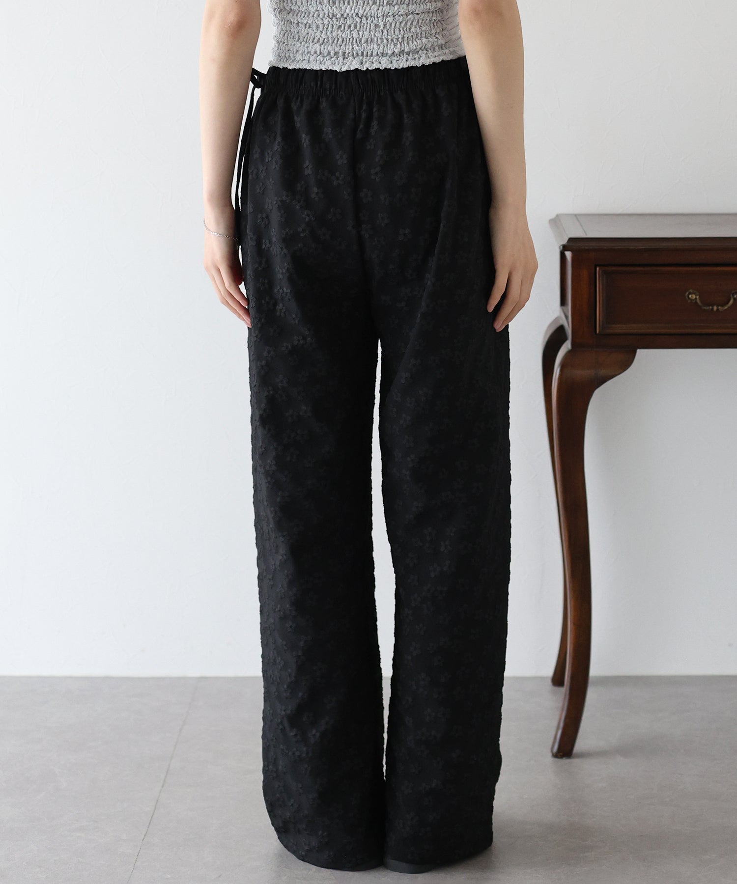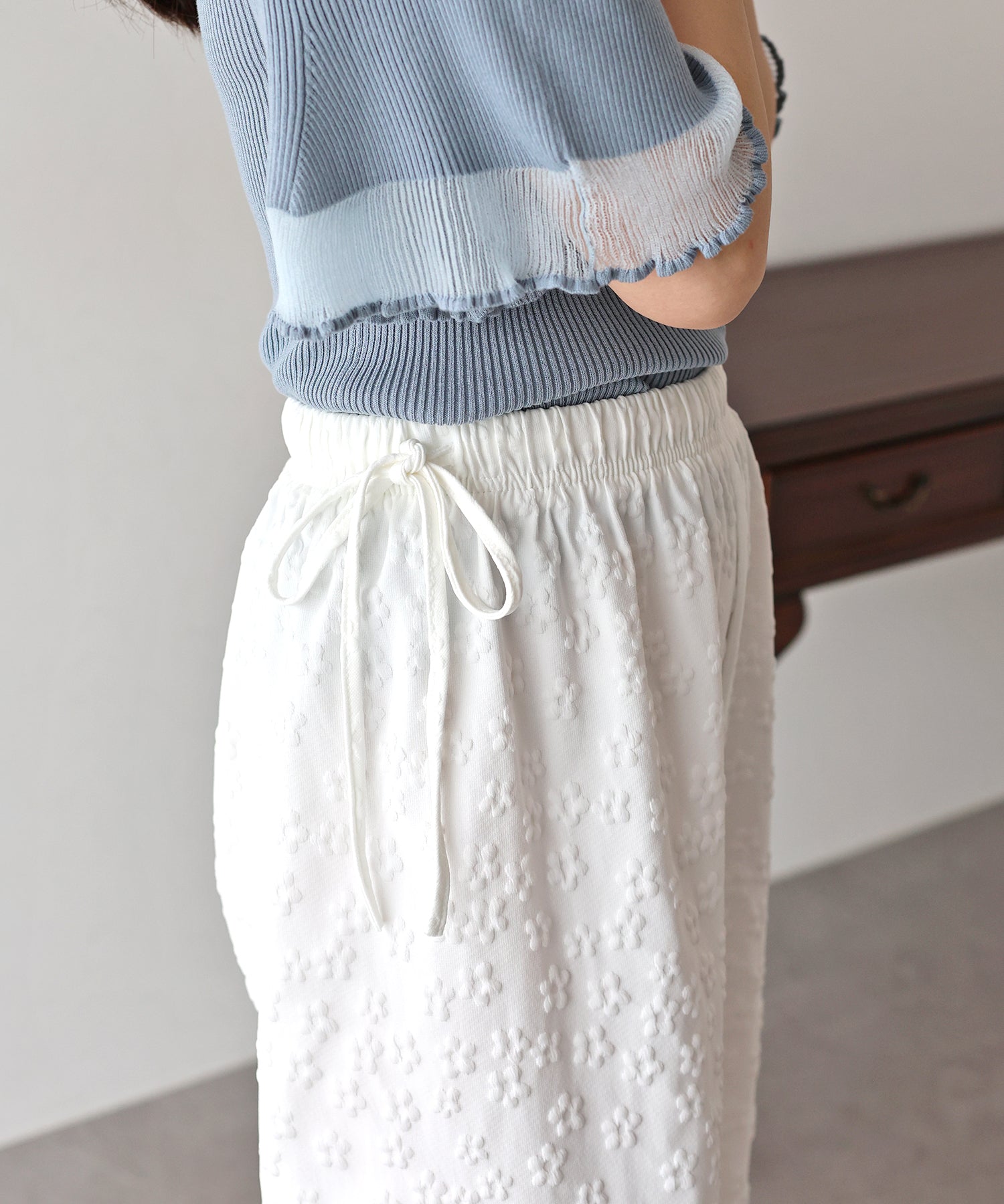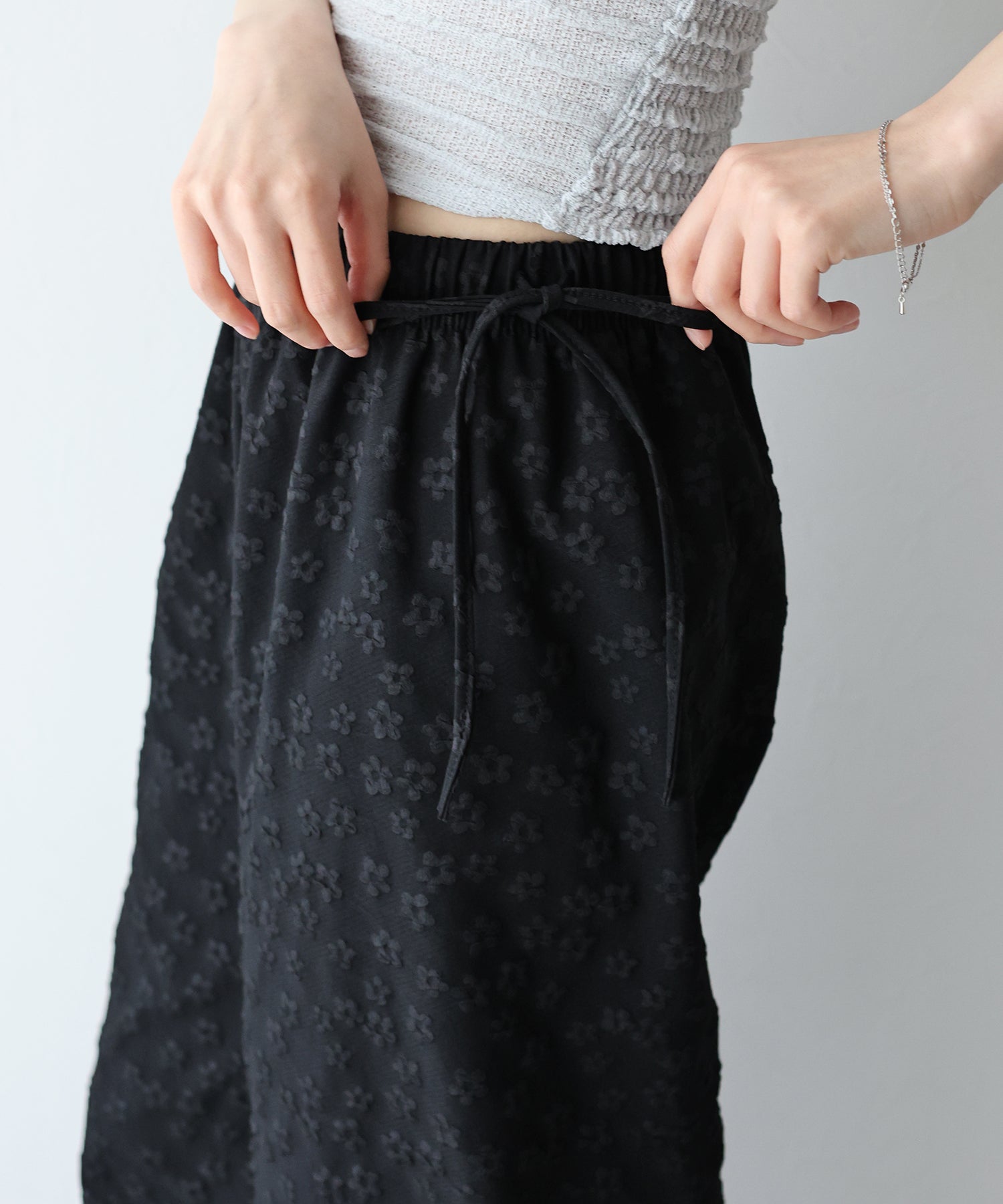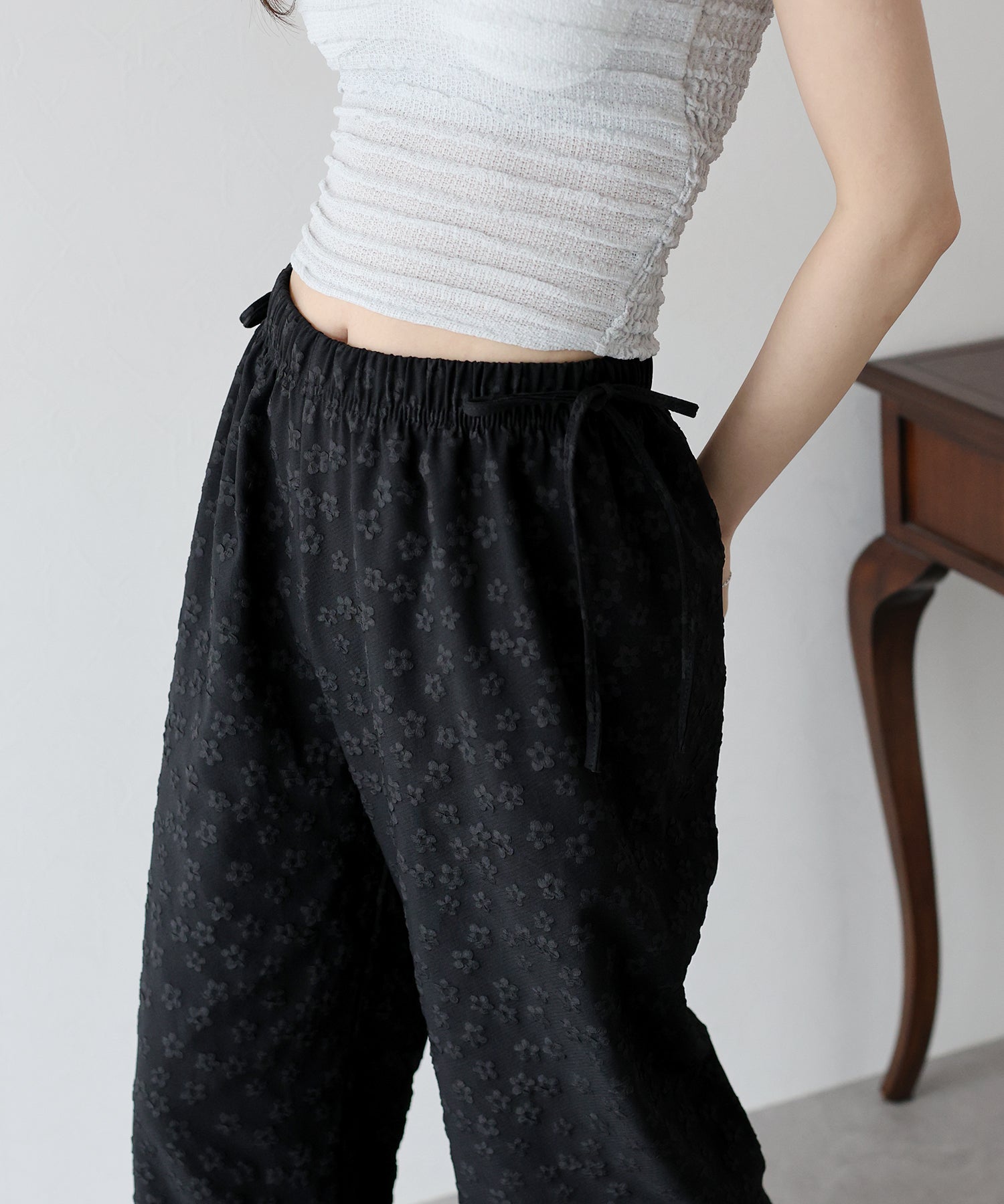 凹凸感のあるフラワー柄がキュートなワイドパンツ