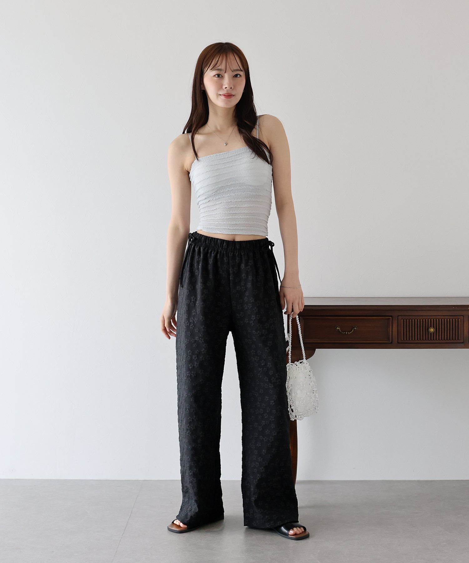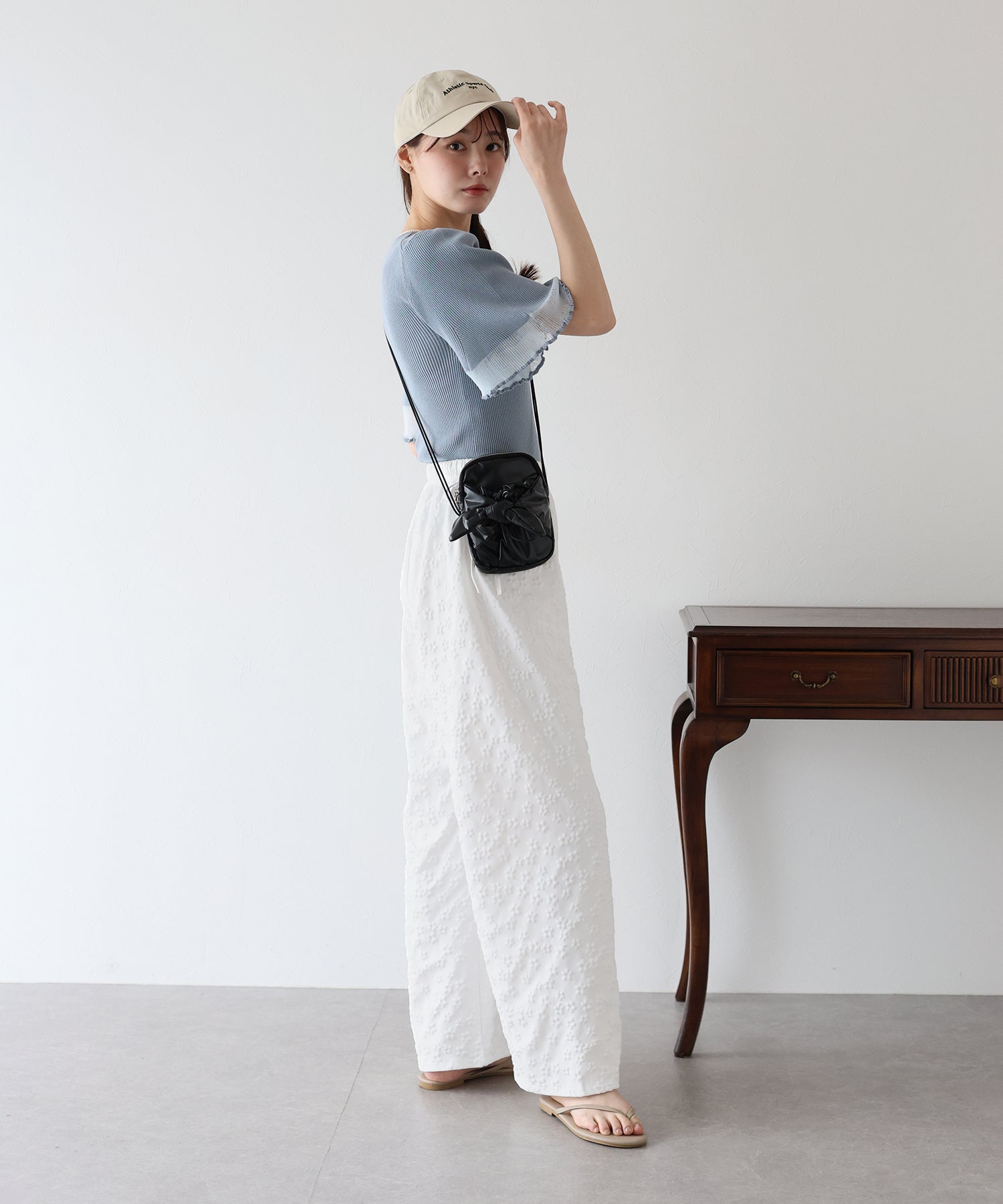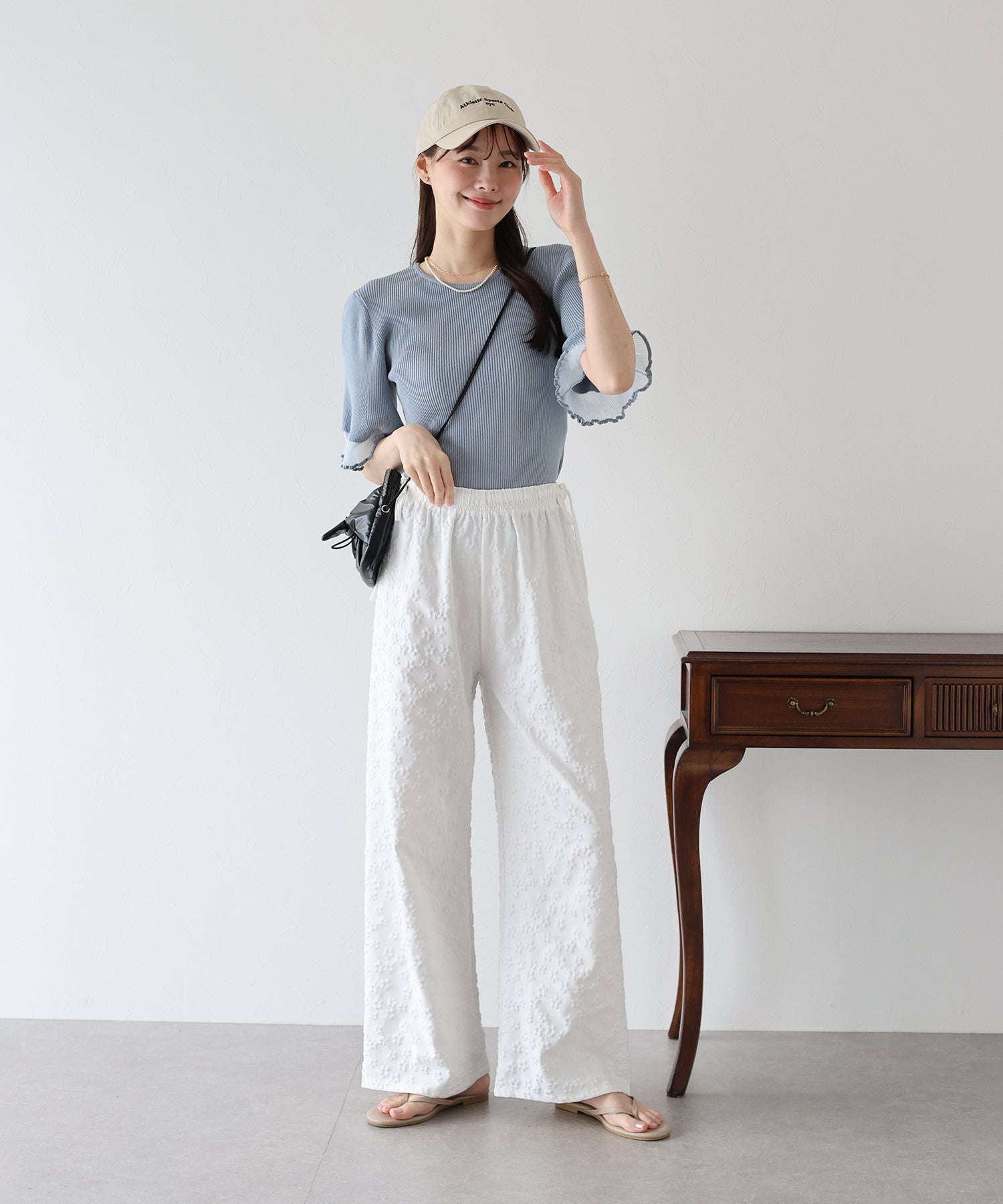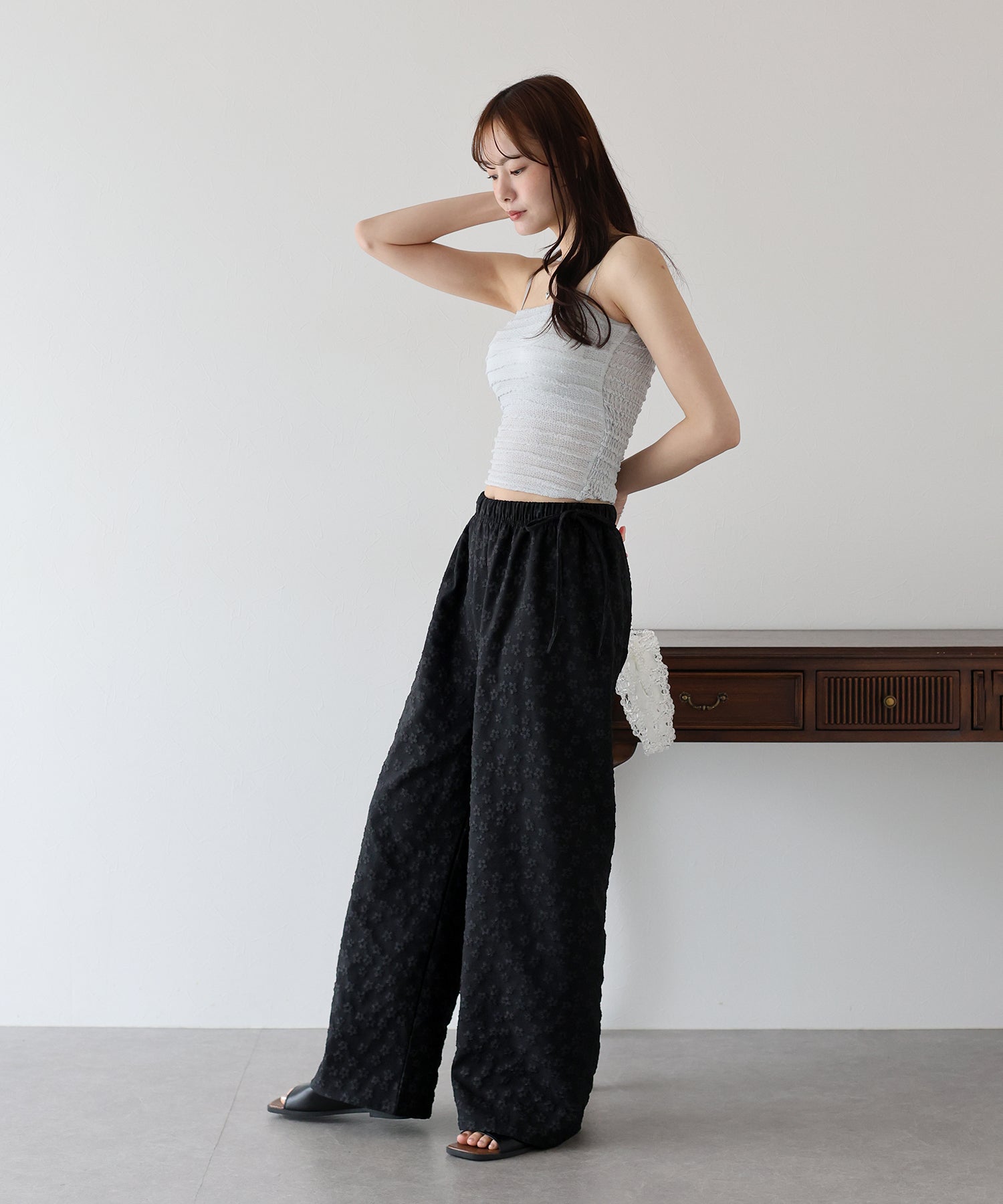 凹凸感のあるフラワー柄がキュートなワイドパンツ