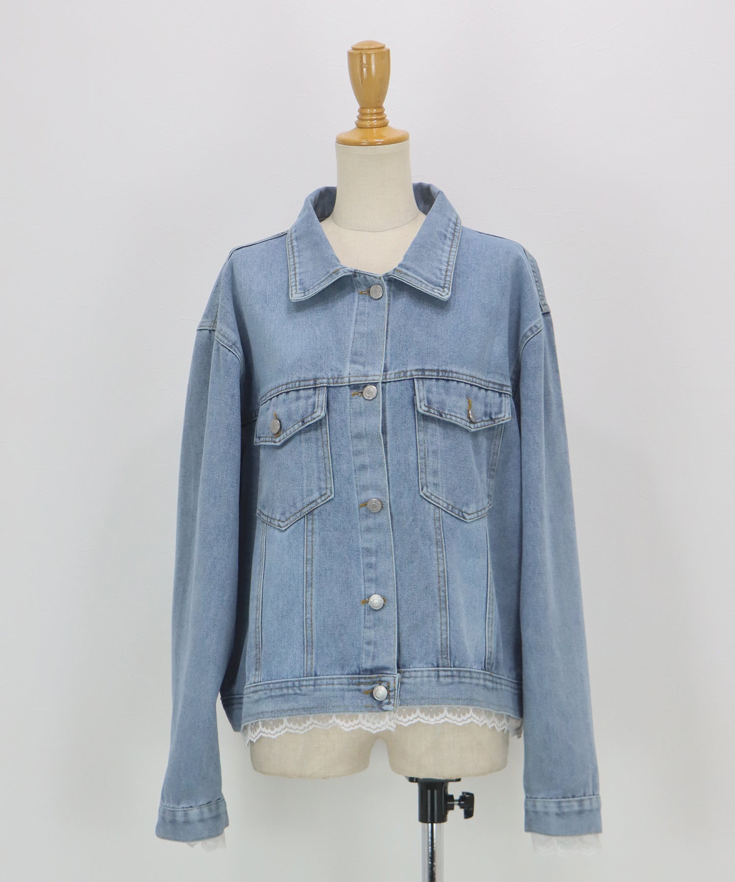 コーディネートに欠かせない定番のデニムジャケットに、繊細なレースをあしらったトレンドライクな一着。