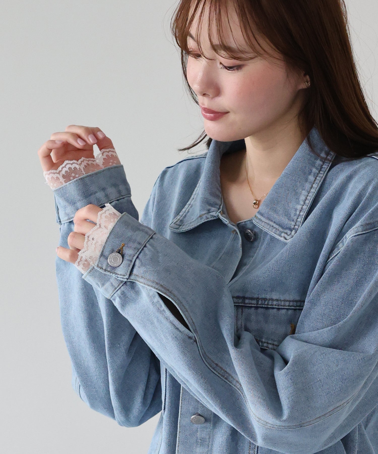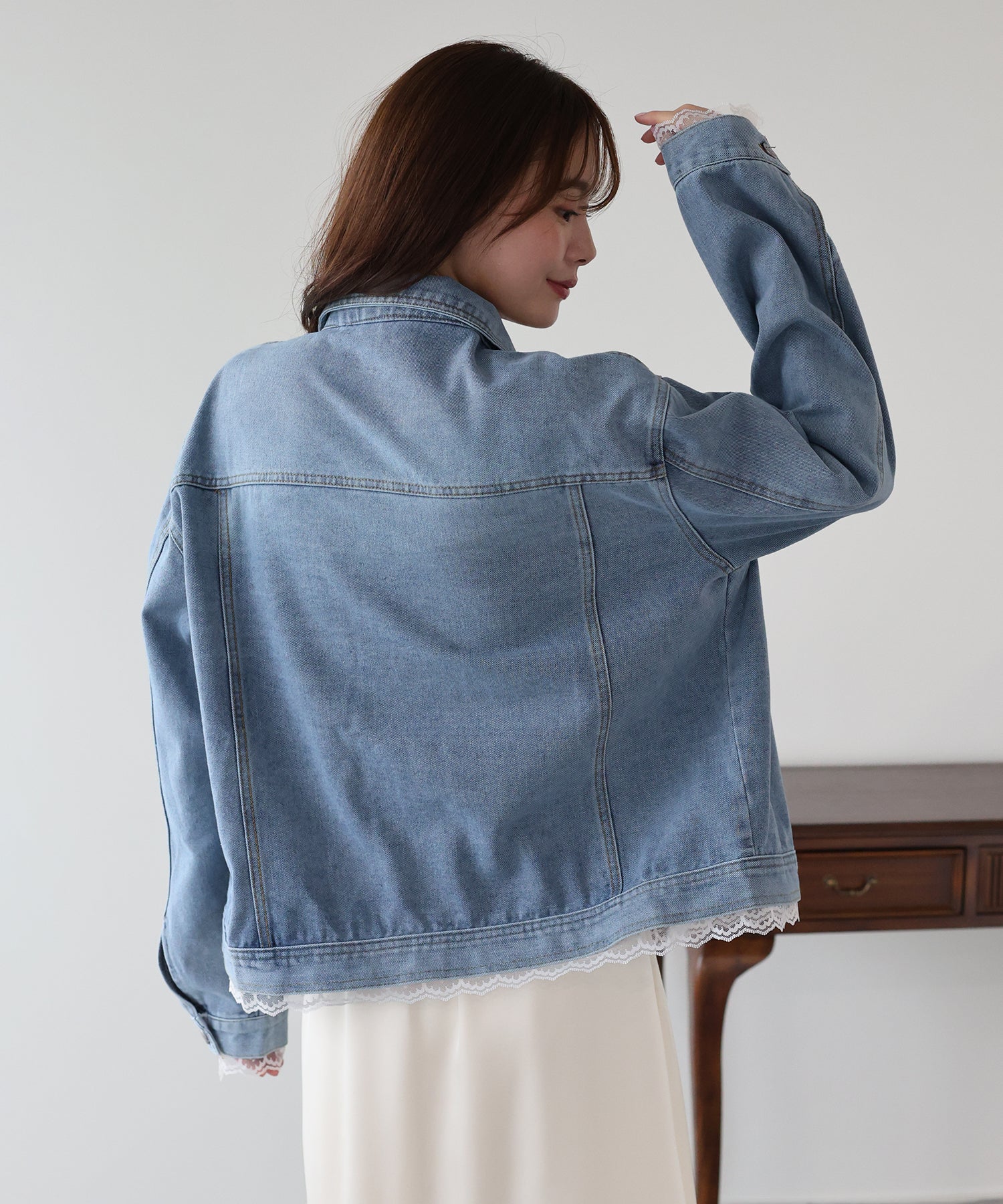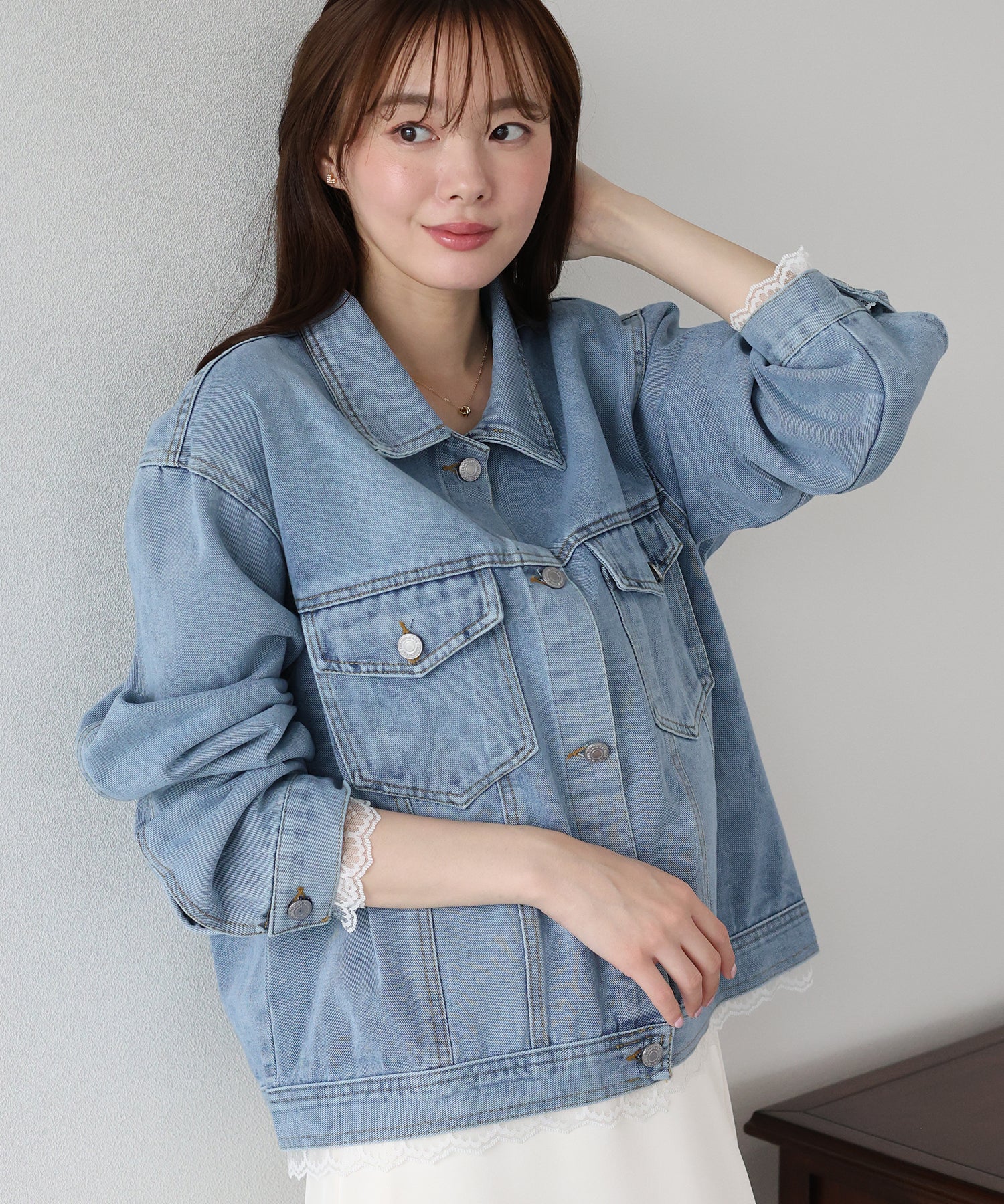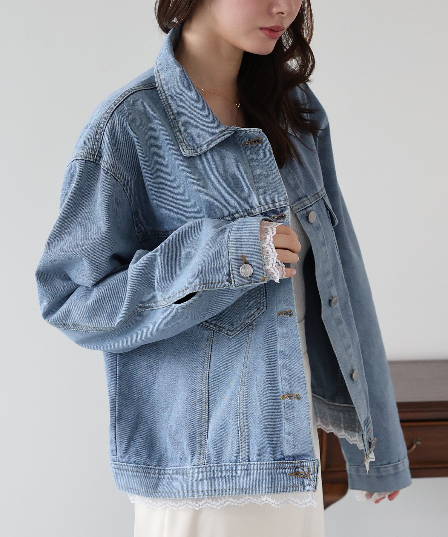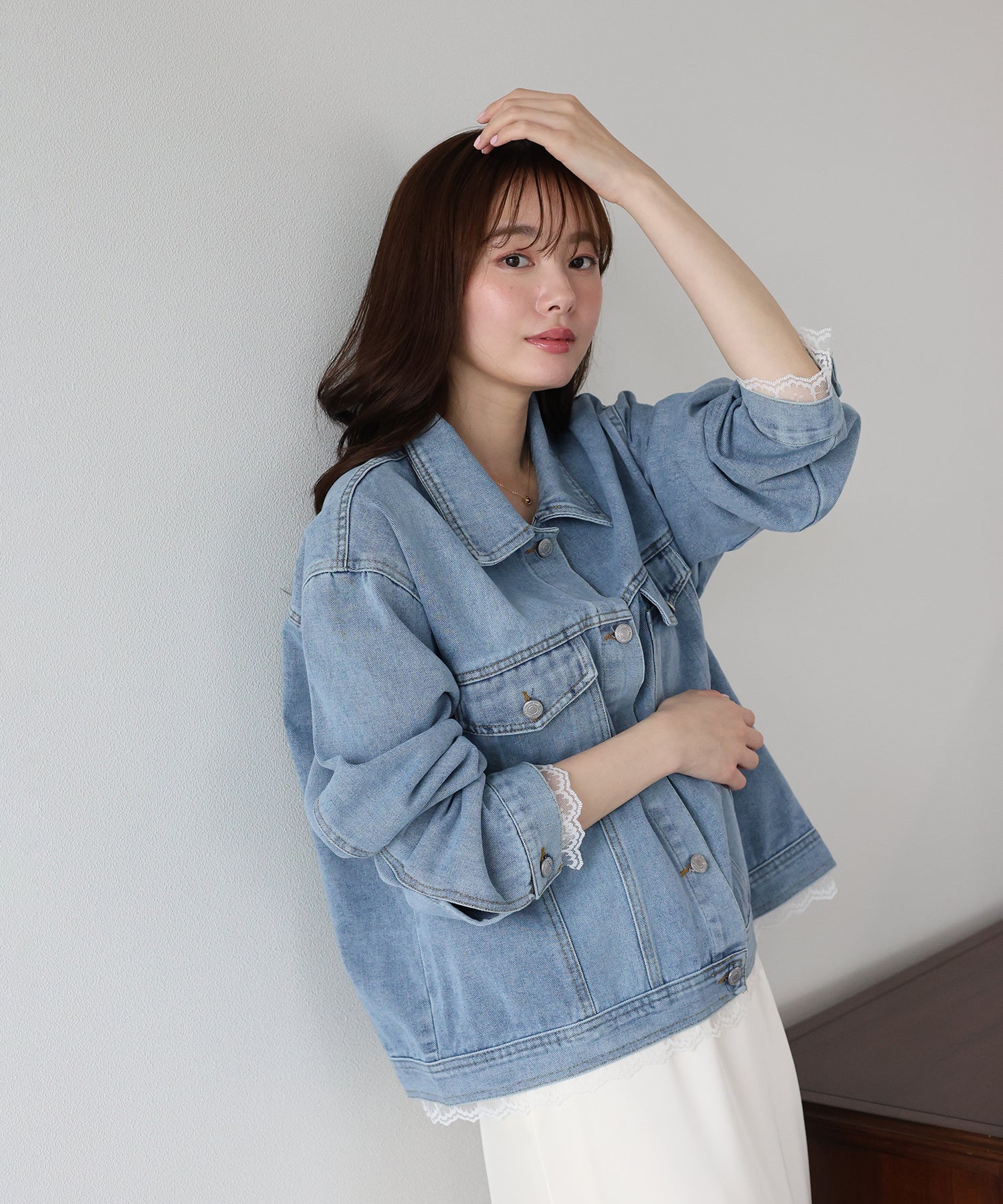 袖口と裾からさりげなく覗くレースが、カジュアルなデニムスタイルに女性らしいフェミニンな甘さをプラスします。