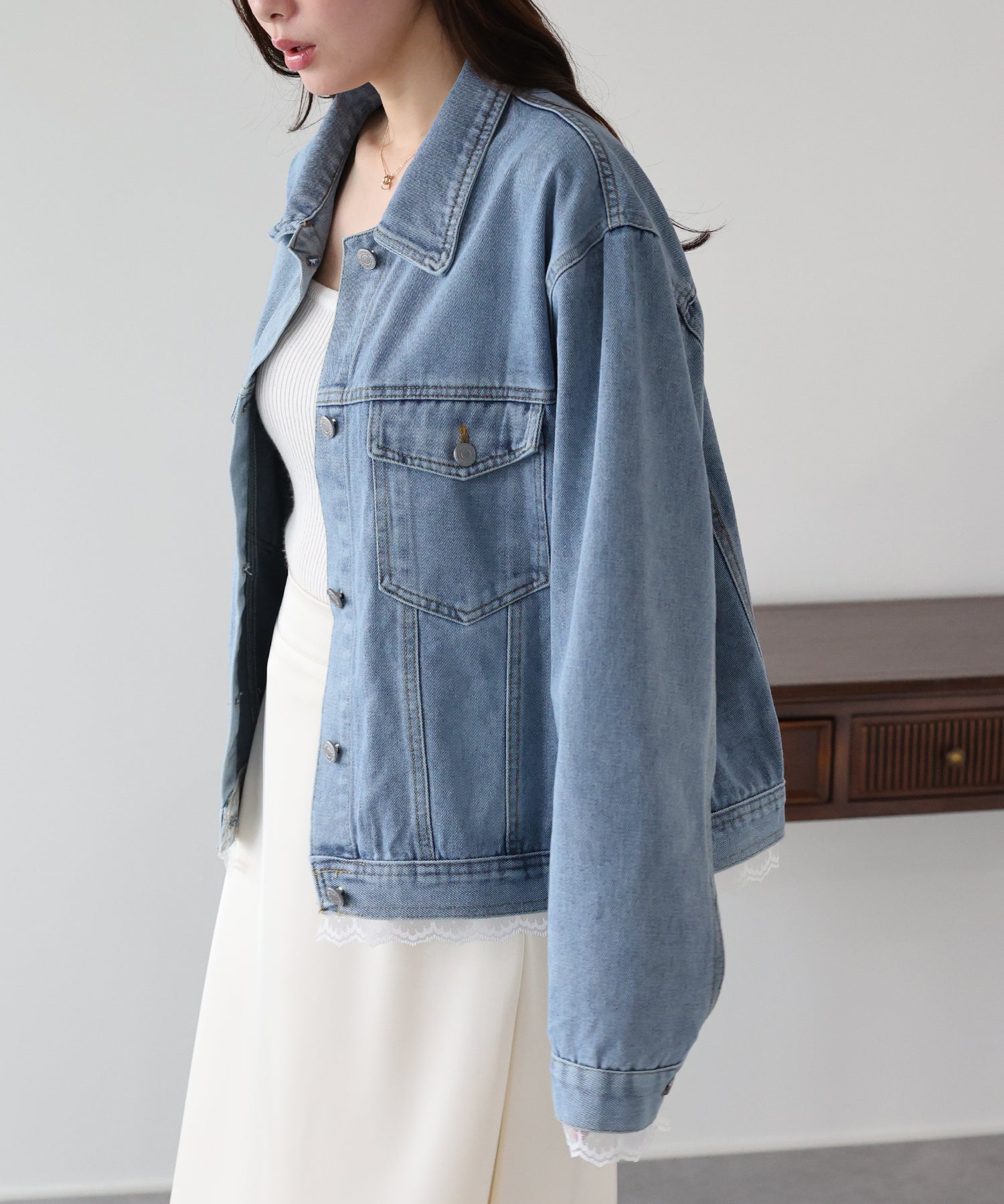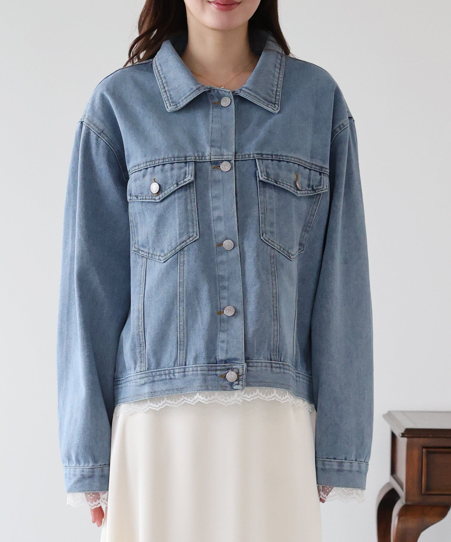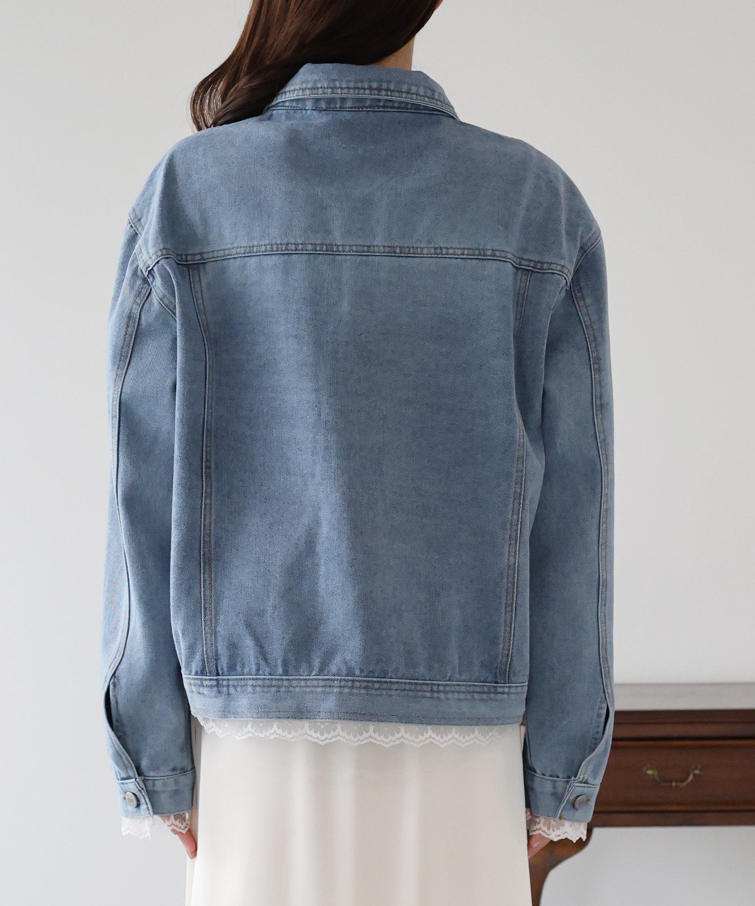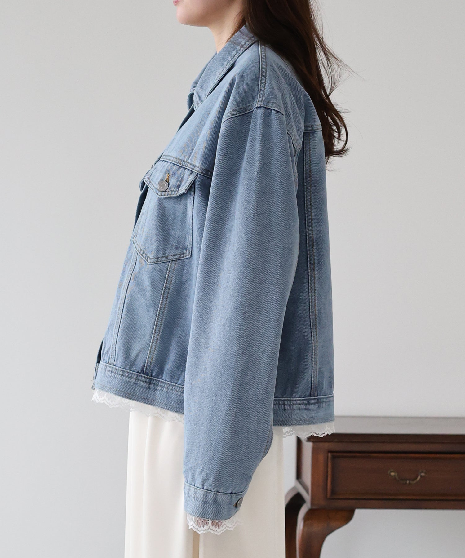 袖口と裾からさりげなく覗くレースが、カジュアルなデニムスタイルに女性らしいフェミニンな甘さをプラスします。