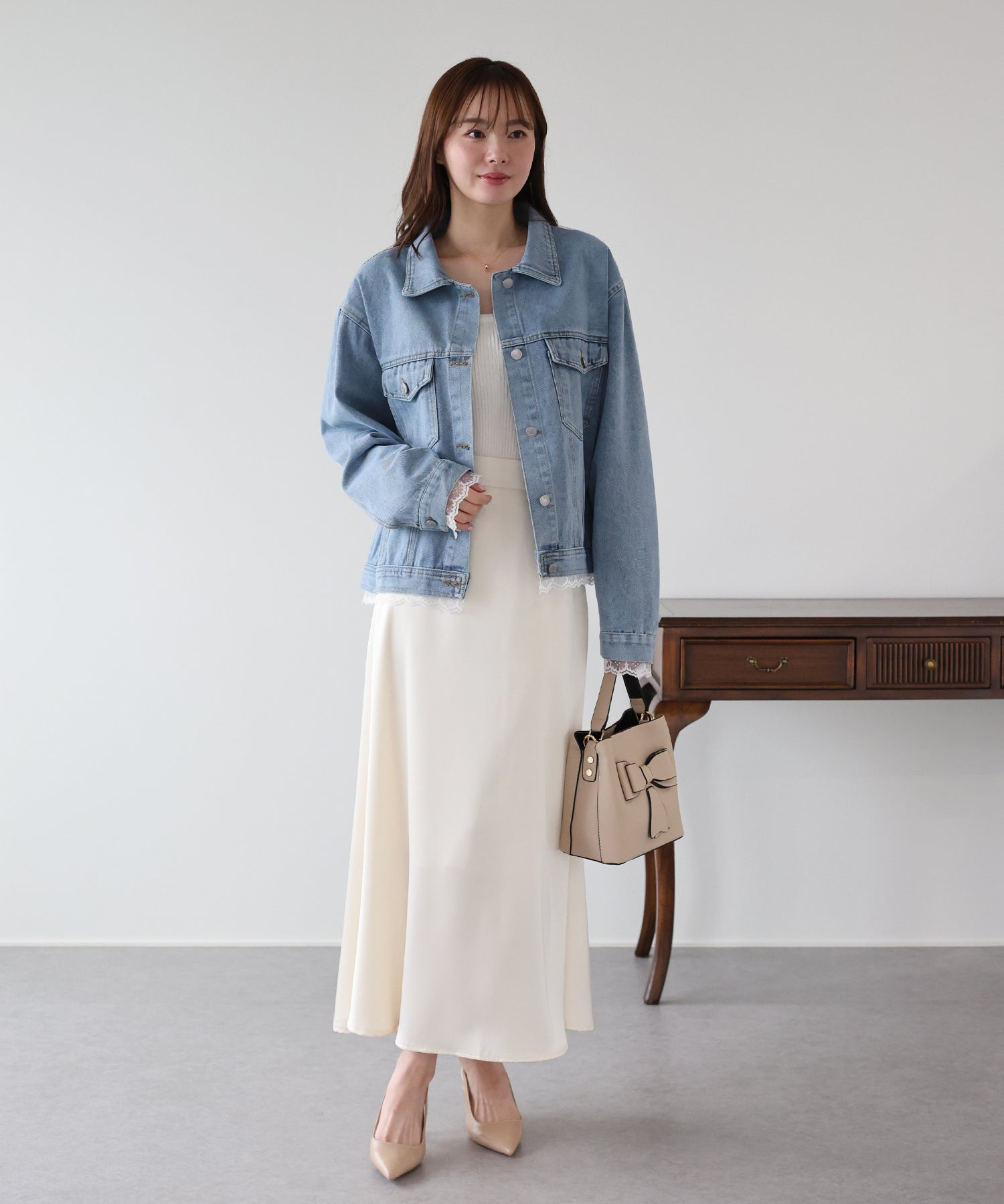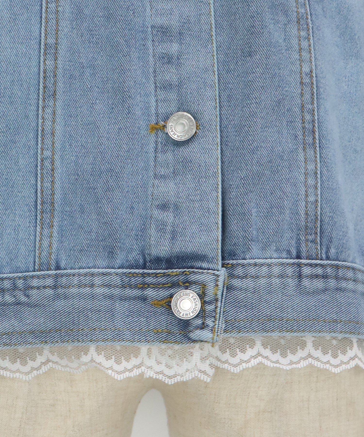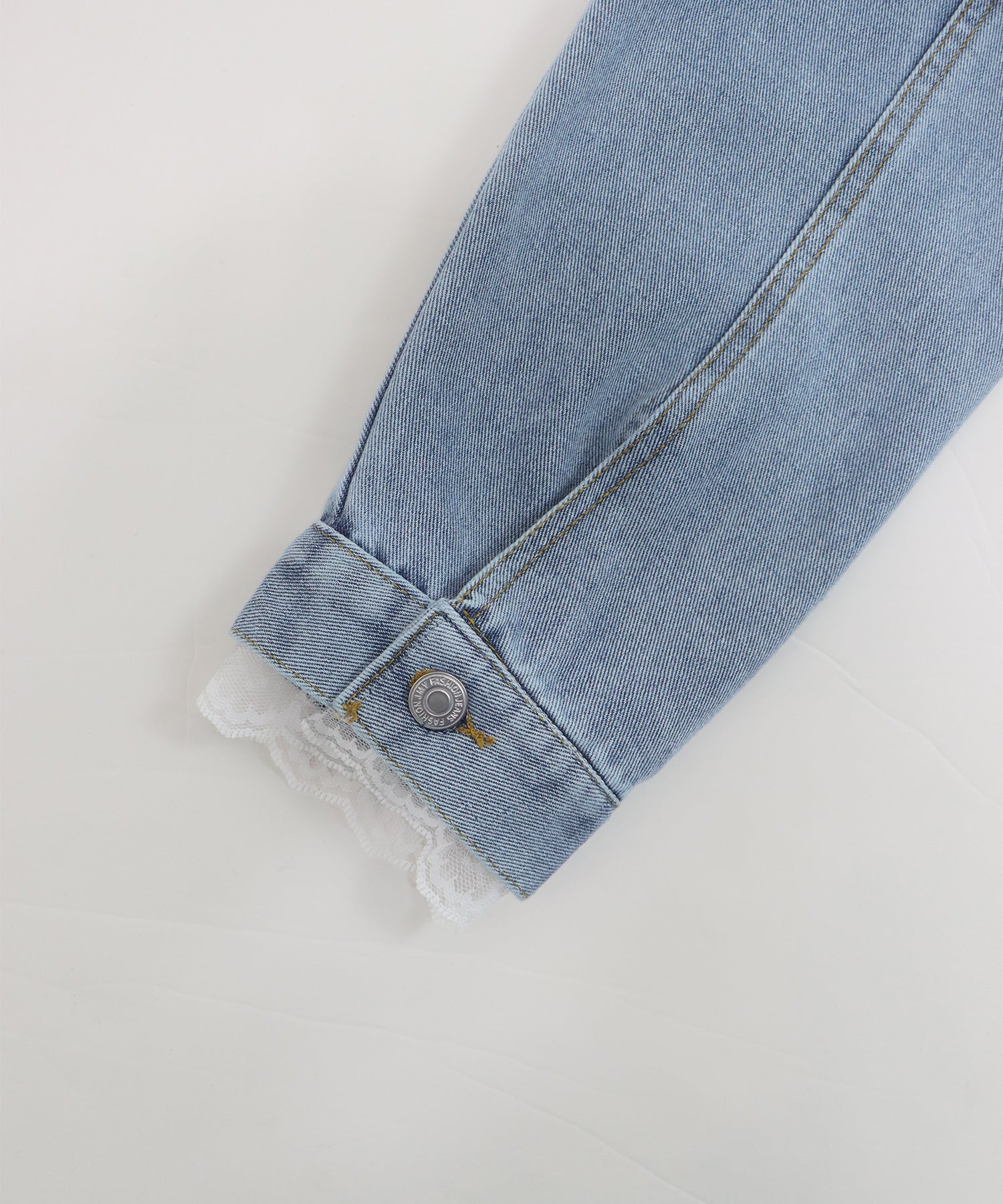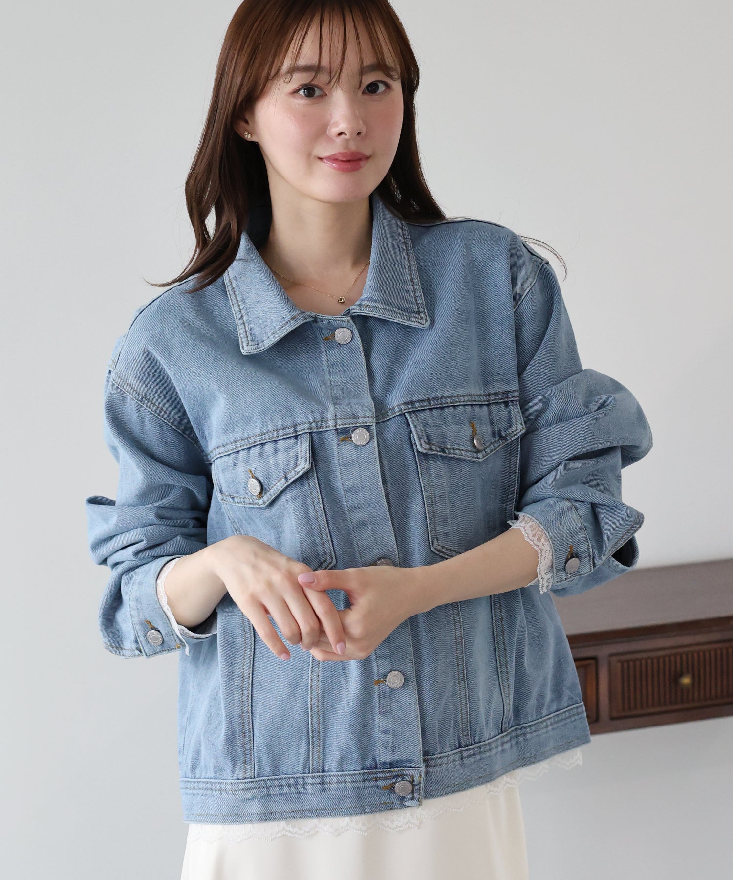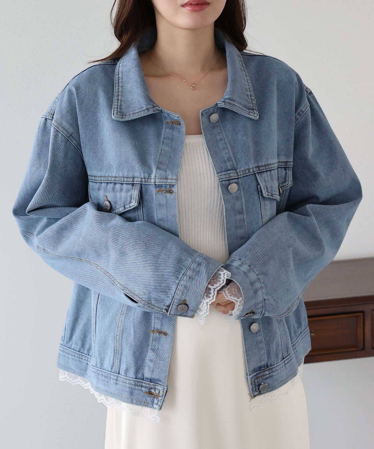 袖口と裾からさりげなく覗くレースが、カジュアルなデニムスタイルに女性らしいフェミニンな甘さをプラスします。