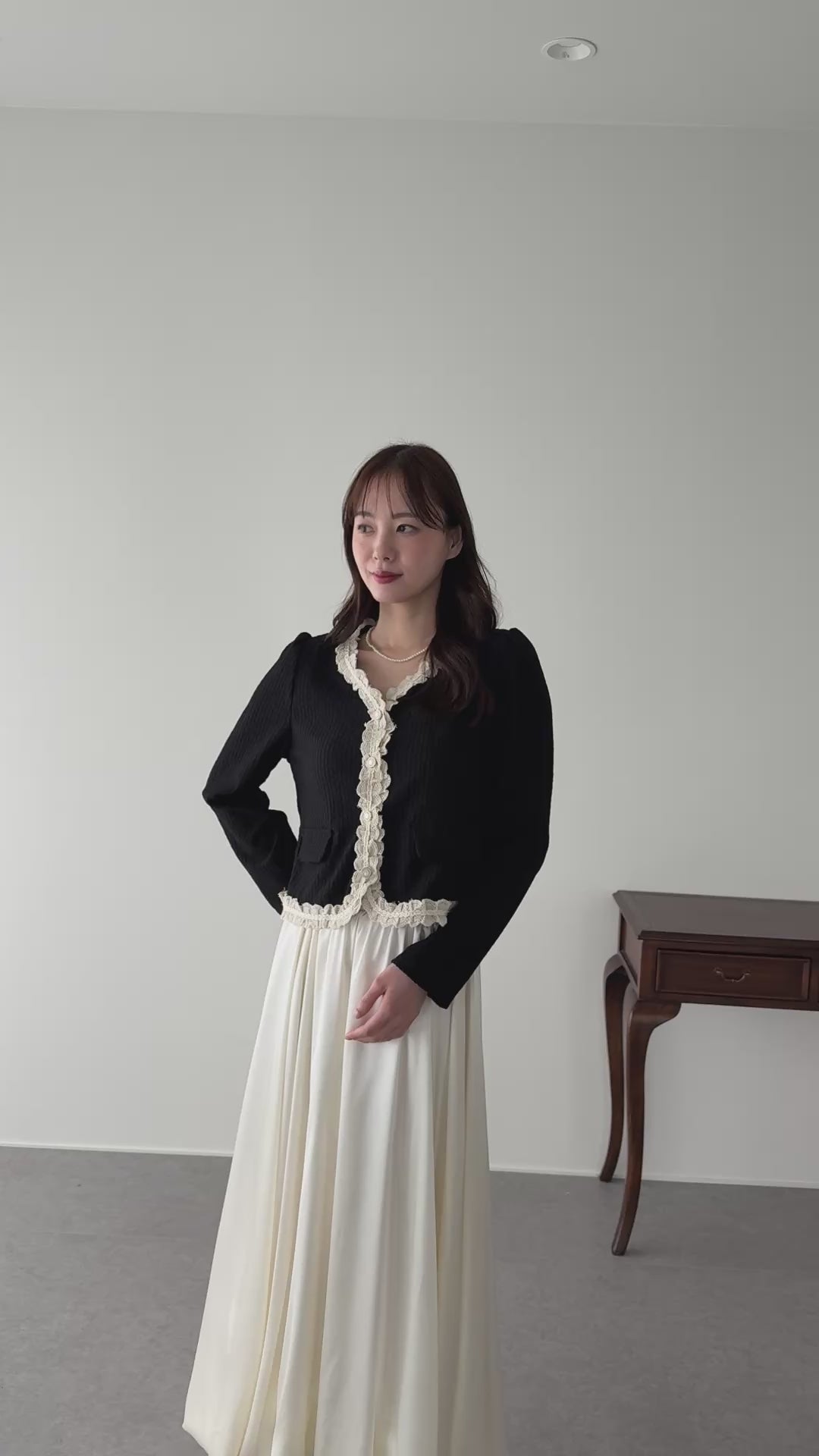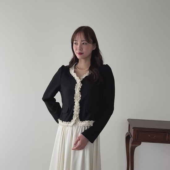 ネックから前立て、裾にあしらわれたレースのフリルが、