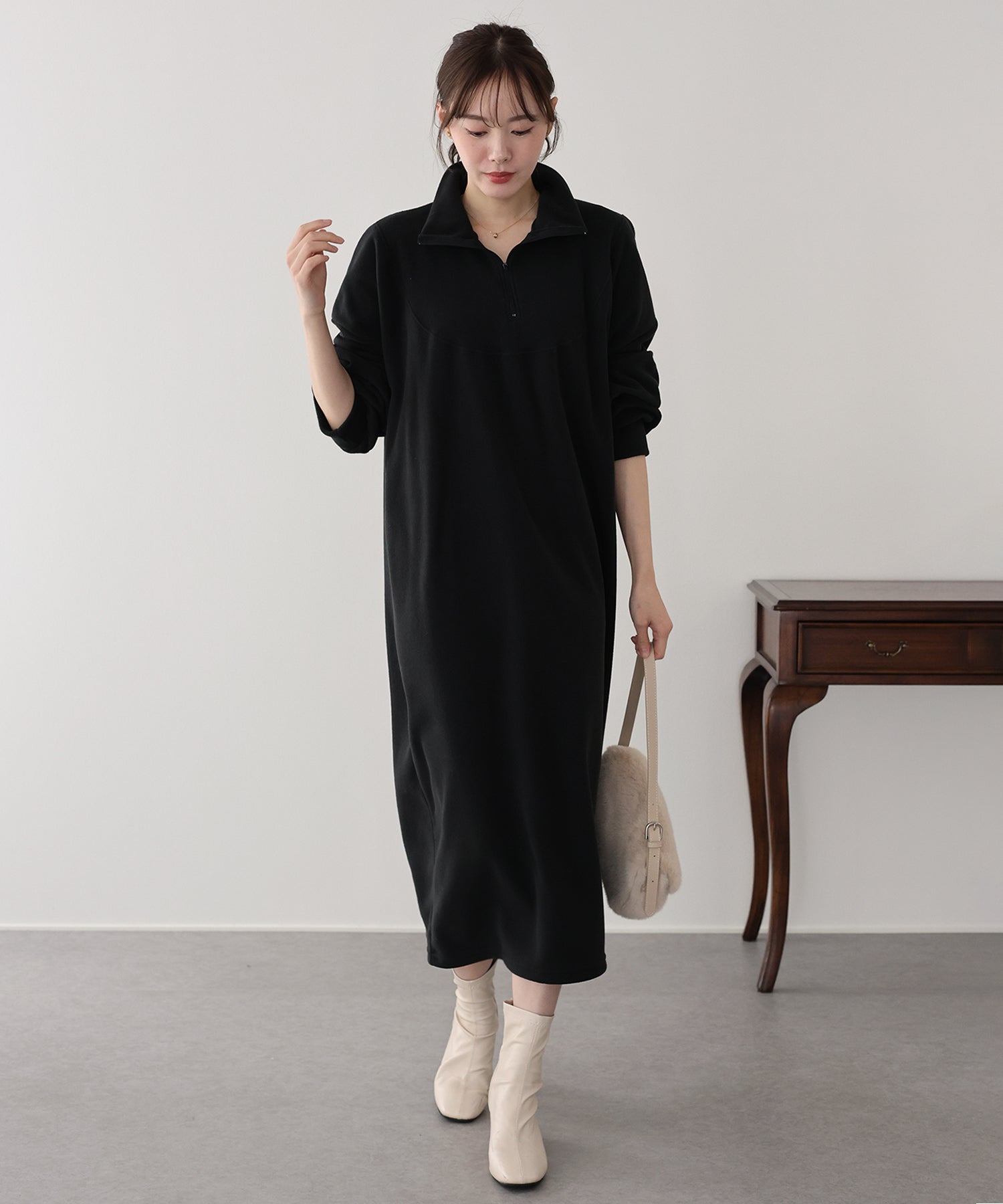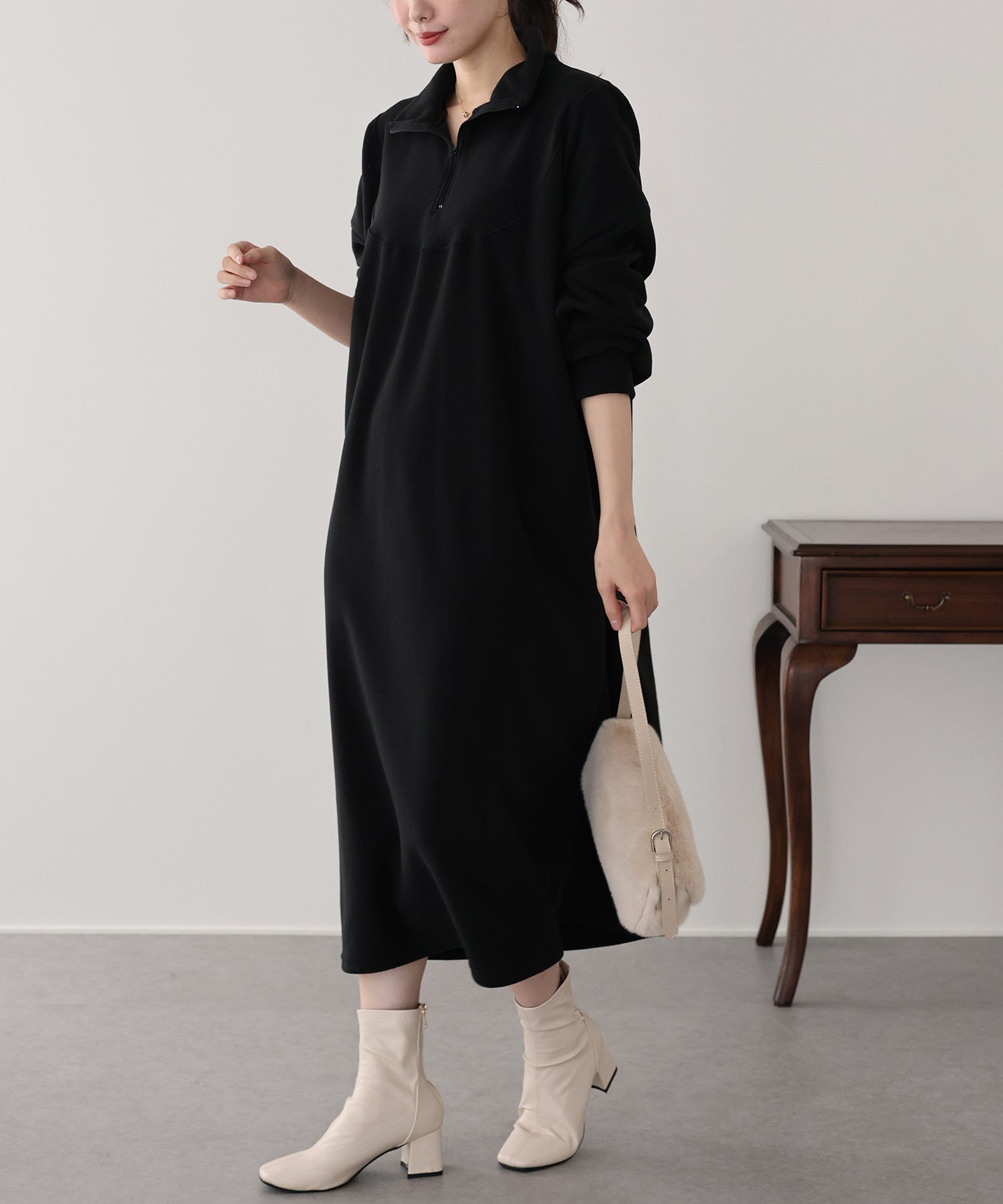 ふわふわのフリース素材が、寒い季節に大活躍間違いなしのハーフジップワンピース