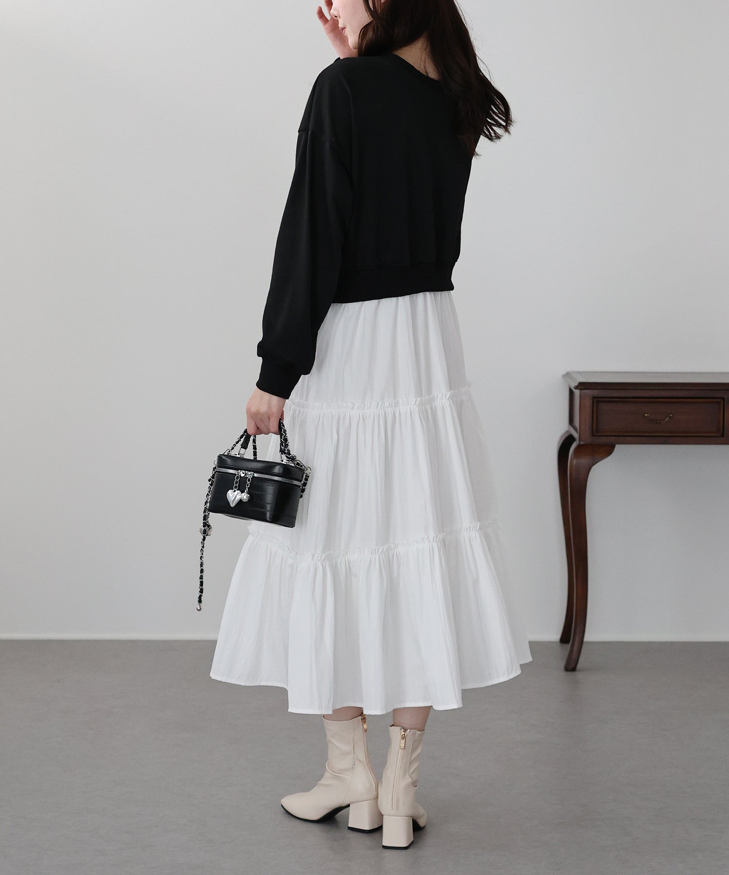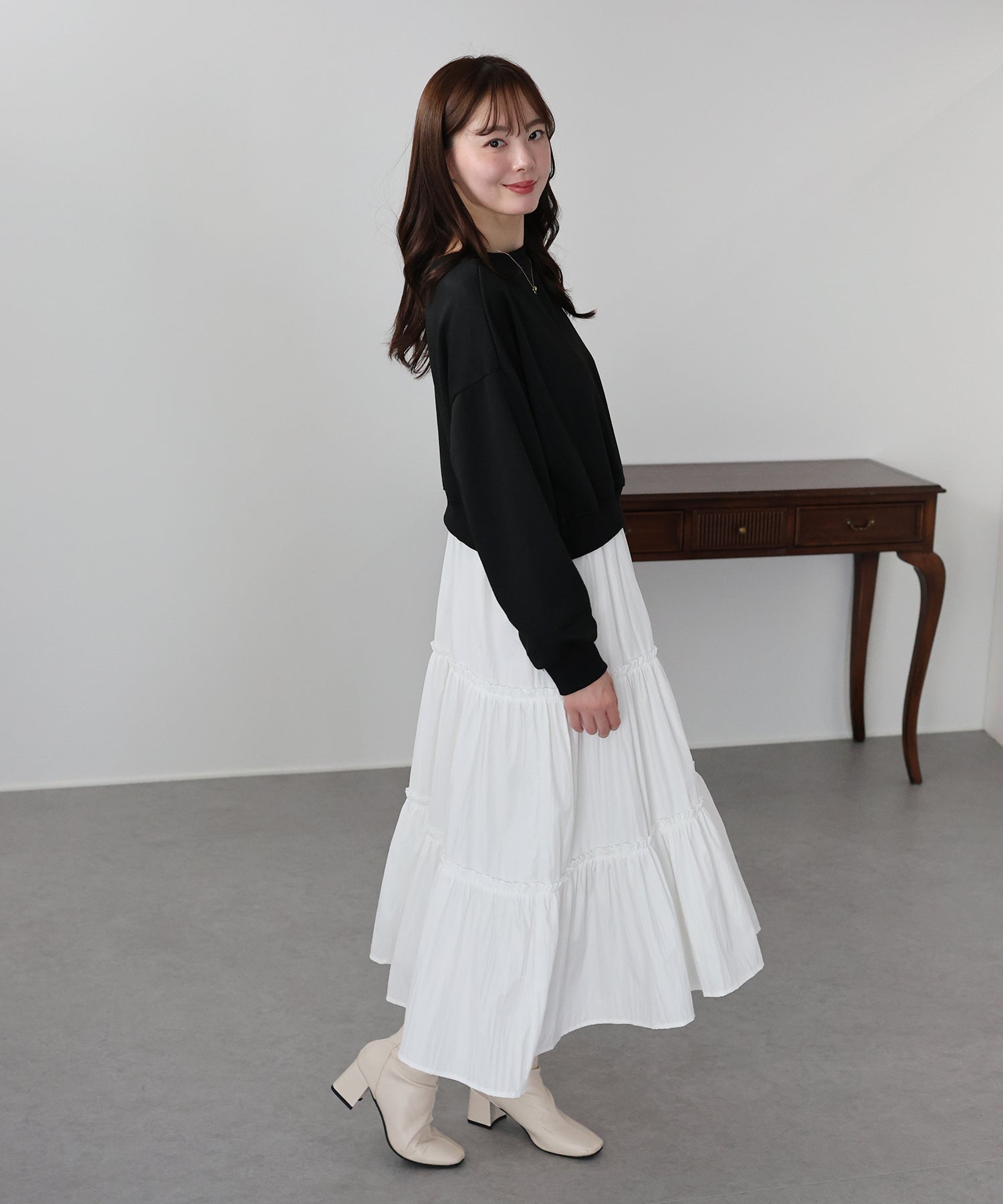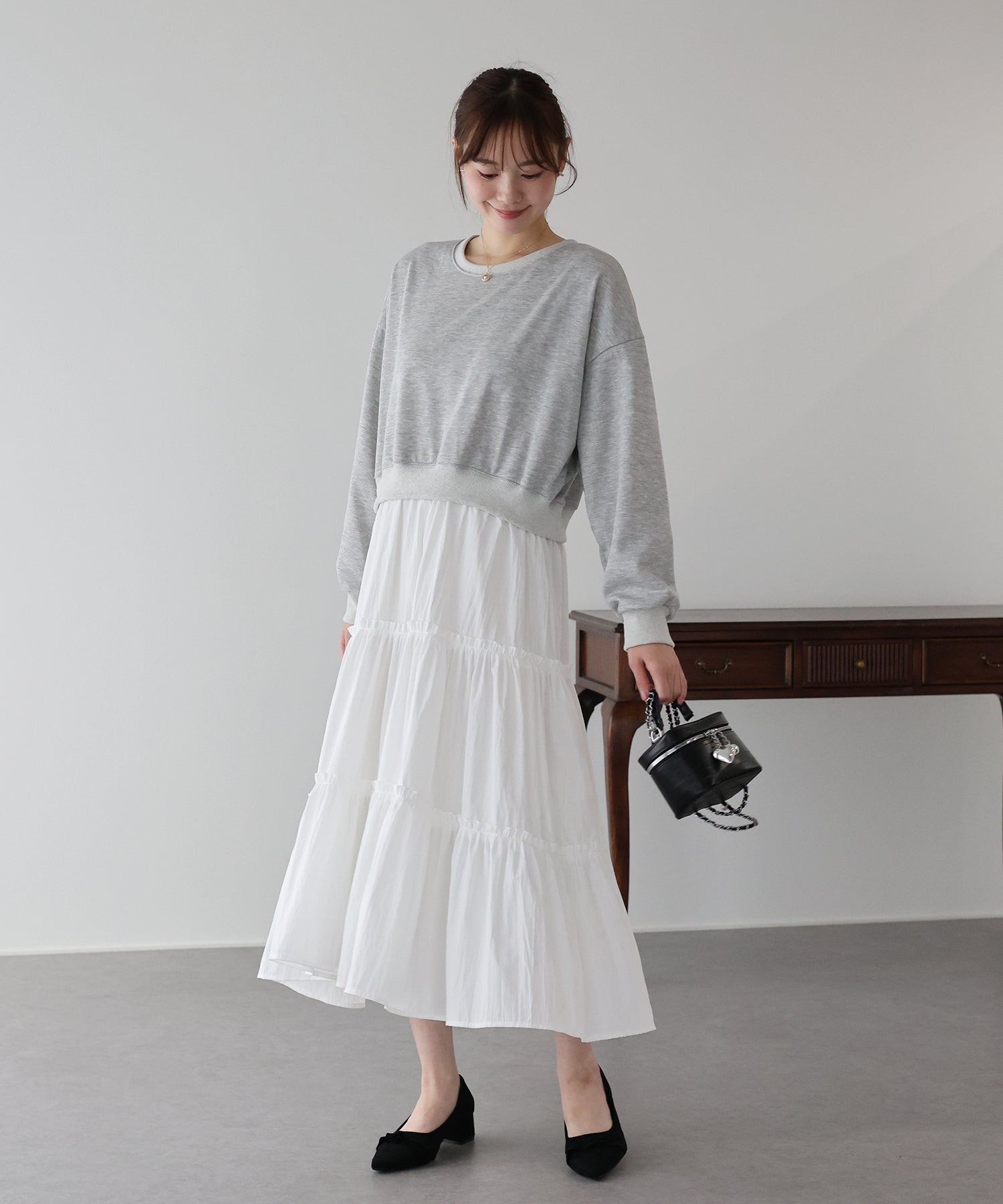 ふんわりとしたティアードスカートをドッキングしたトレンド感のあるワンピース。