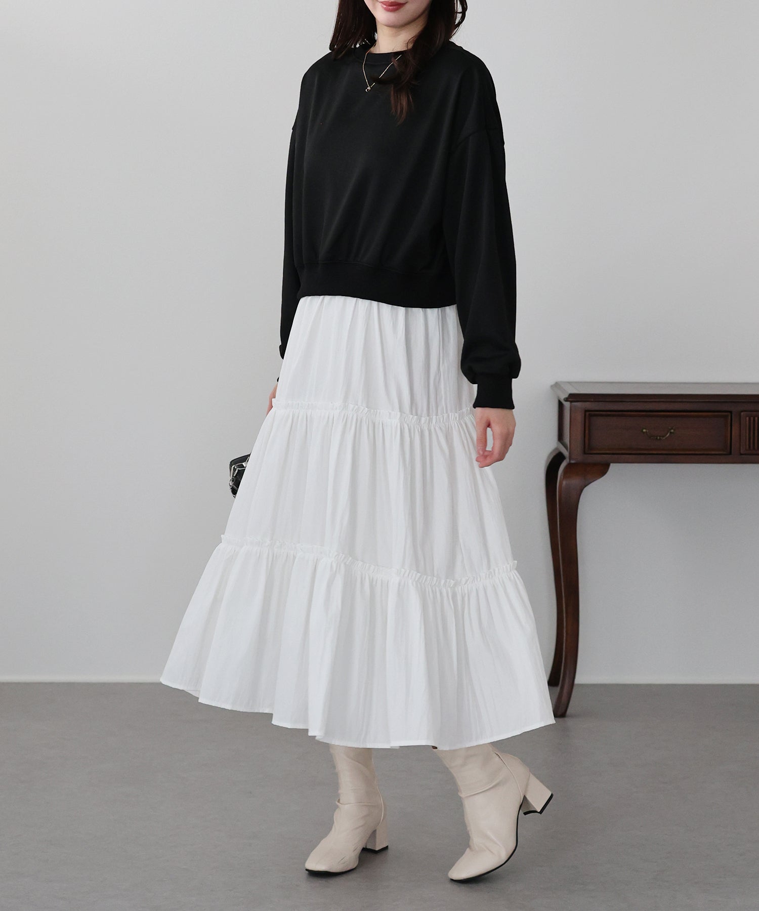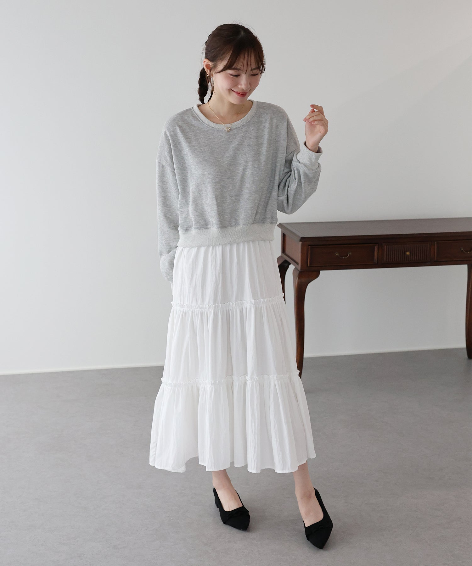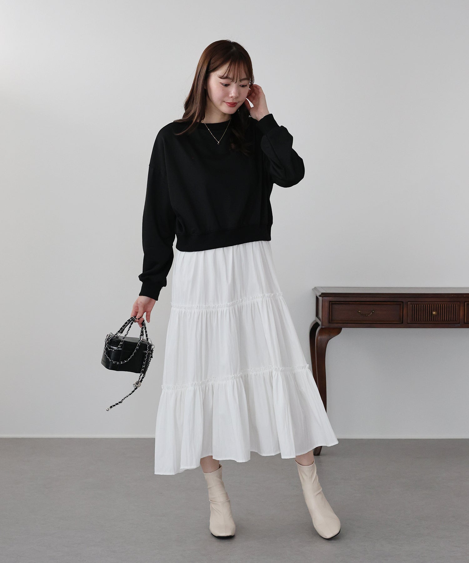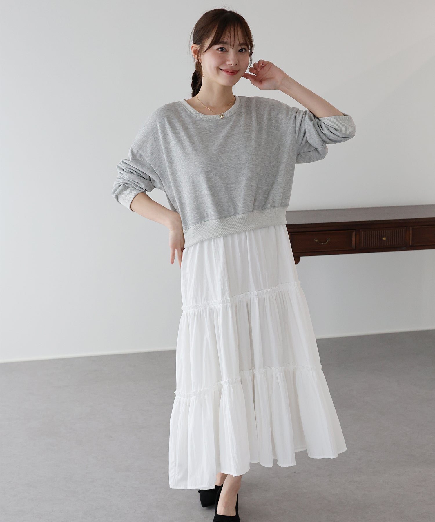 ふんわりとしたティアードスカートをドッキングしたトレンド感のあるワンピース。