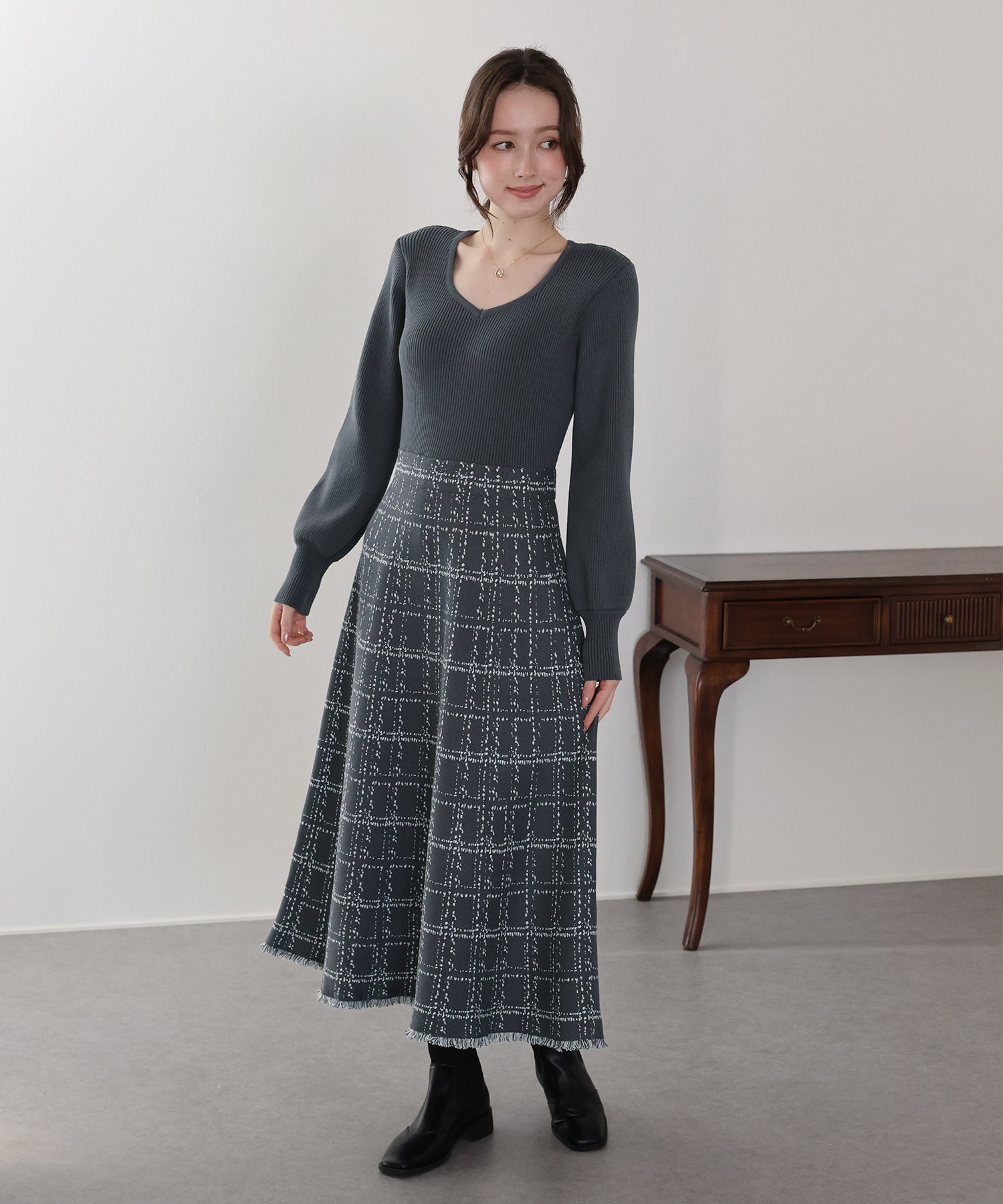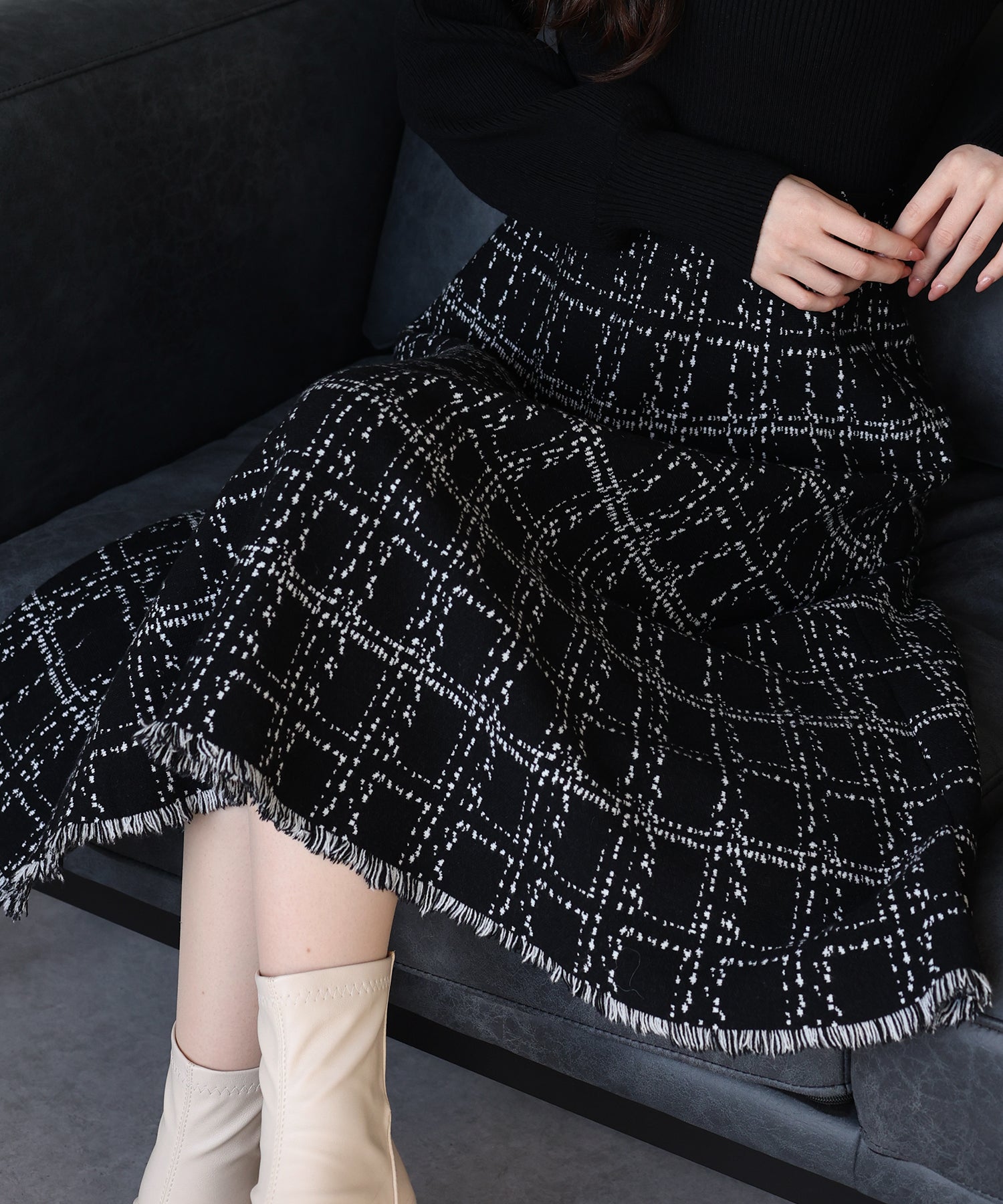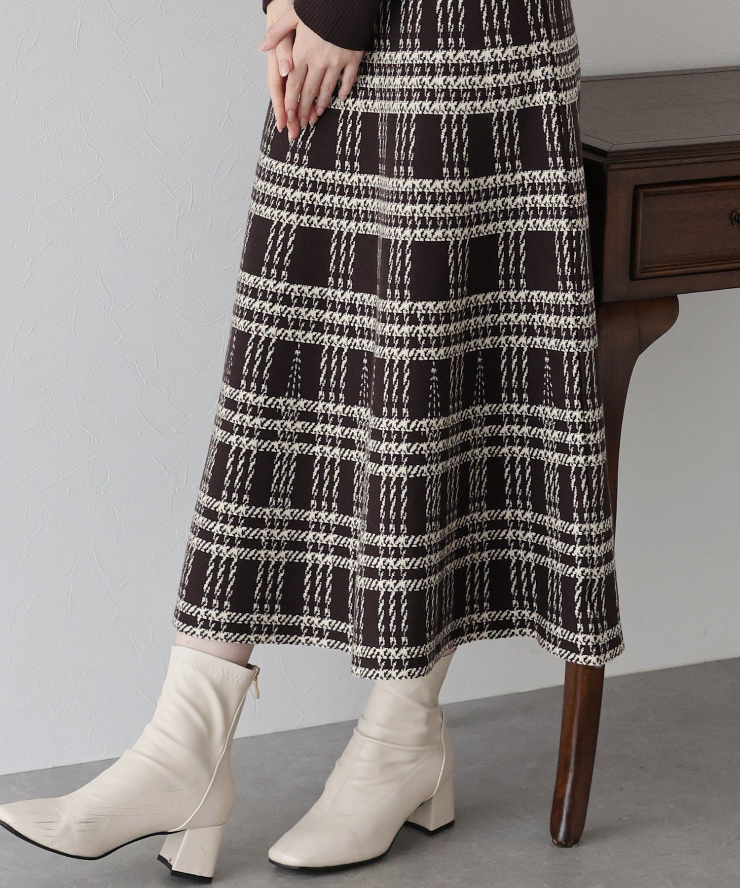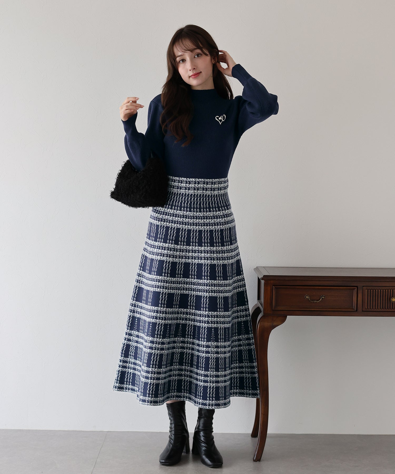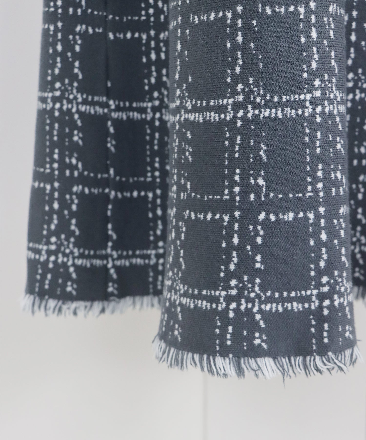 スカート部分にはスタイル良く見えるように拘った、裾に向かって柄が細かくなるチェック柄を編み立てました。