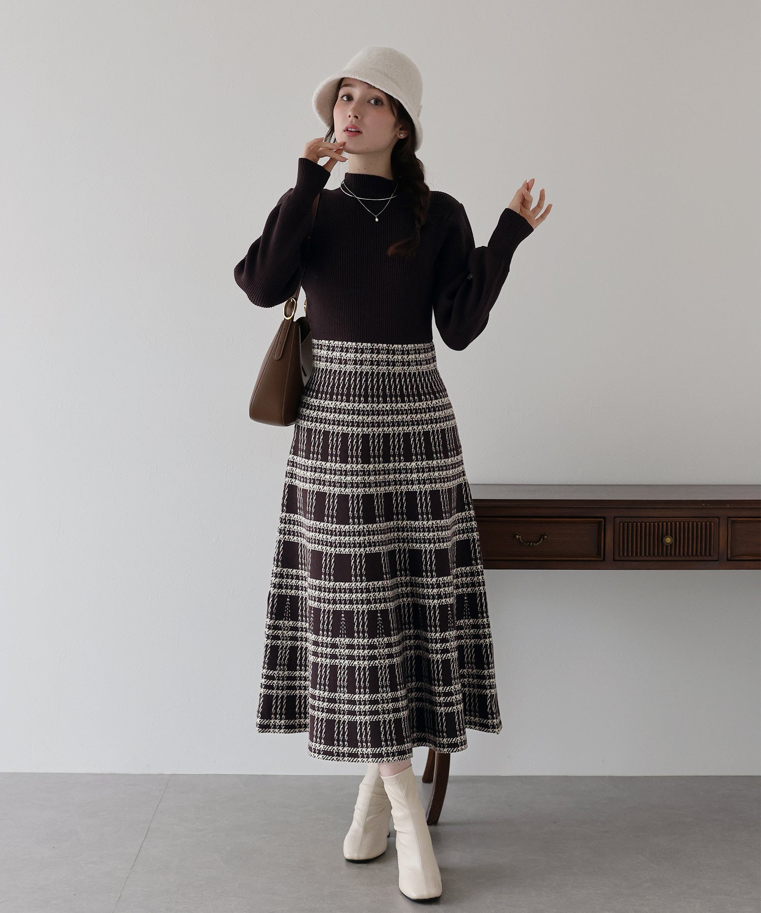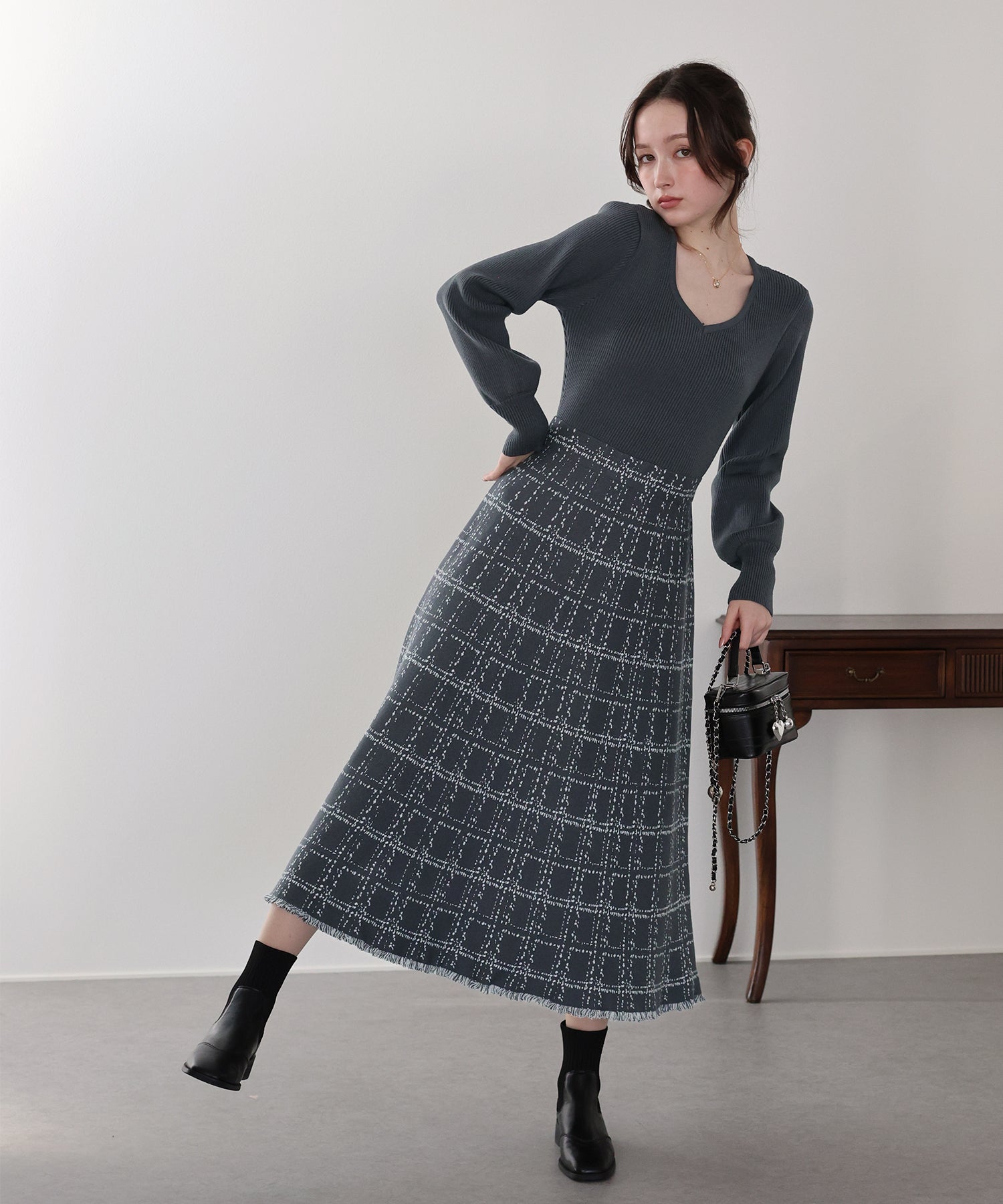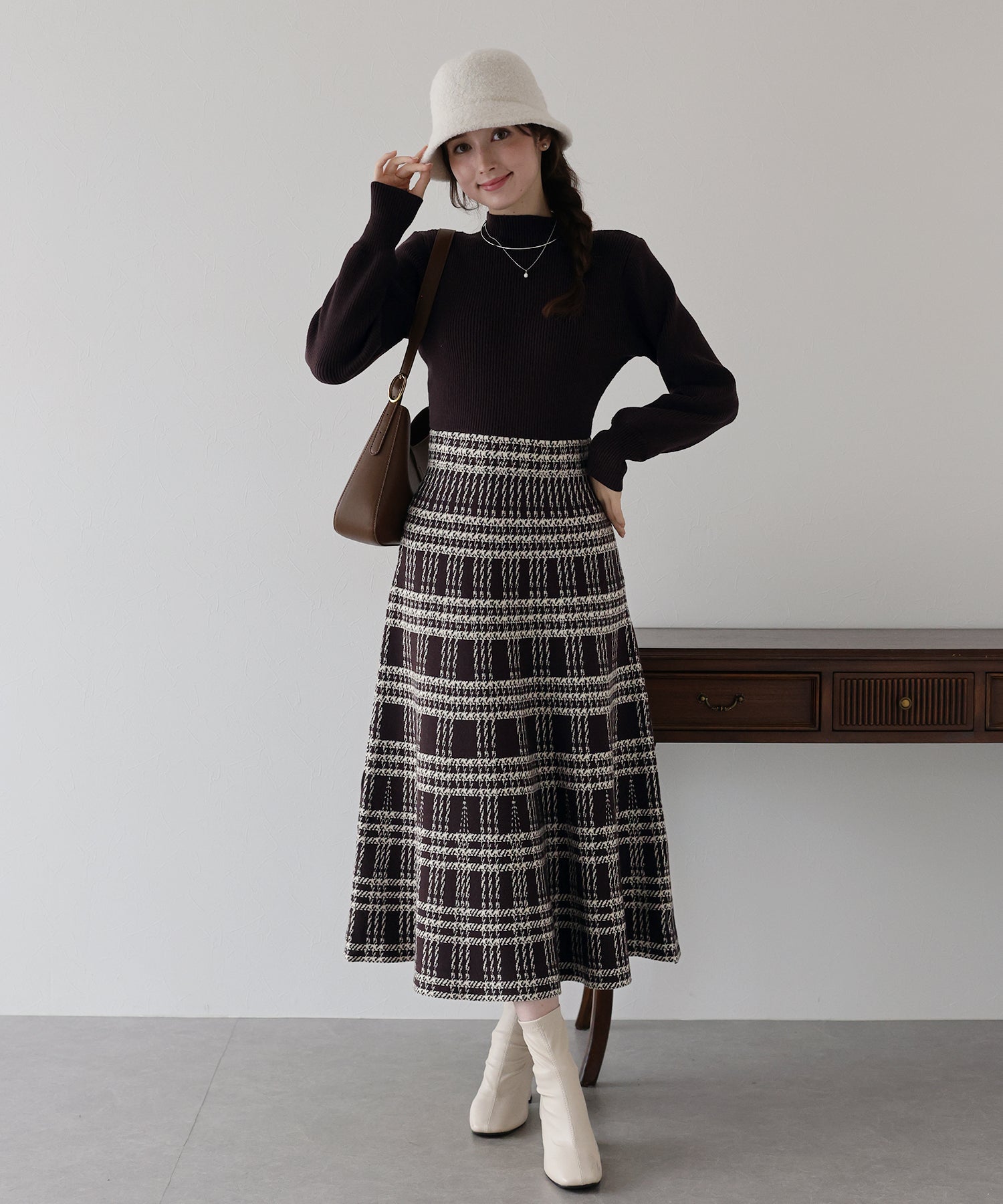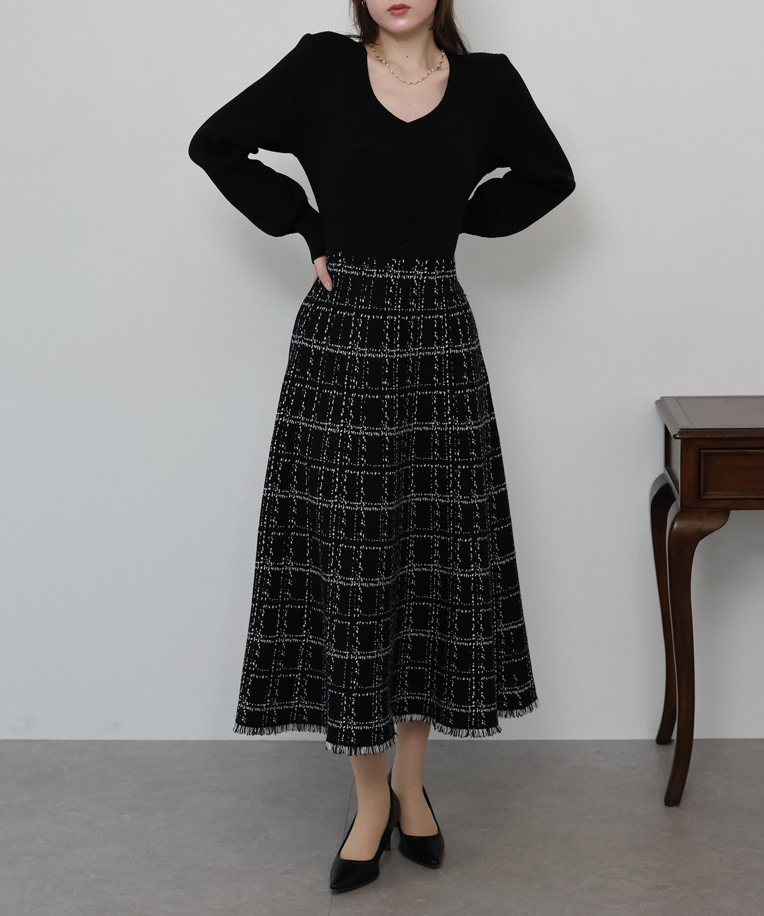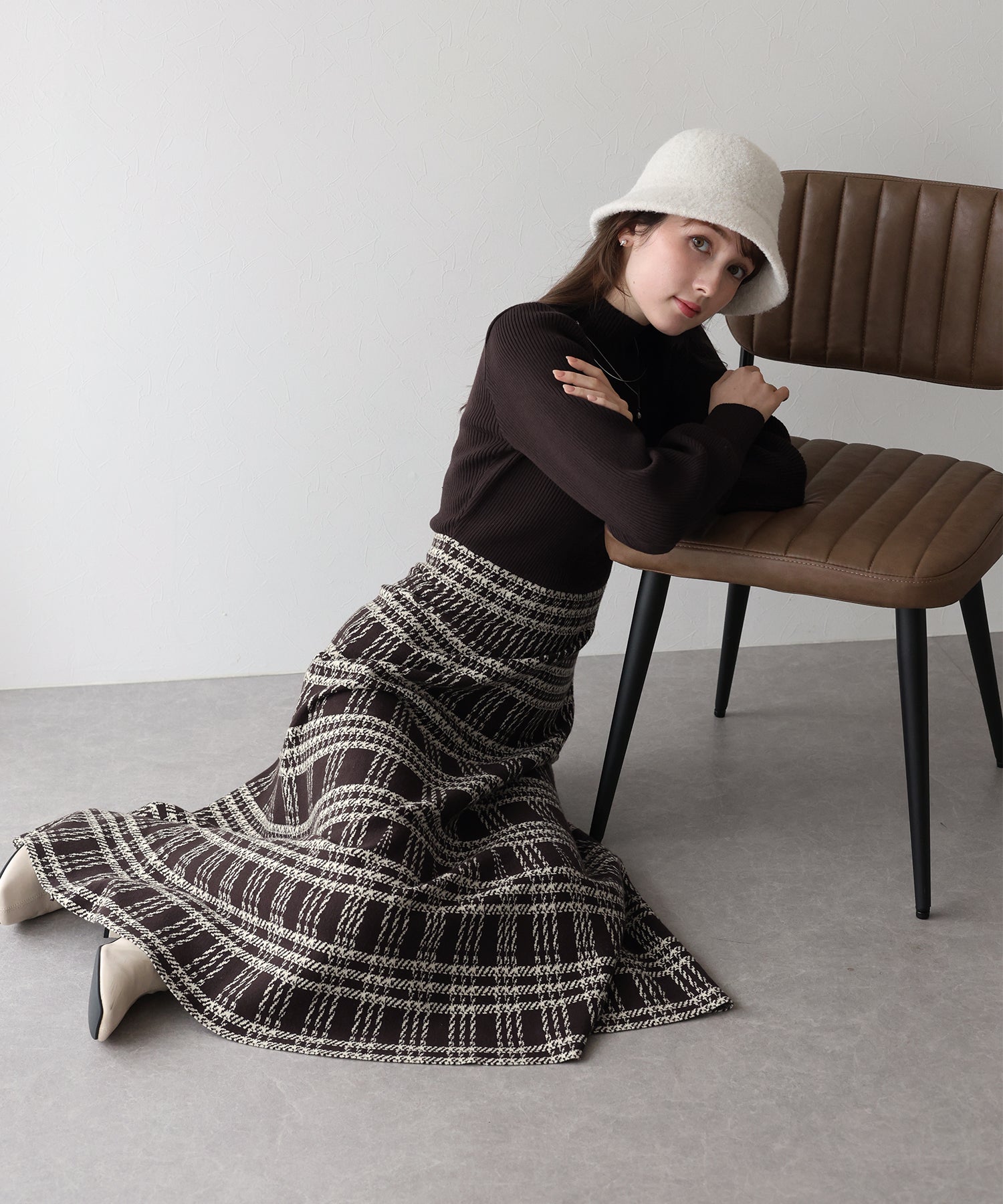 スカート部分にはスタイル良く見えるように拘った、裾に向かって柄が細かくなるチェック柄を編み立てました。