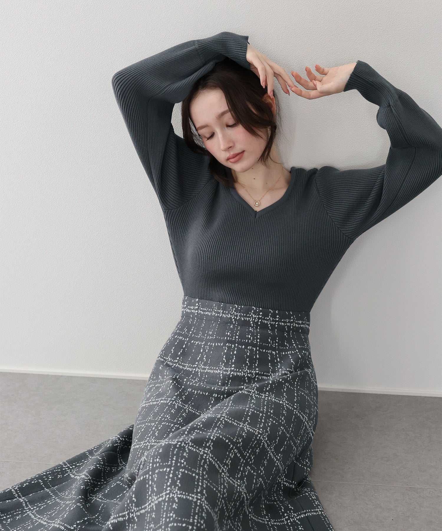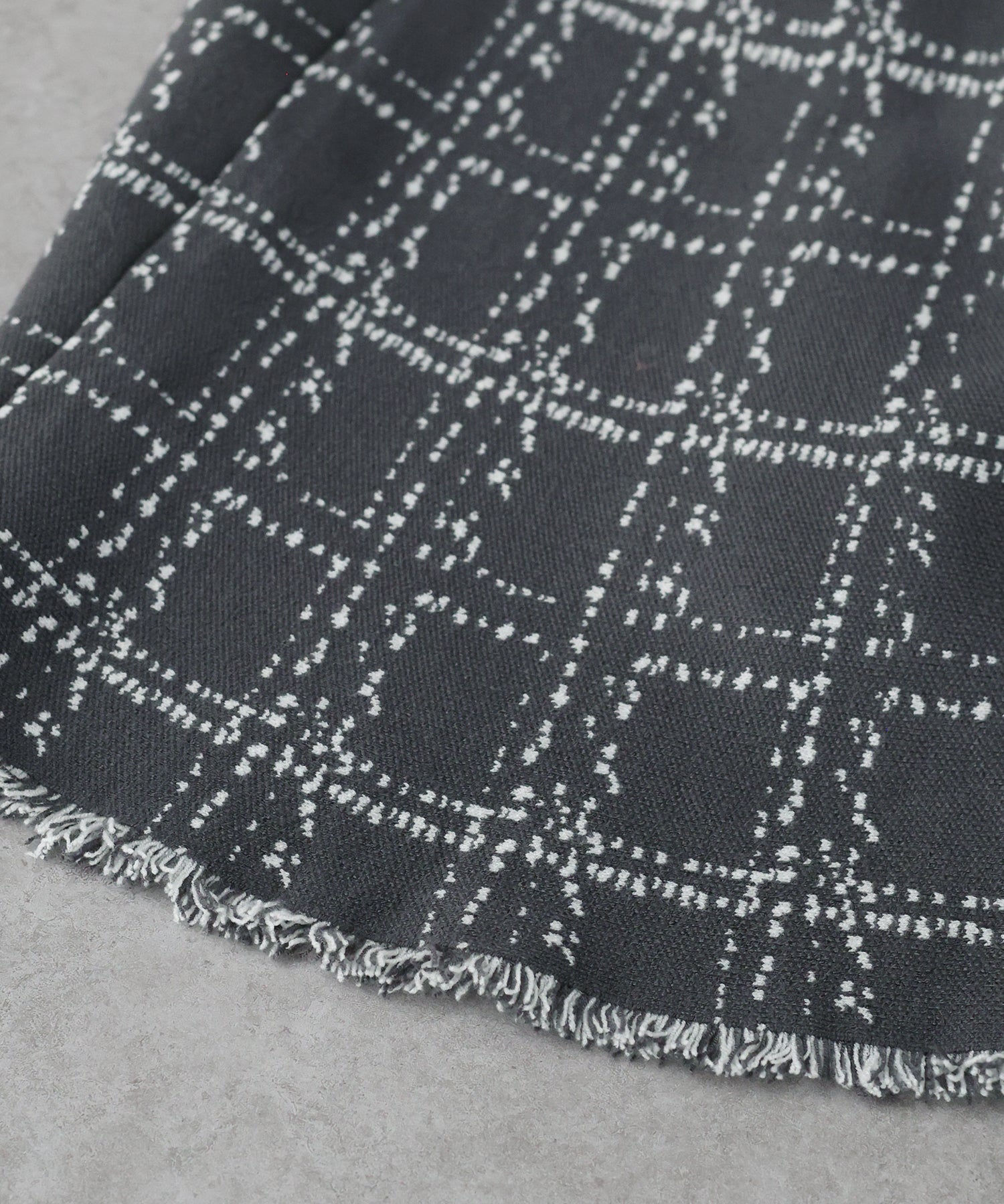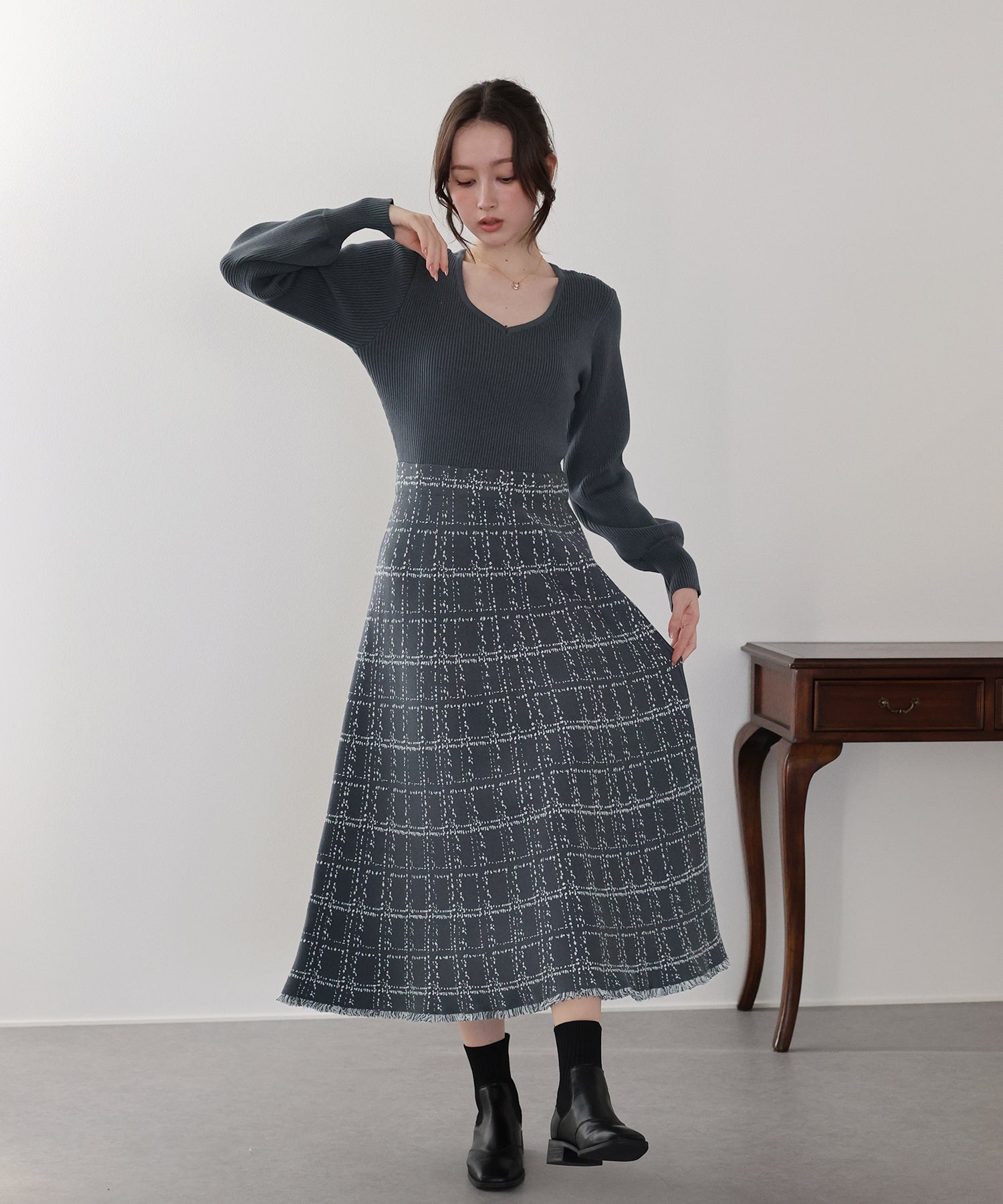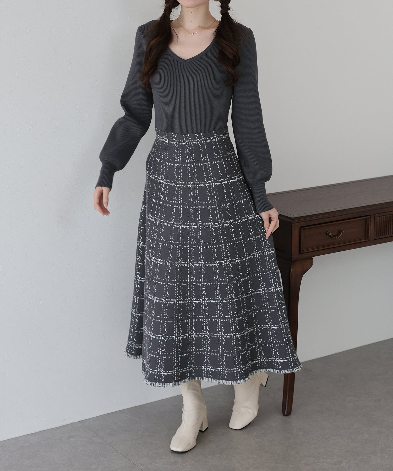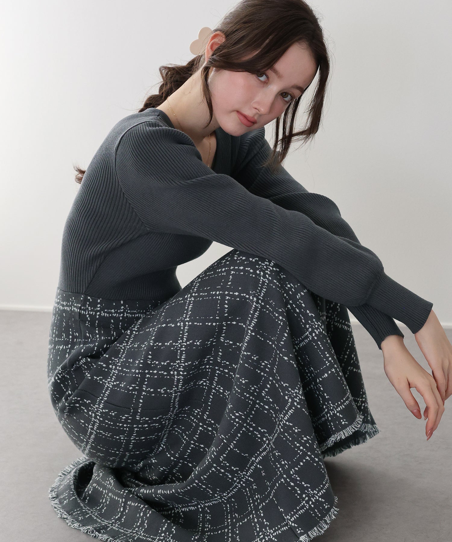 スカート部分にはスタイル良く見えるように拘った、裾に向かって柄が細かくなるチェック柄を編み立てました。