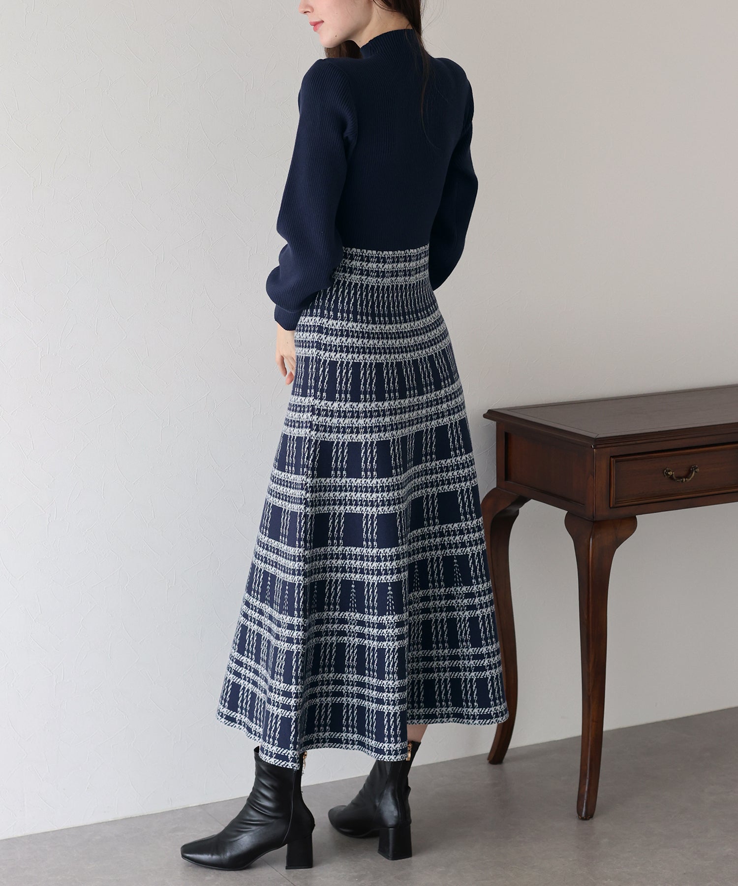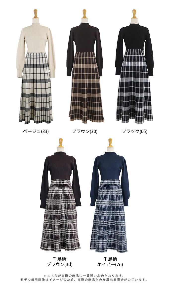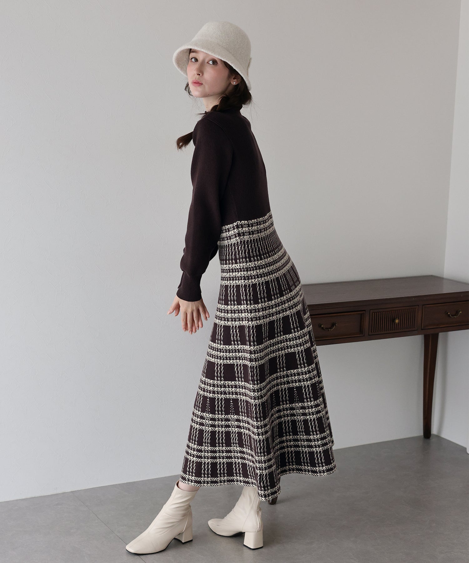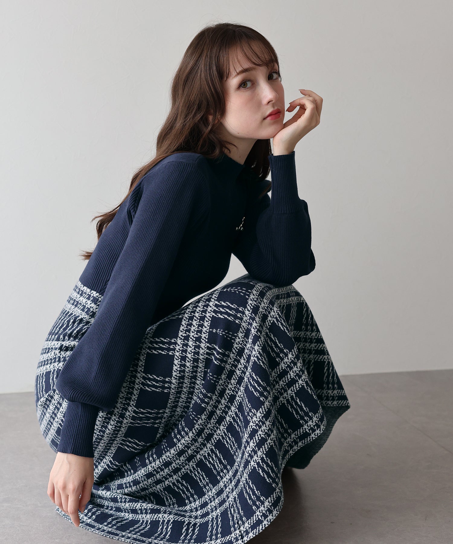 1枚で着映えするボリューム袖ニット×チェック柄スカートのドッキングワンピース。