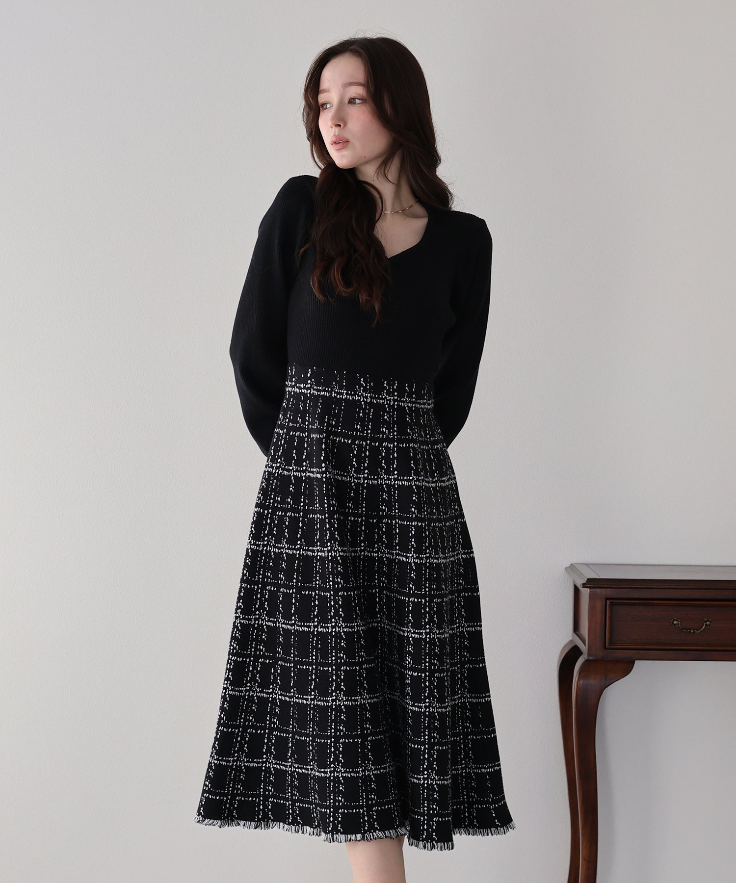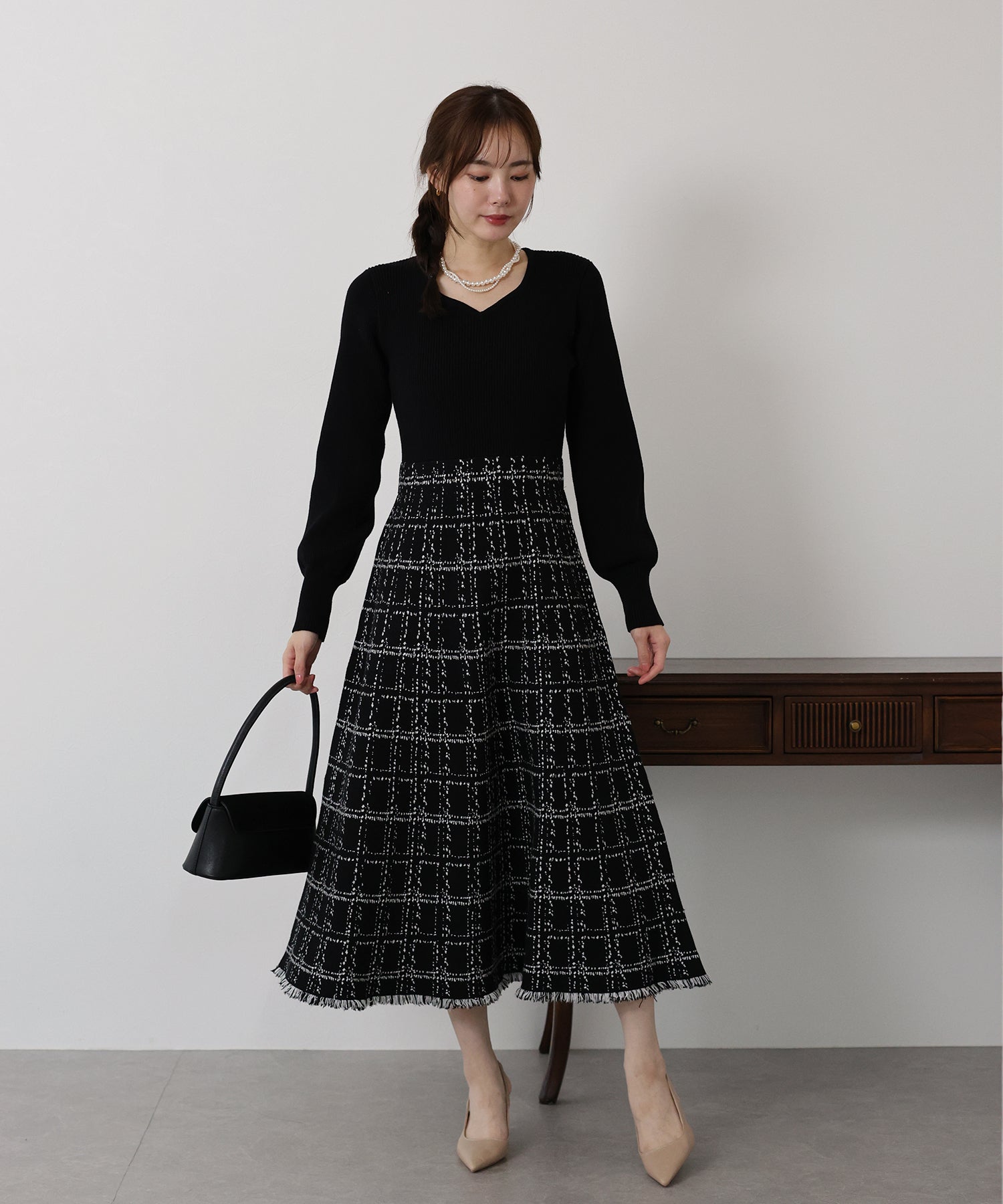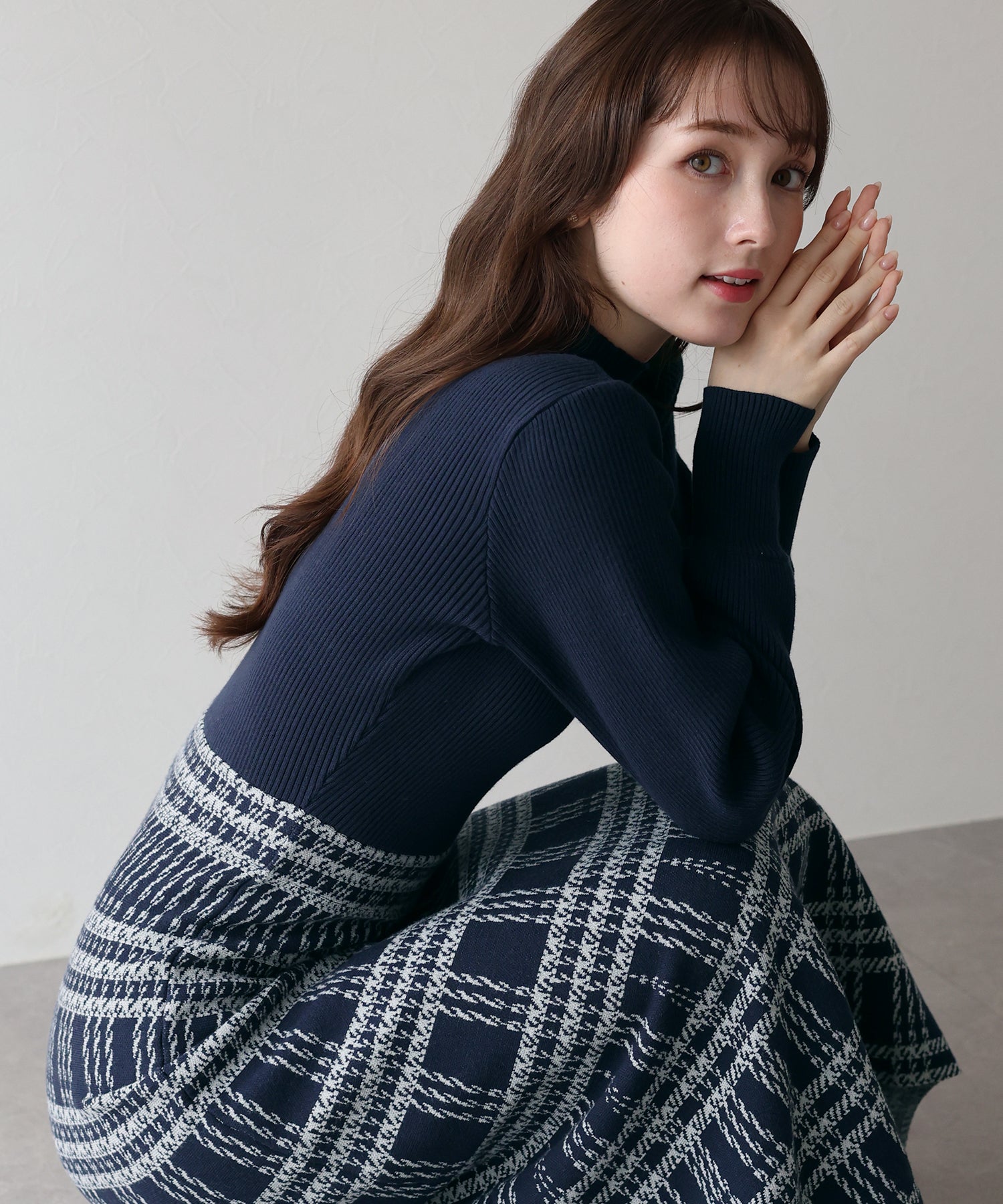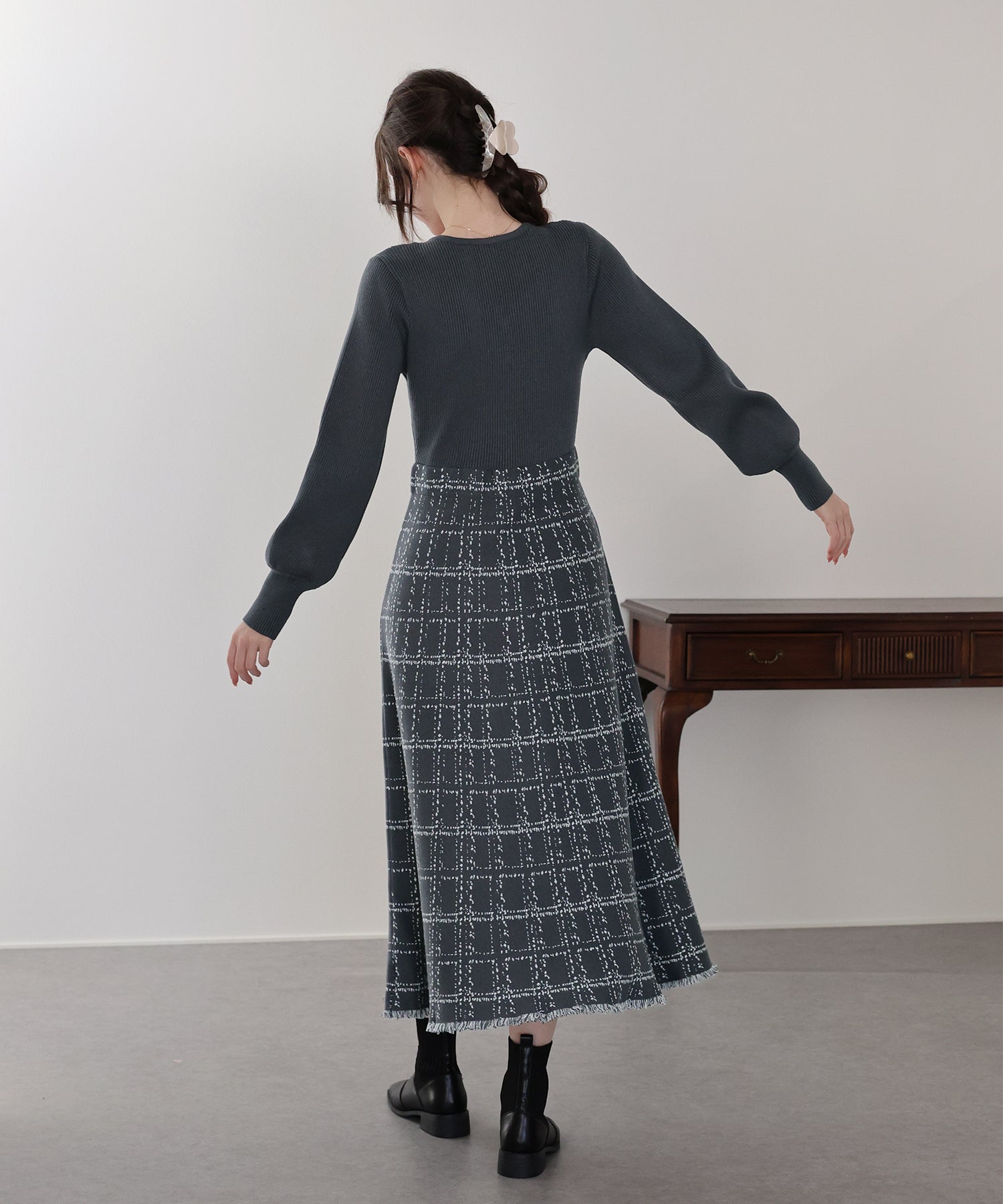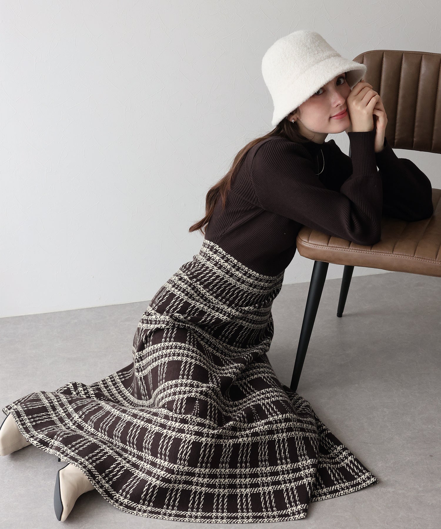 1枚で着映えするボリューム袖ニット×チェック柄スカートのドッキングワンピース。