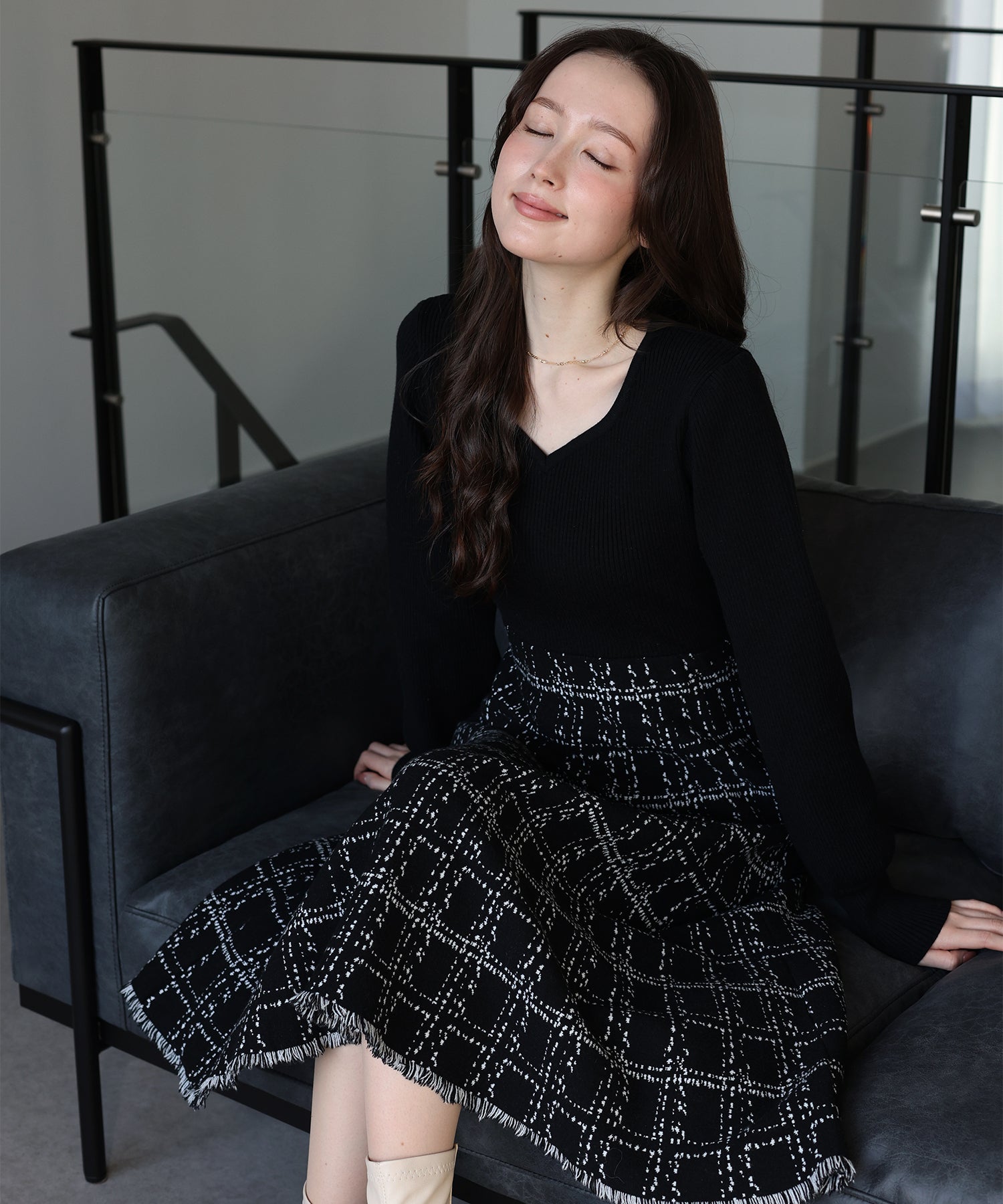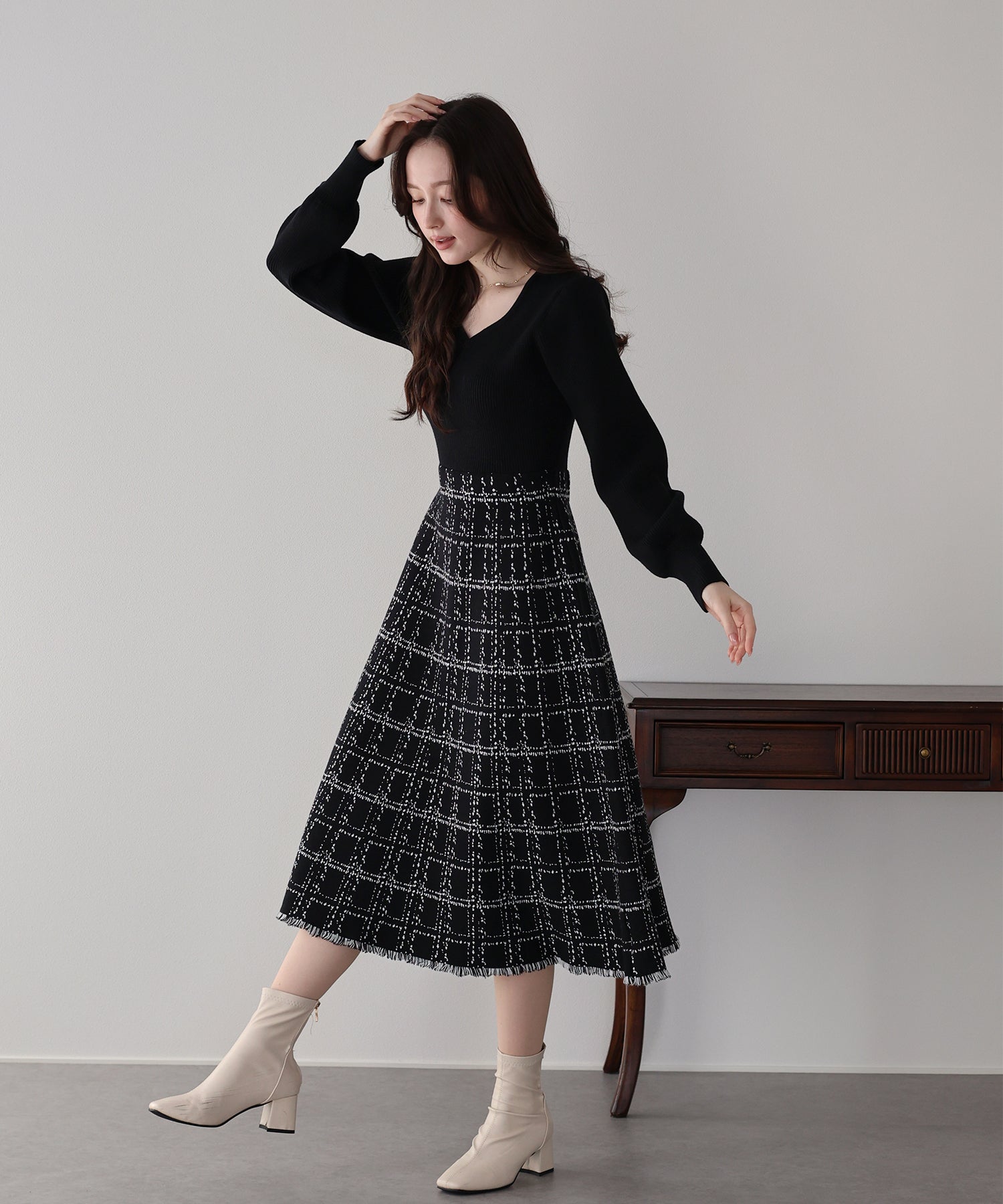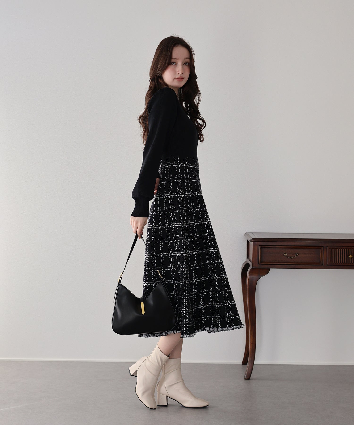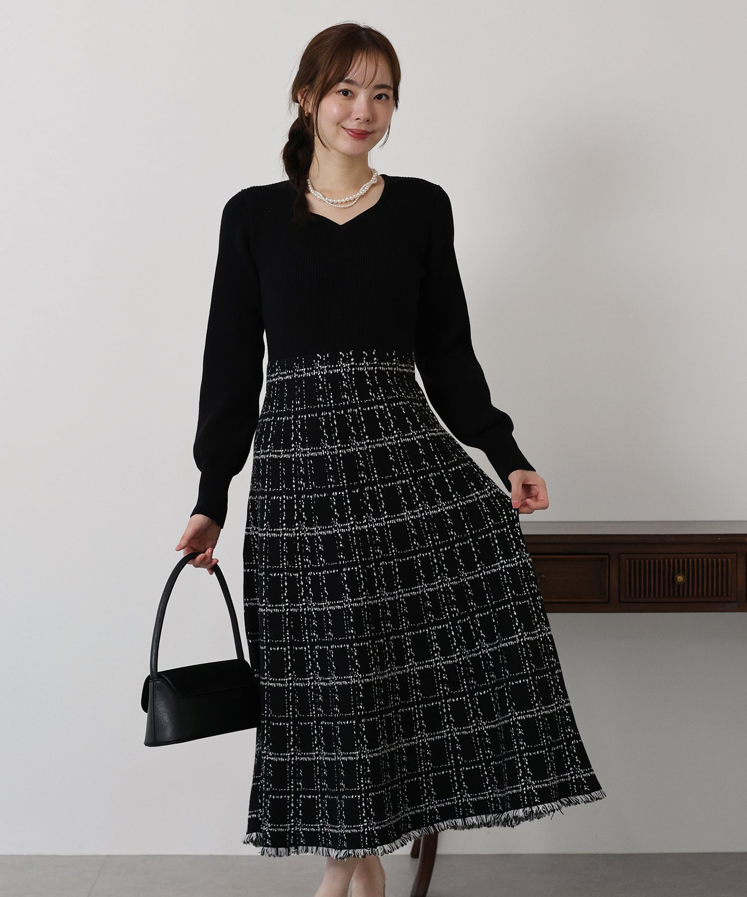 1枚で着映えするボリューム袖ニット×チェック柄スカートのドッキングワンピース。