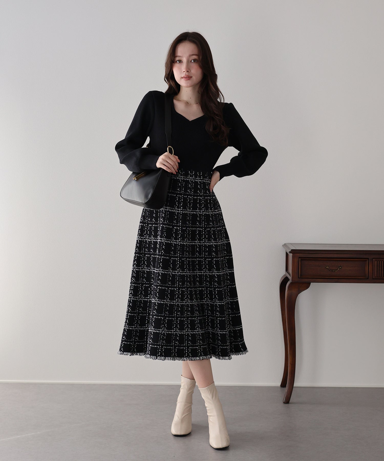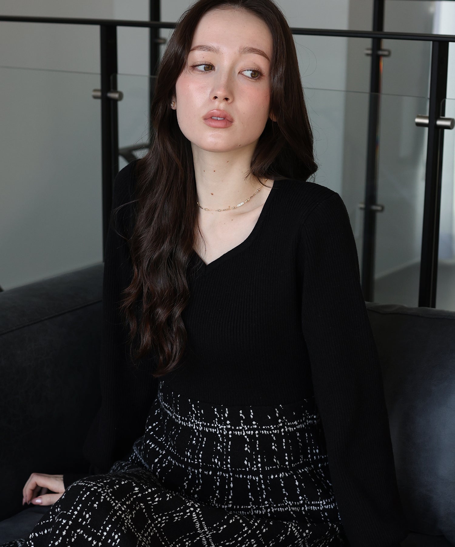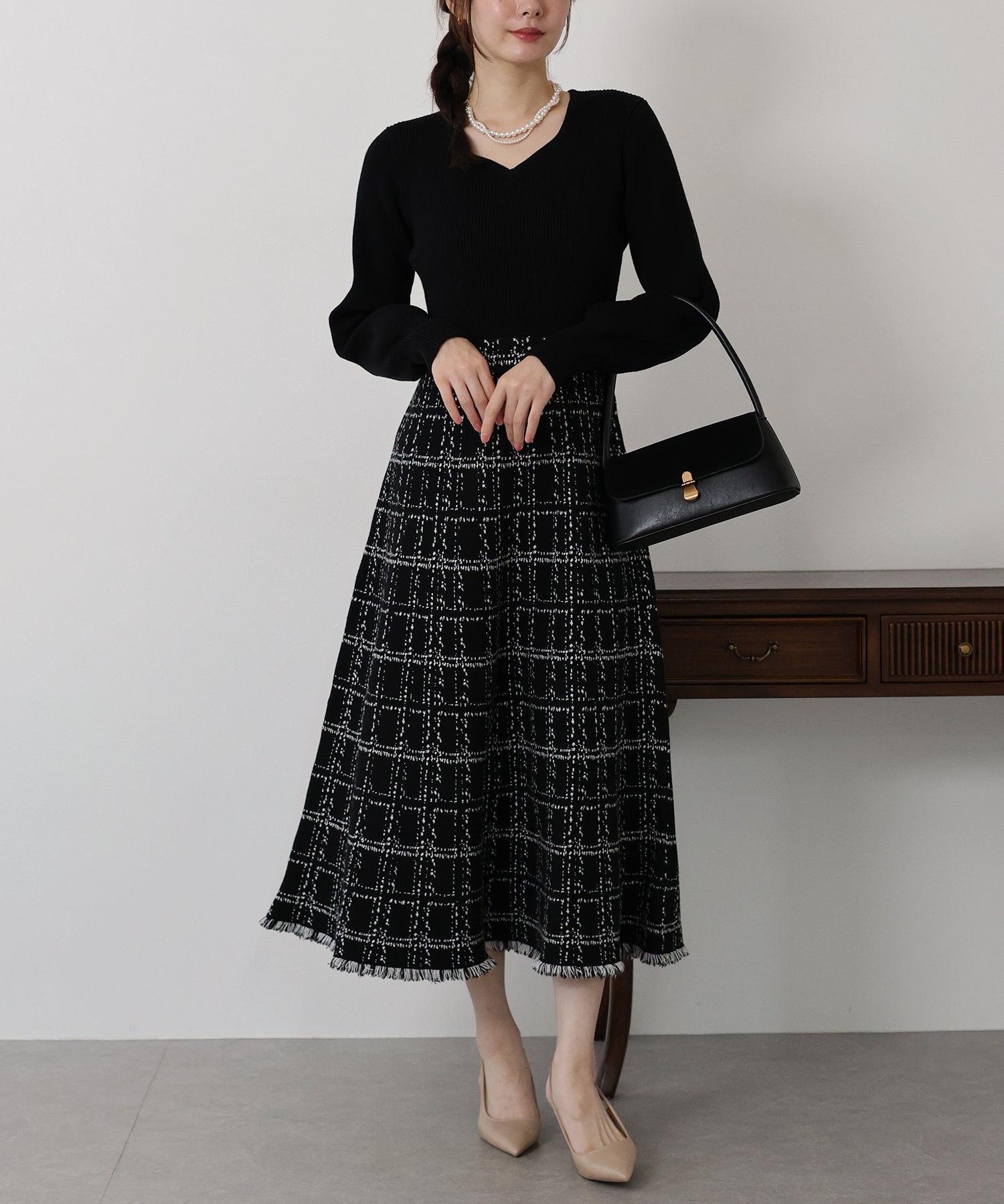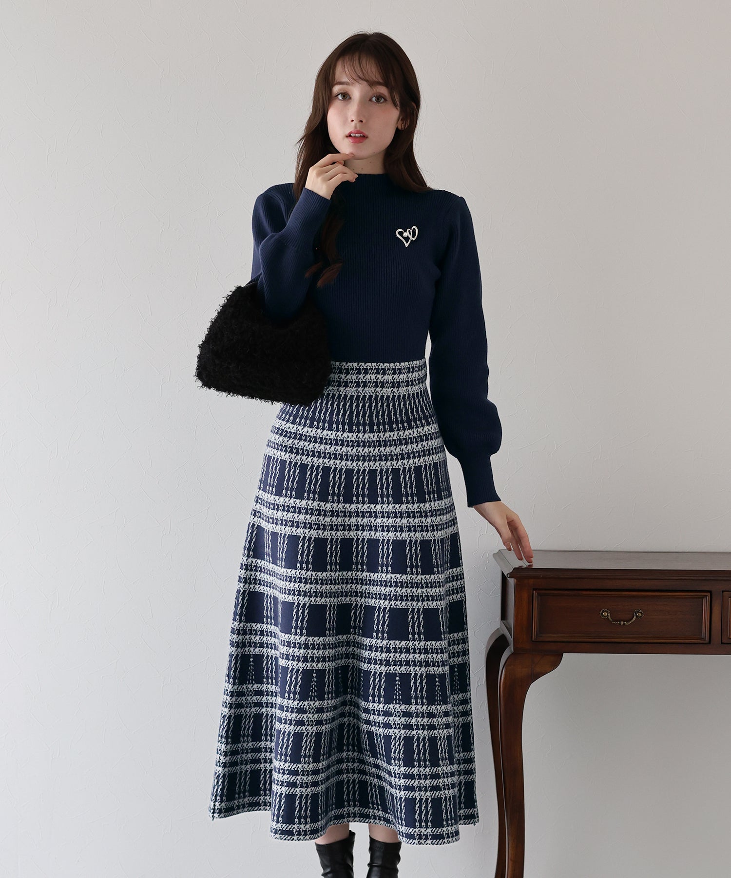 1枚で着映えするボリューム袖ニット×チェック柄スカートのドッキングワンピース。