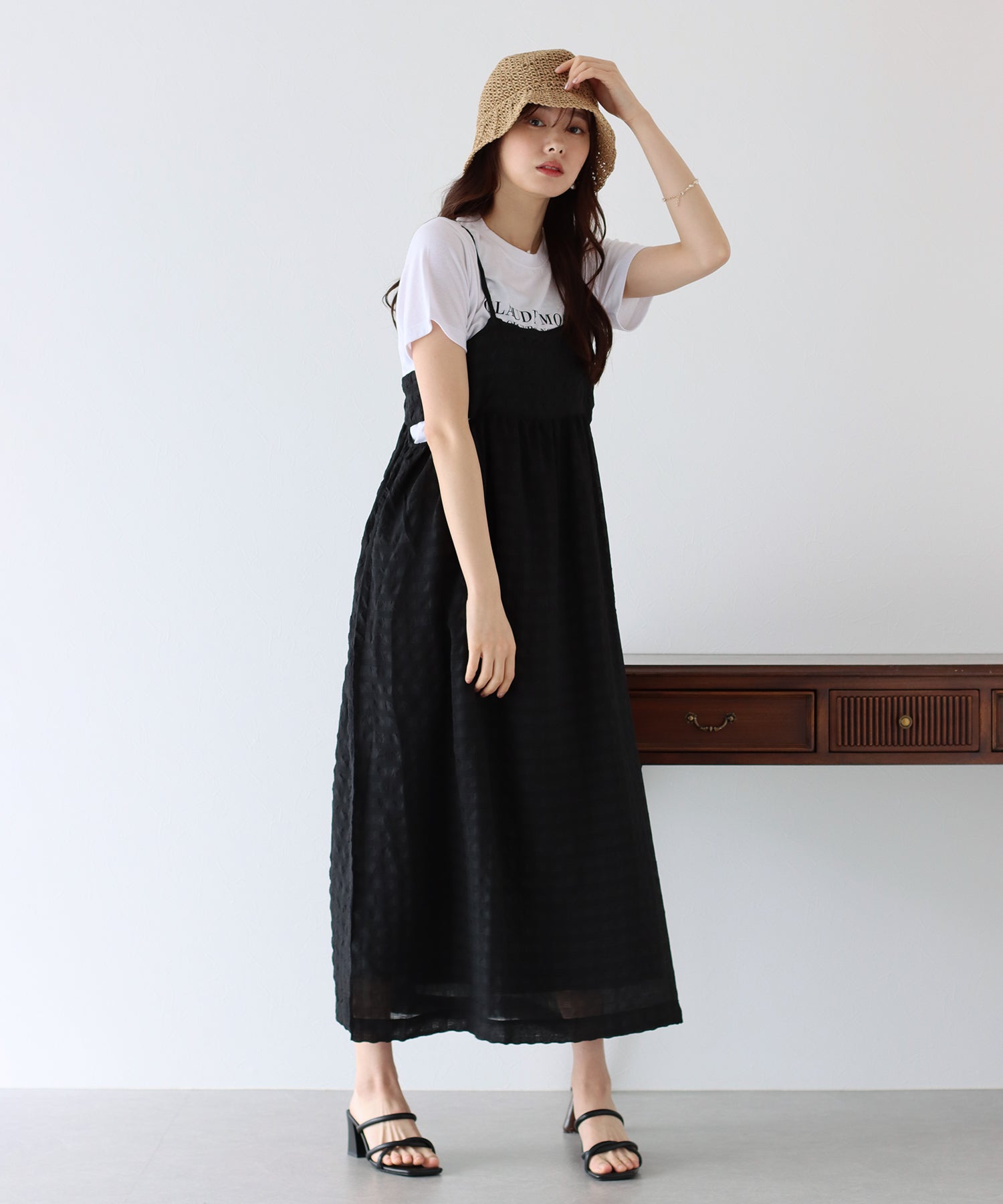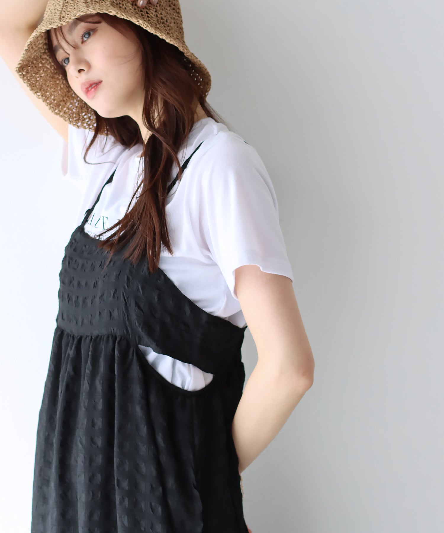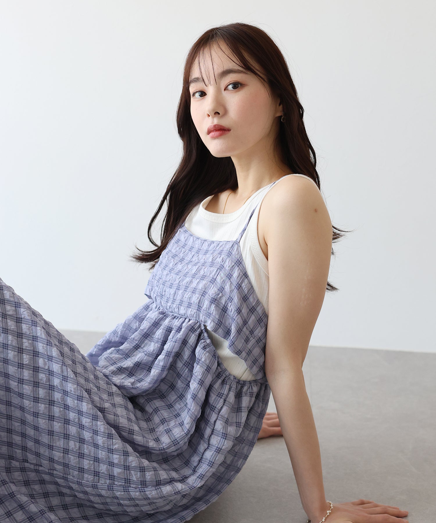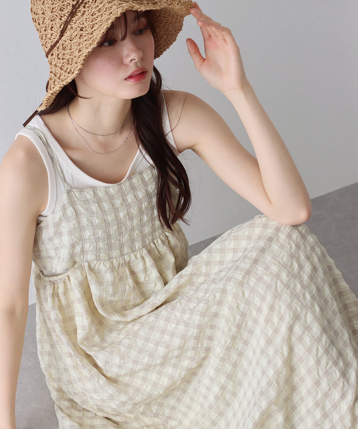 ぽこぽことした表面変化のある涼しげなムードのシアー生地に、キャミワンピの華奢な肩ひもでキュートな抜け感を演出してくれます。