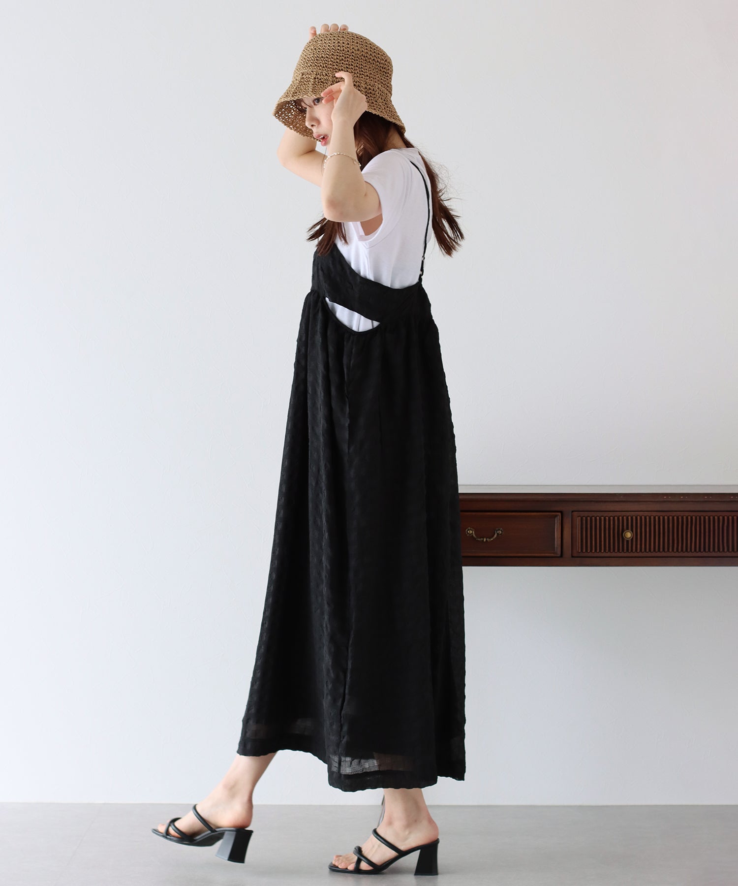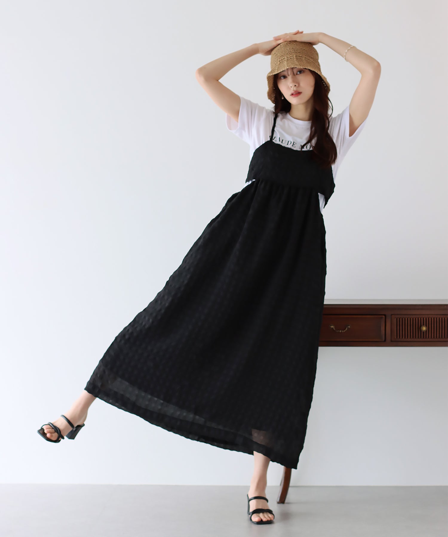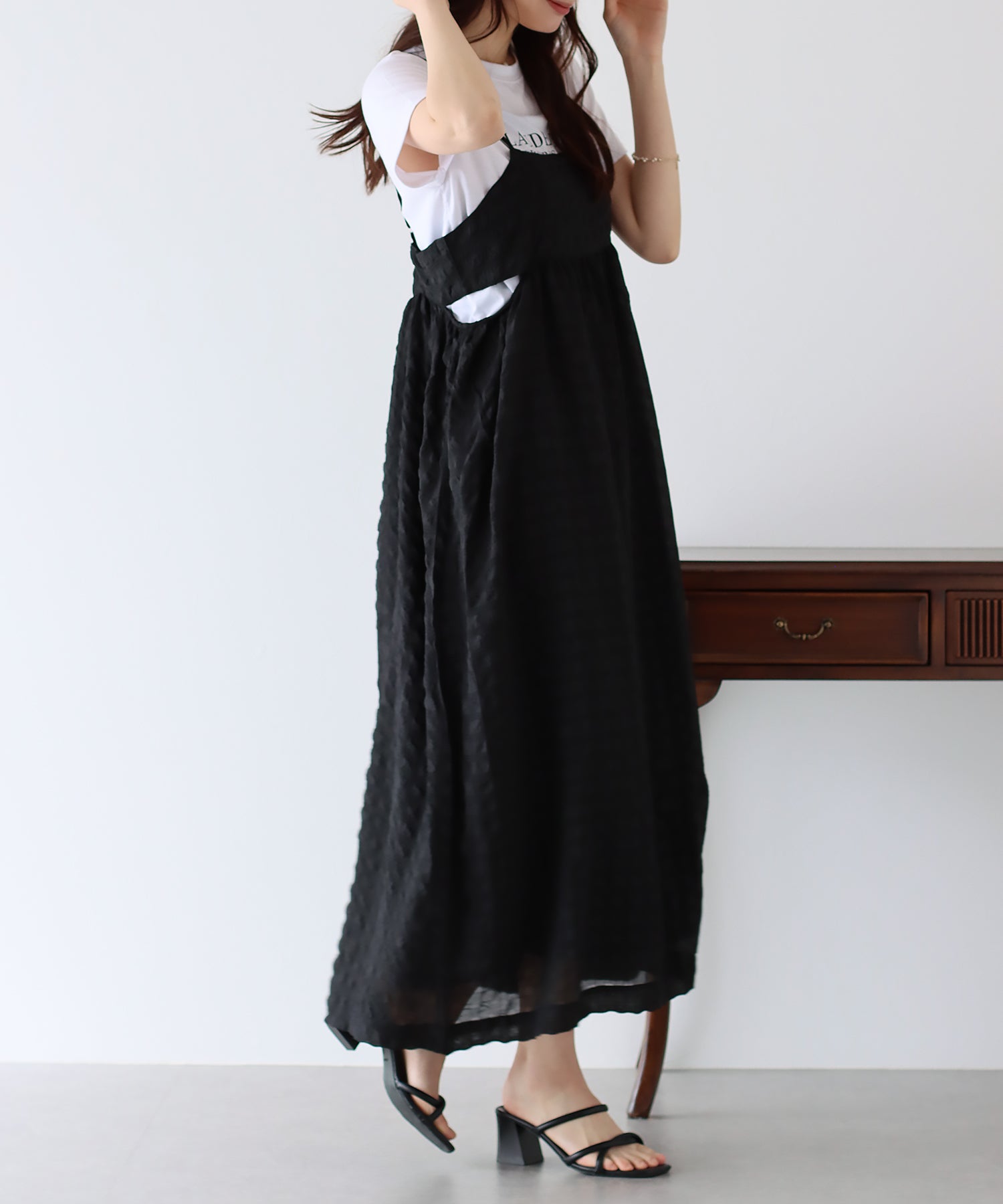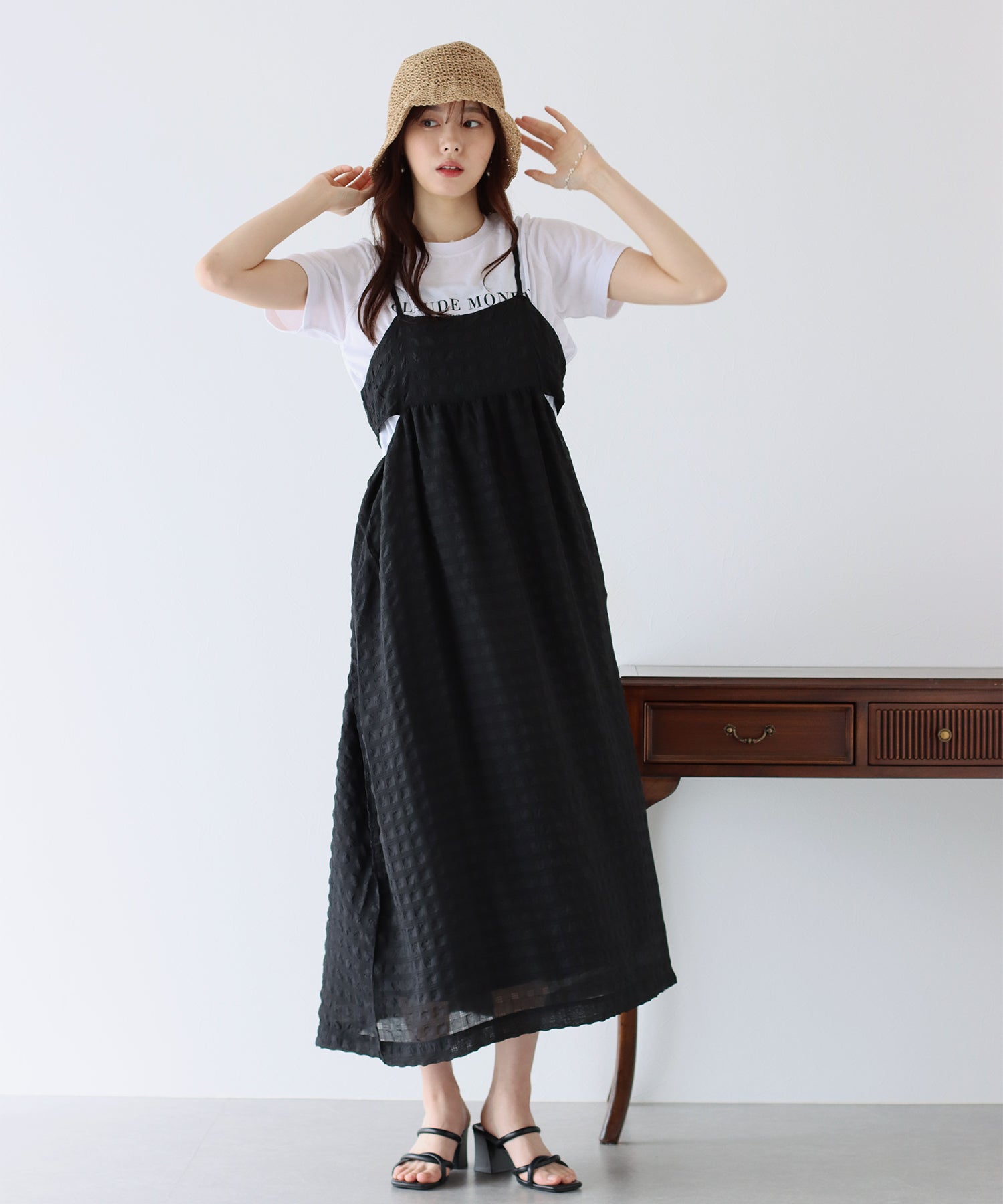 ぽこぽことした表面変化のある涼しげなムードのシアー生地に、キャミワンピの華奢な肩ひもでキュートな抜け感を演出してくれます。