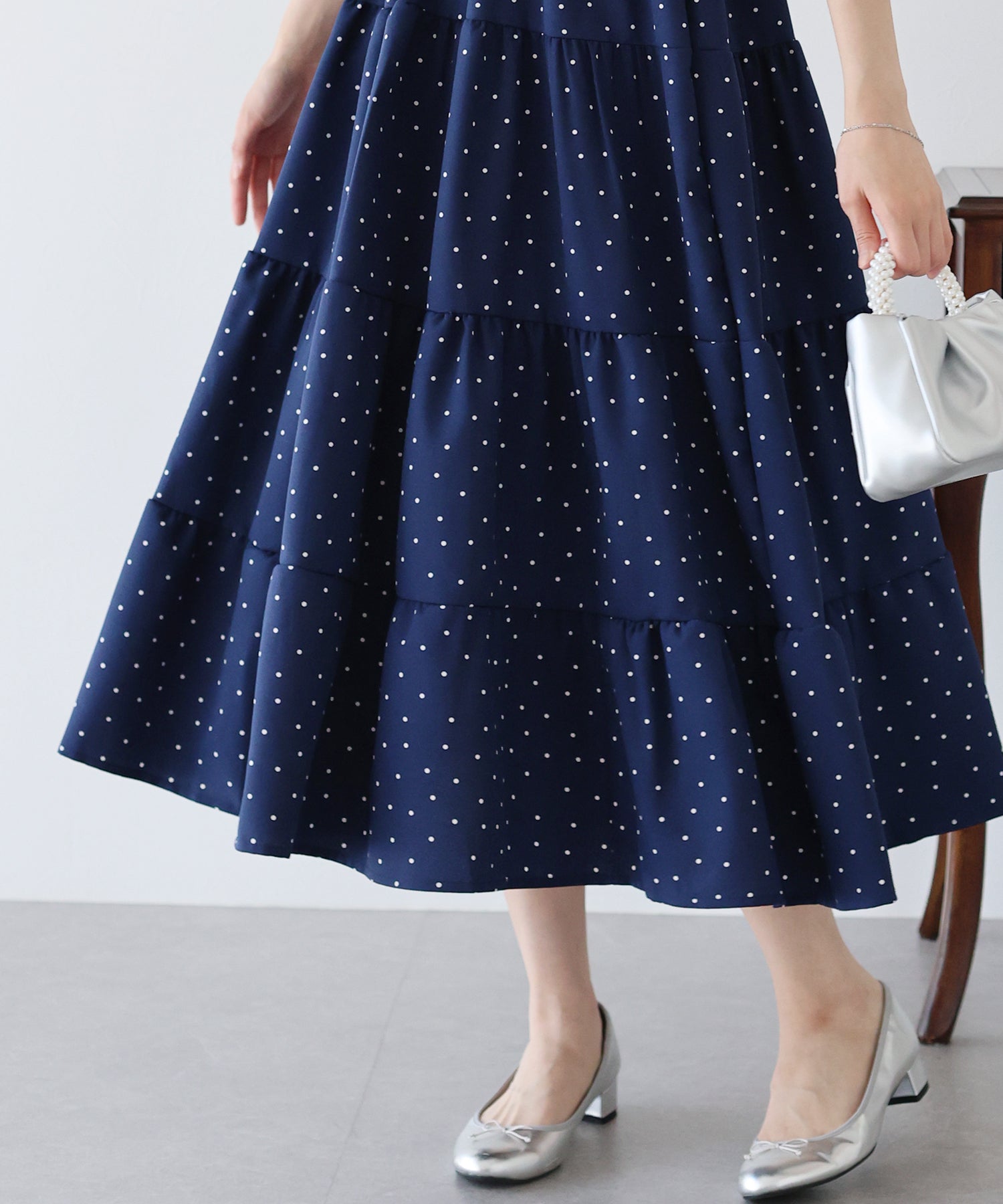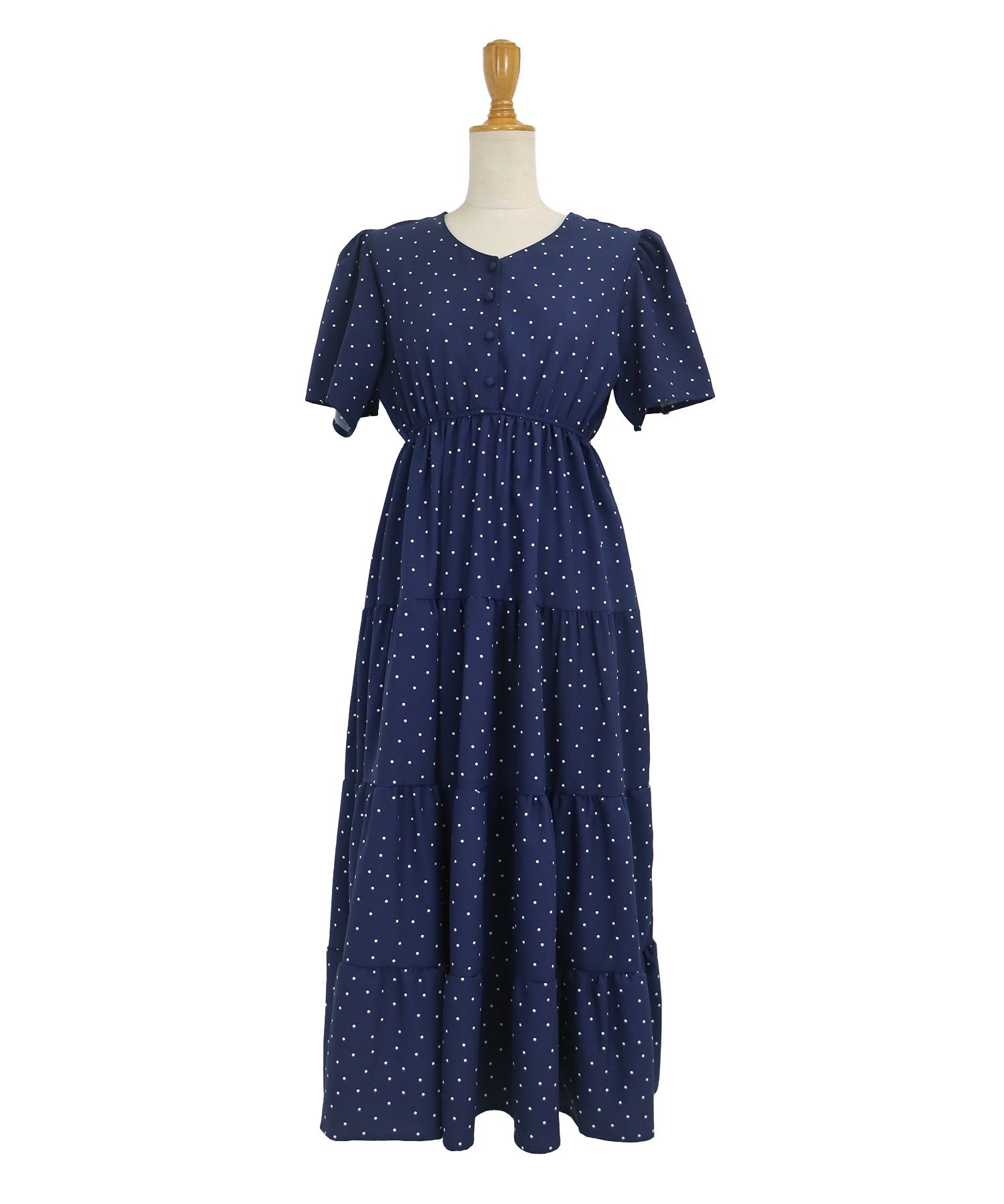 ランダムドットが大人可愛い、ロング丈の半袖ティアードワンピース。