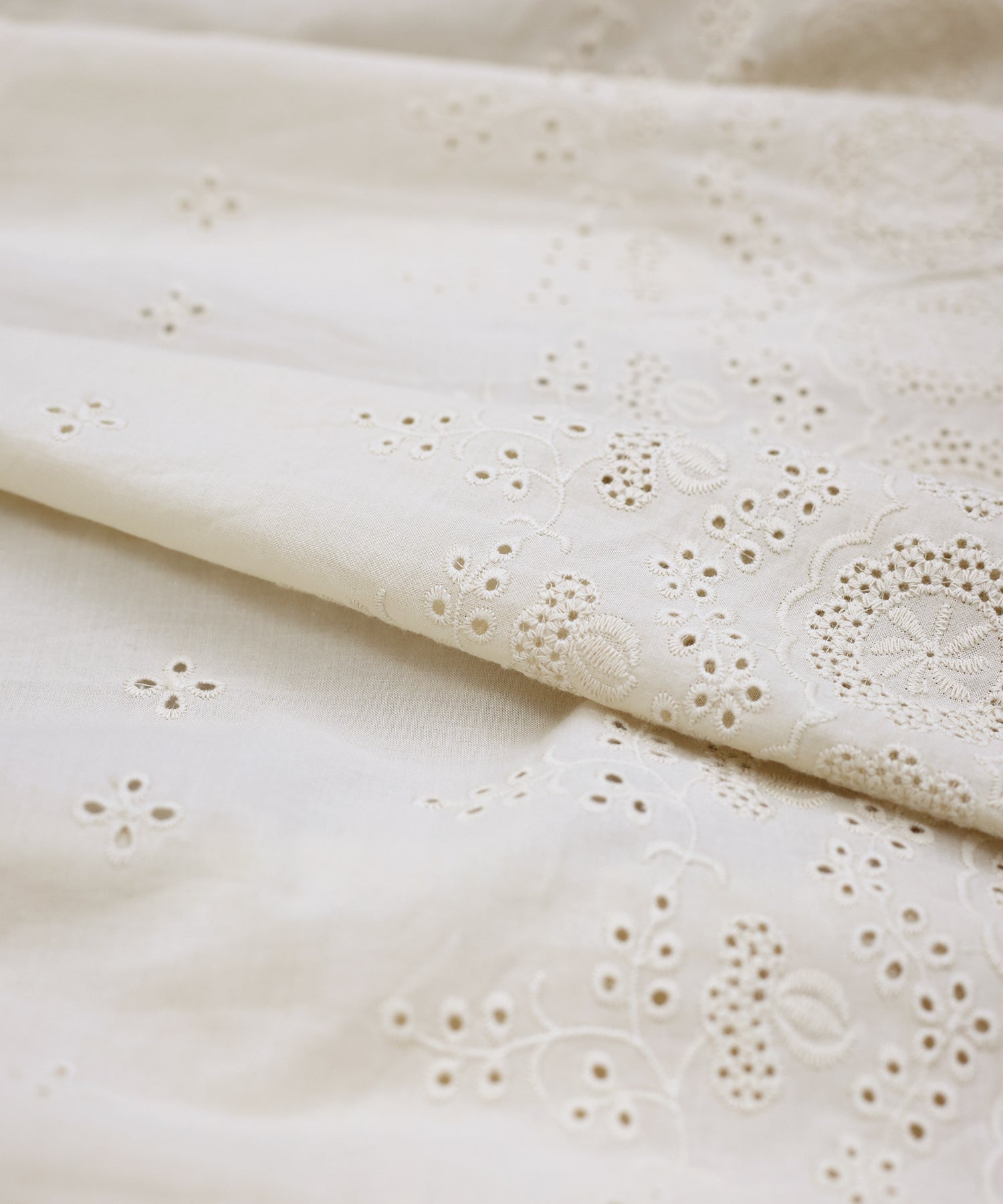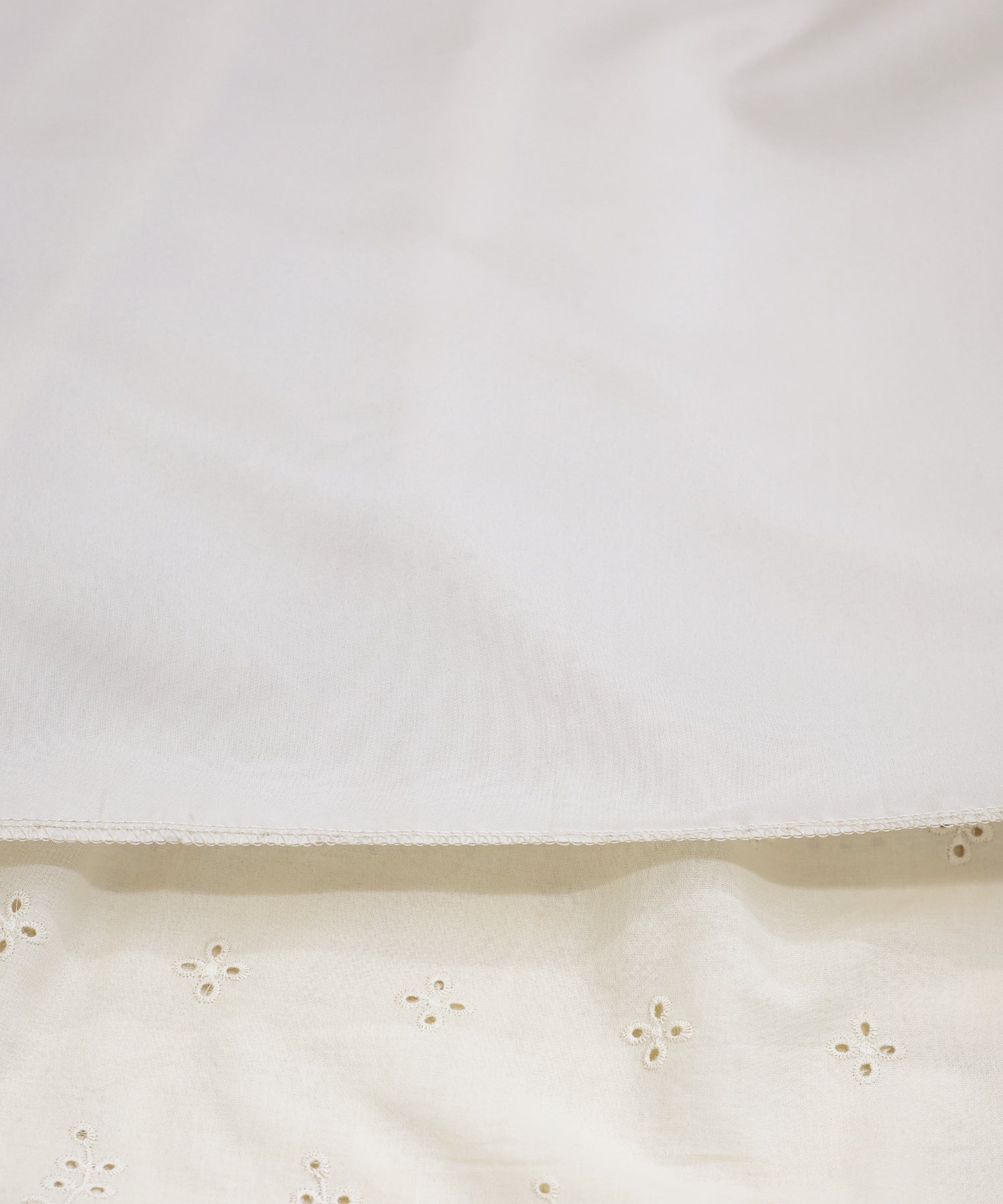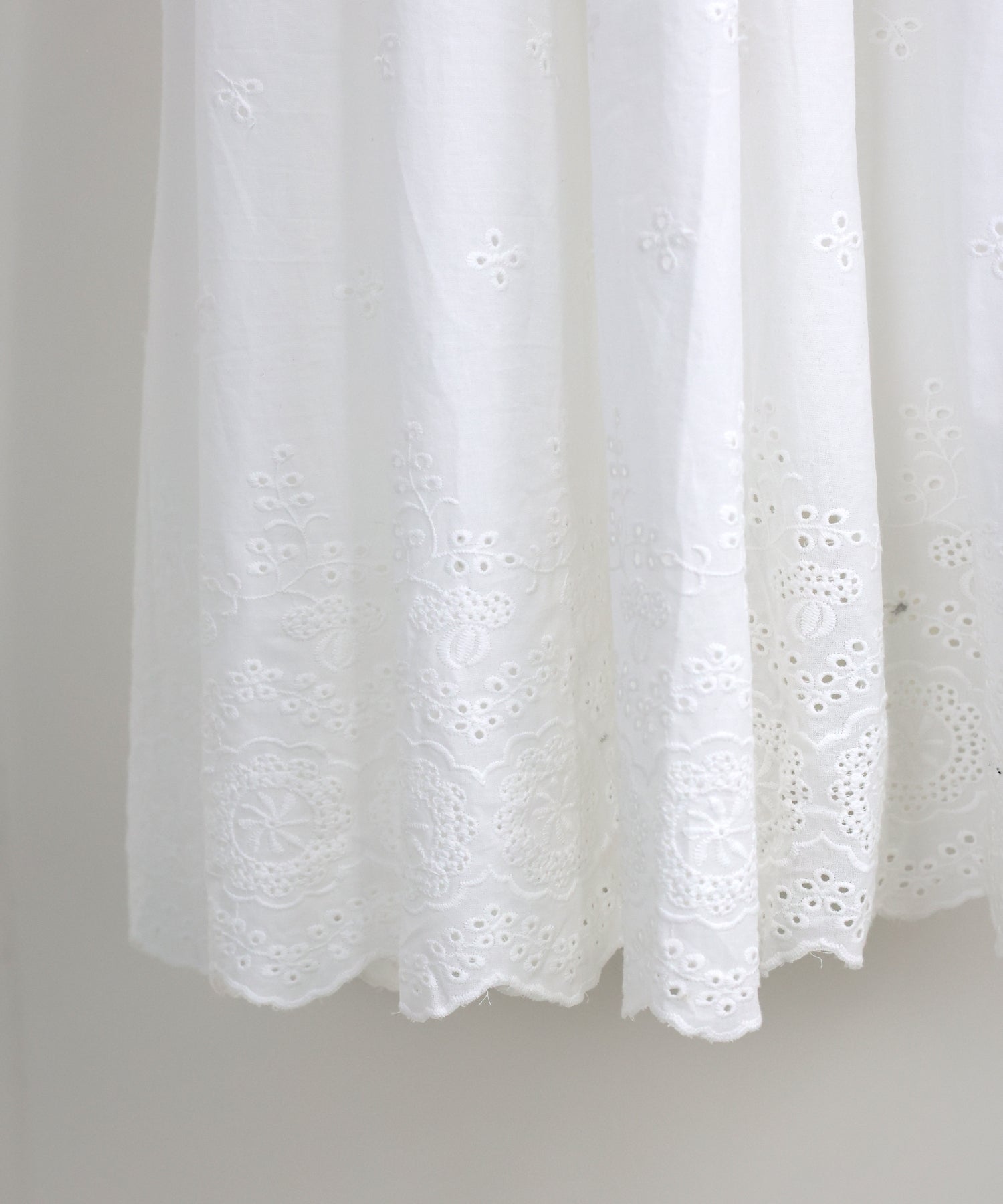 裾には繊細な花柄刺繍とカットワークレースが施され、可憐で上品なアクセントに。