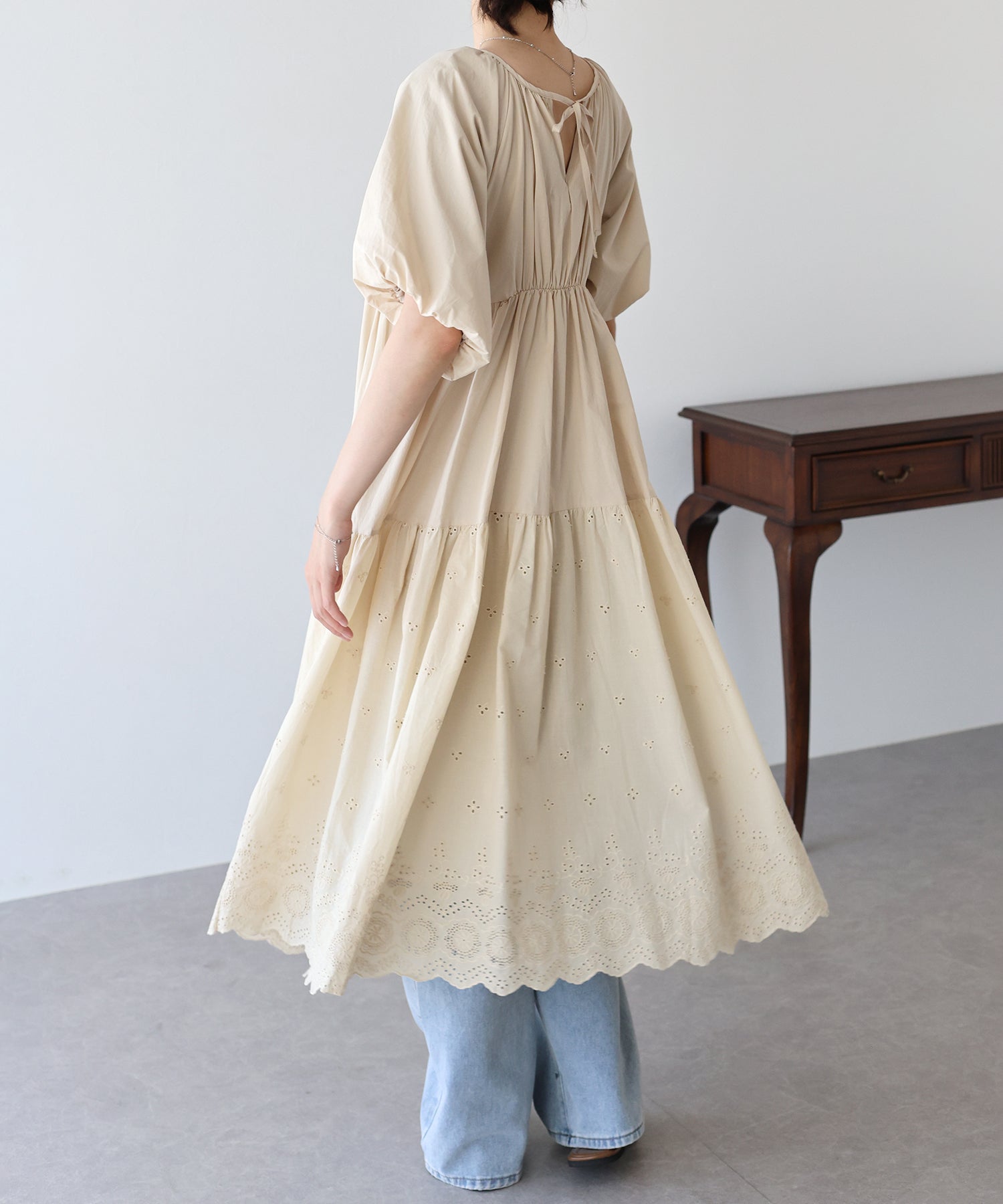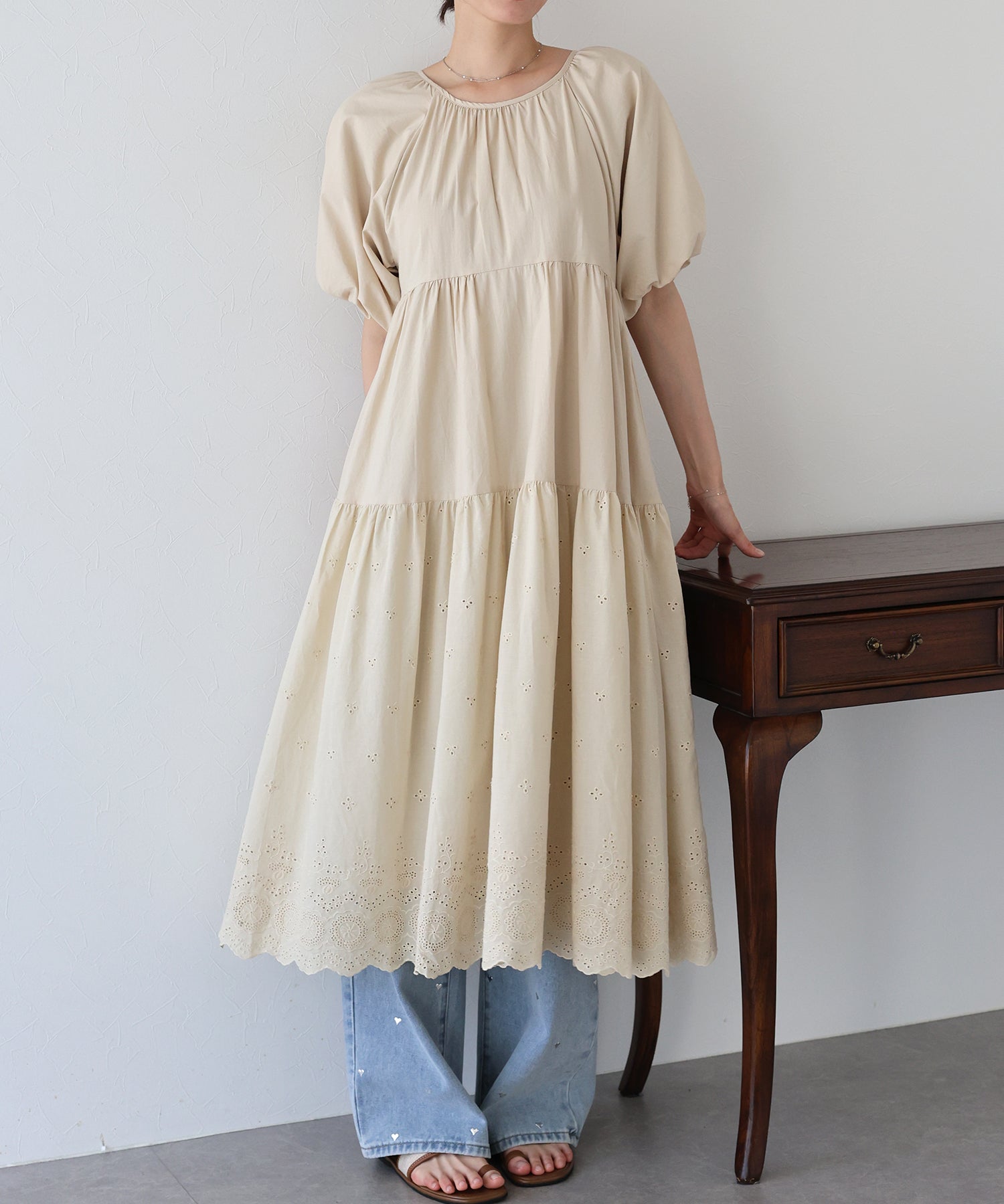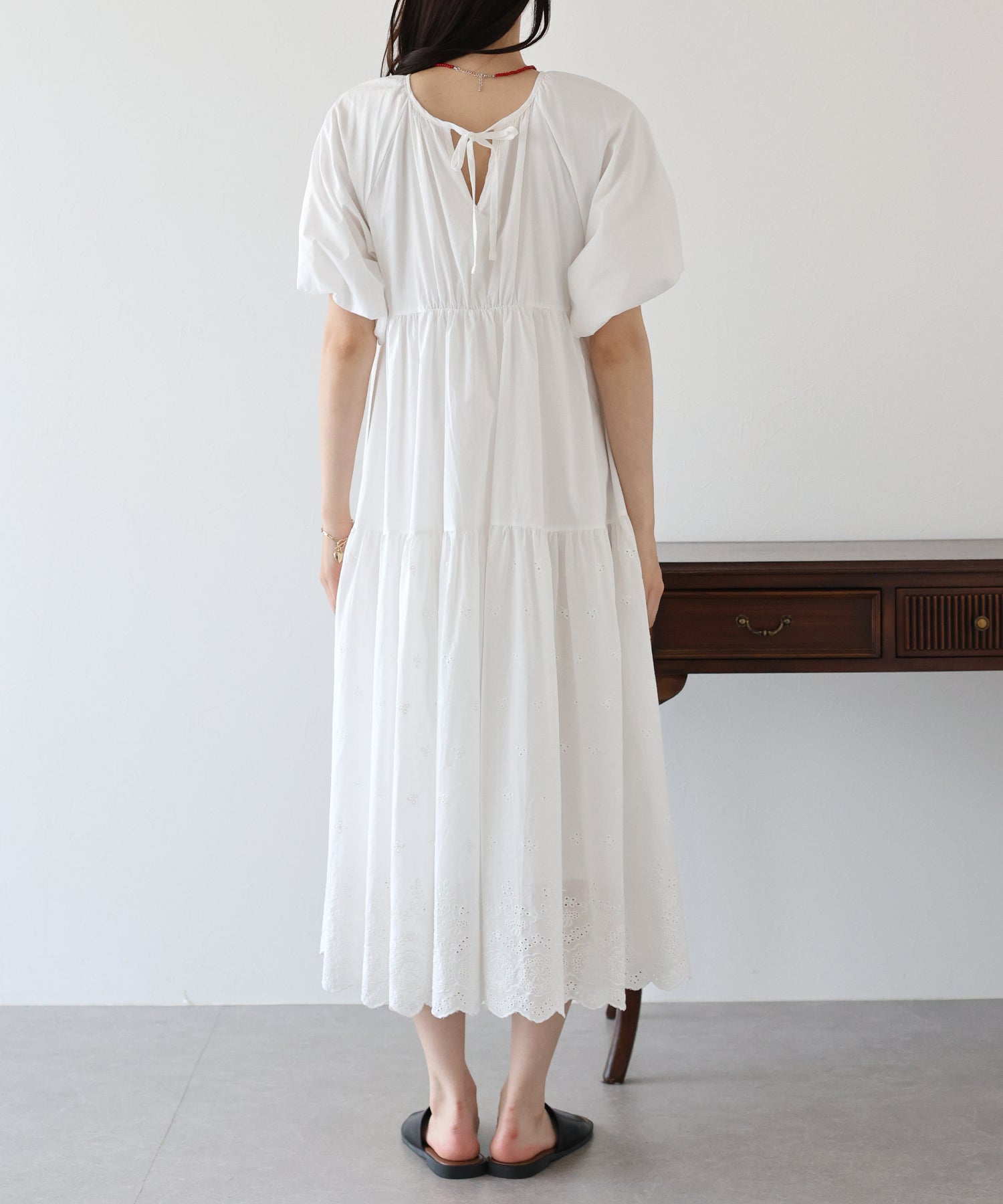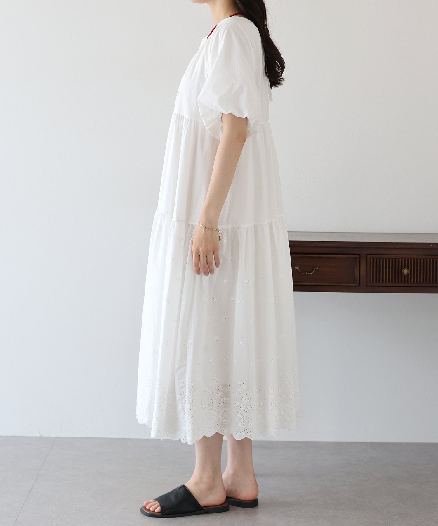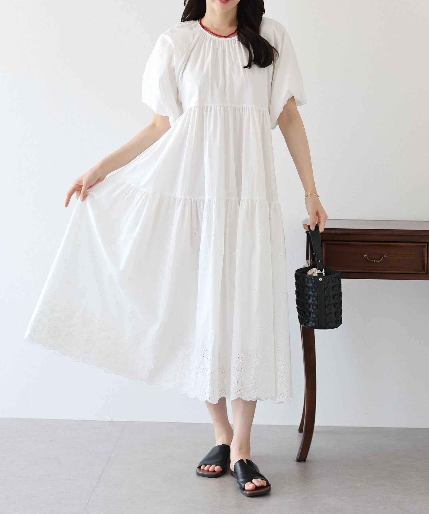 繊細な花柄刺繍が彩るナチュラルフェミニンなコットンワンピース