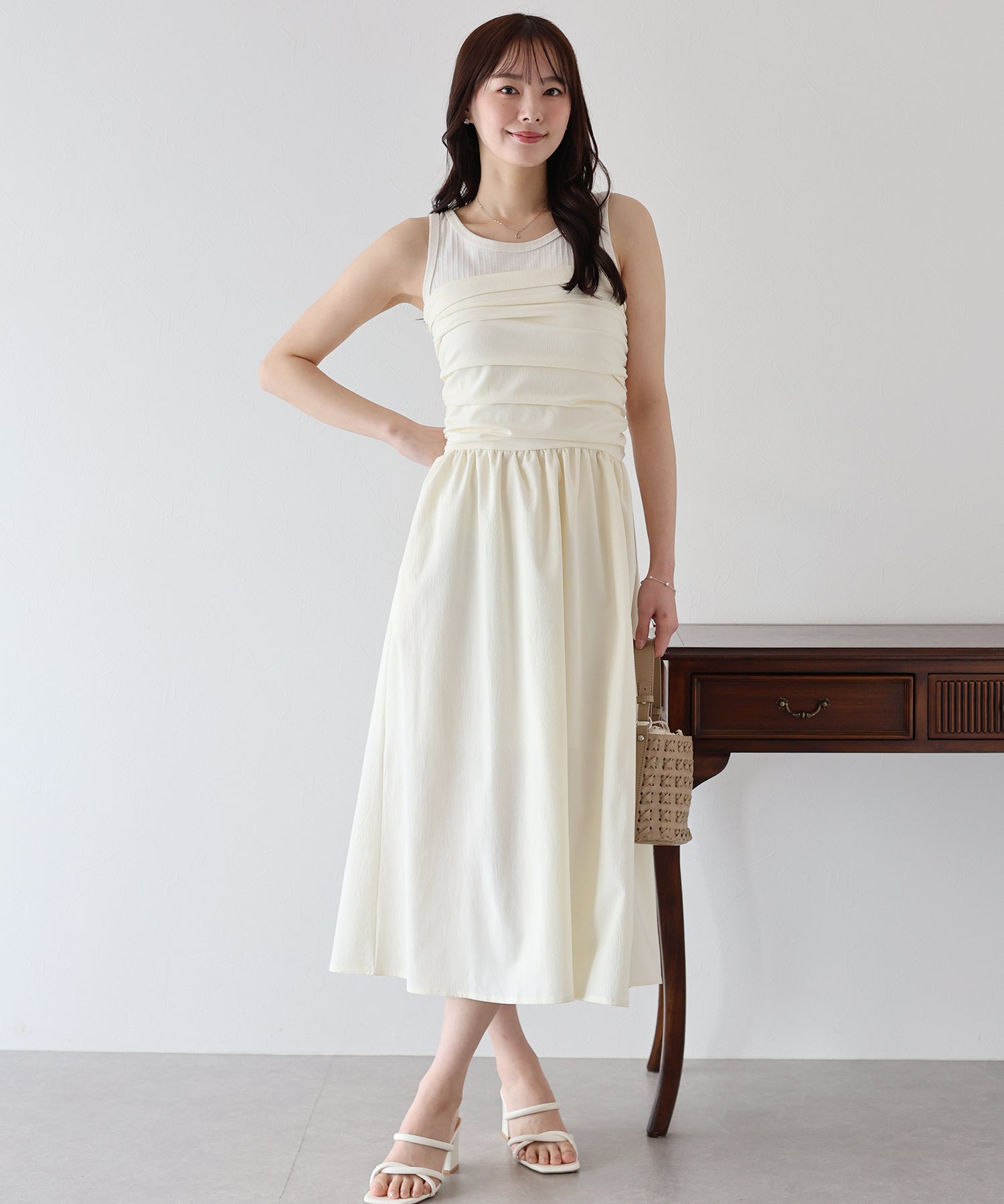 前身頃のドレープデザインが立体感を生み、上品&華やかな印象に。