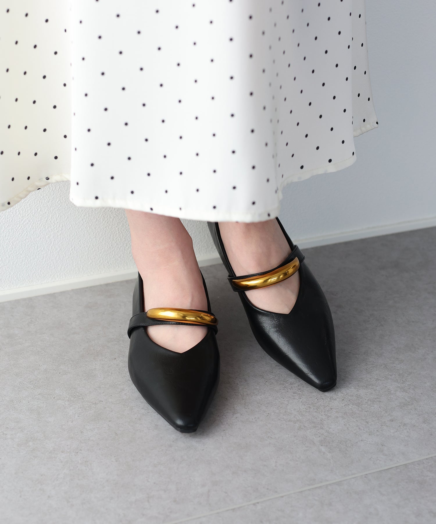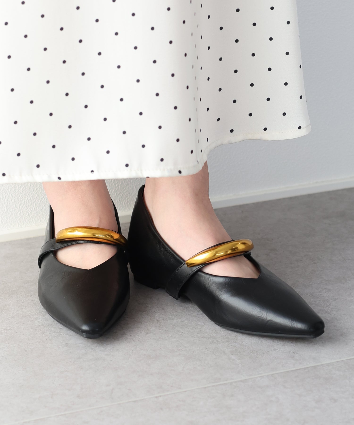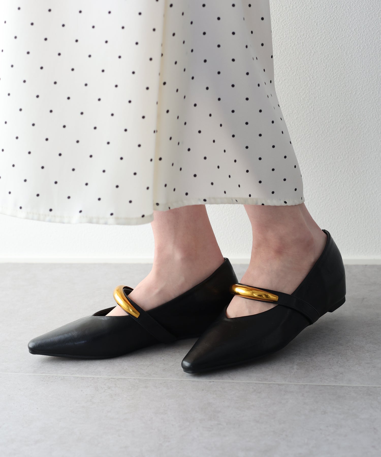 目を惹く大きめのゴールドモチーフのフラットパンプス。