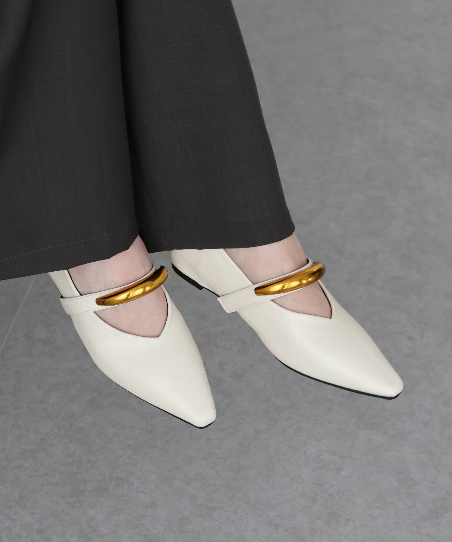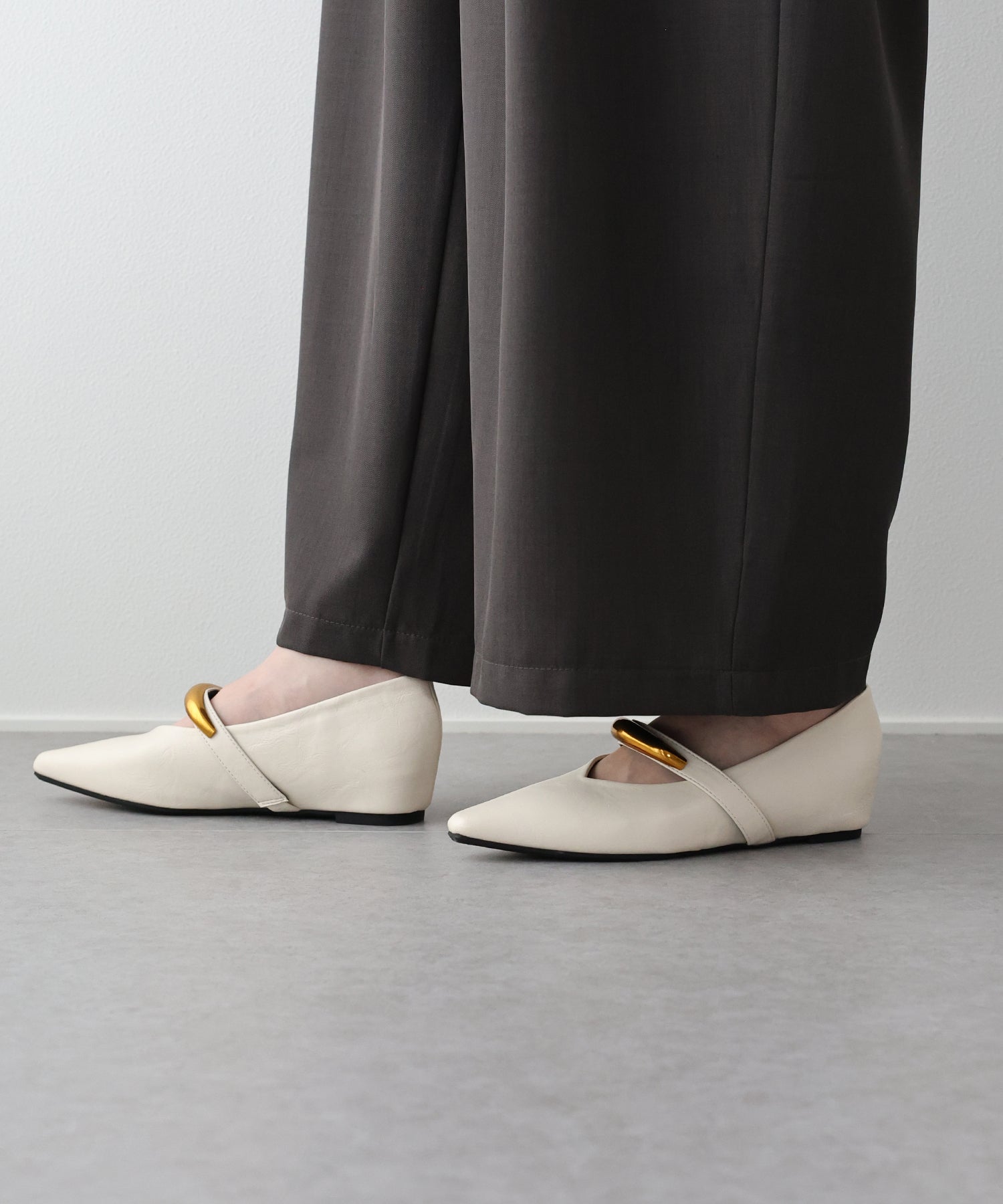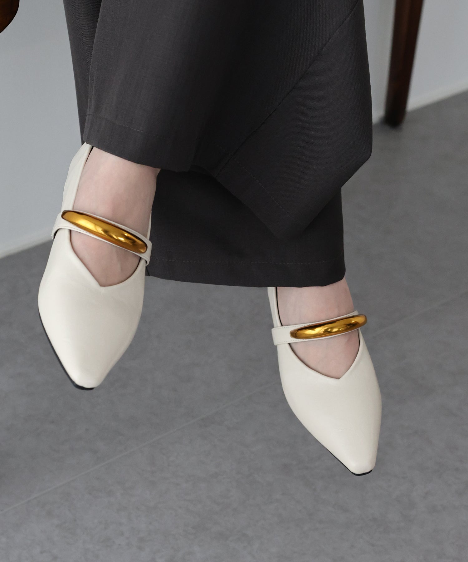目を惹く大きめのゴールドモチーフのフラットパンプス。