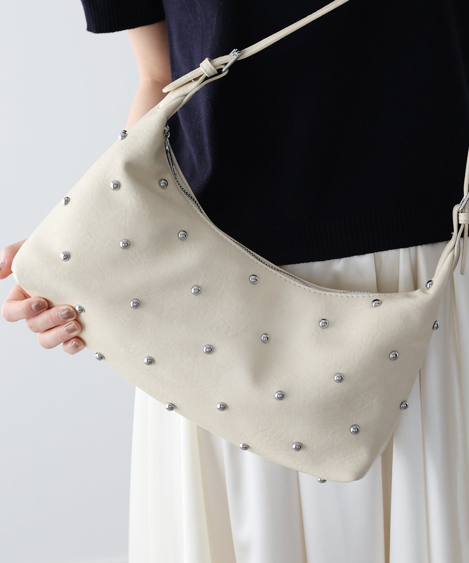 ハードな印象になりがちなスタッズデザインですが、洗練されたフォルムとシルバーの光沢感が相まって、大人の女性にふさわしい上品なモード感を演出。
