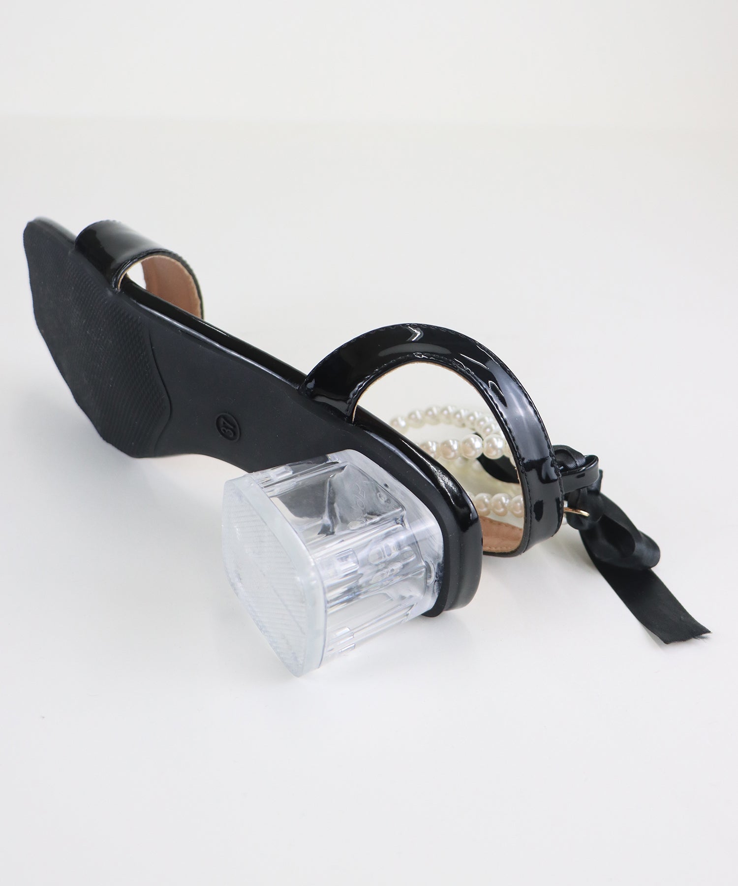 スクエアトゥと太めのクリアヒールでモードな印象をプラス。