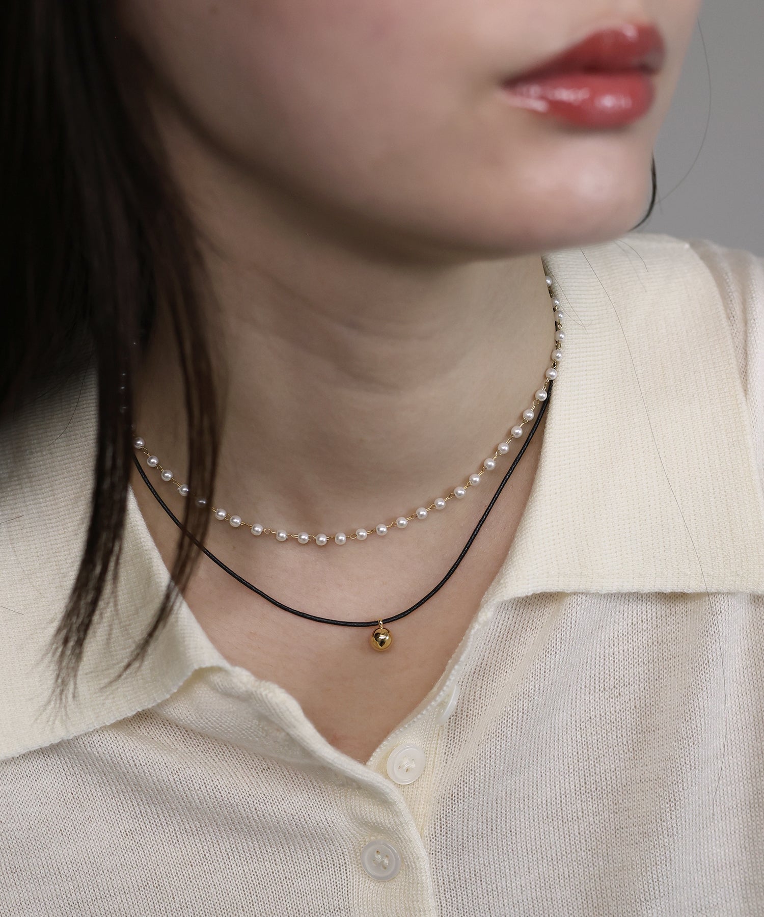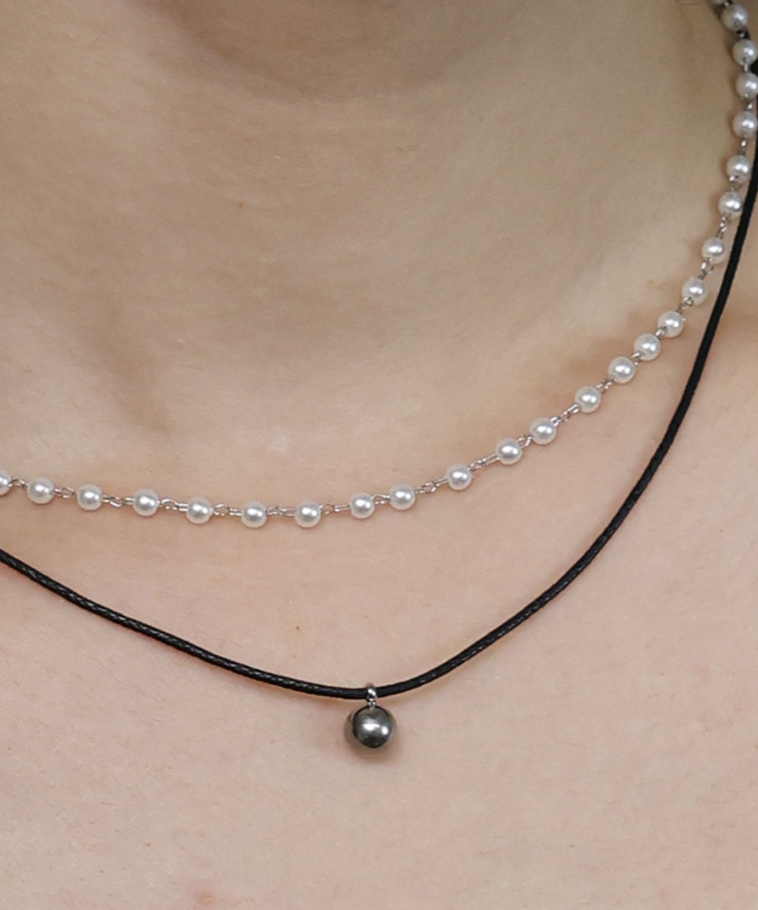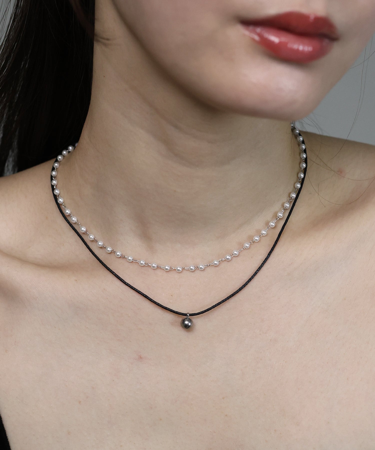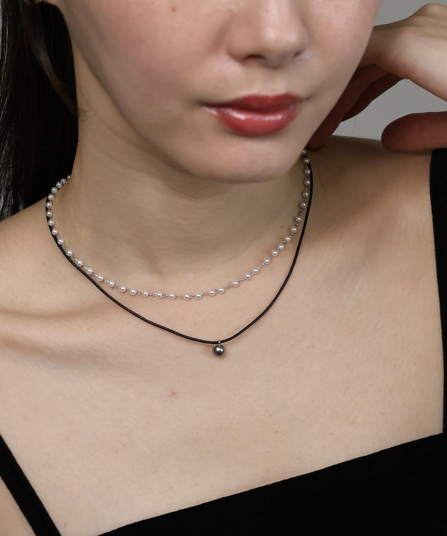 上品なパールネックレスと、トレンド感のあるコードチョーカーを組み合わせた2連デザイン。