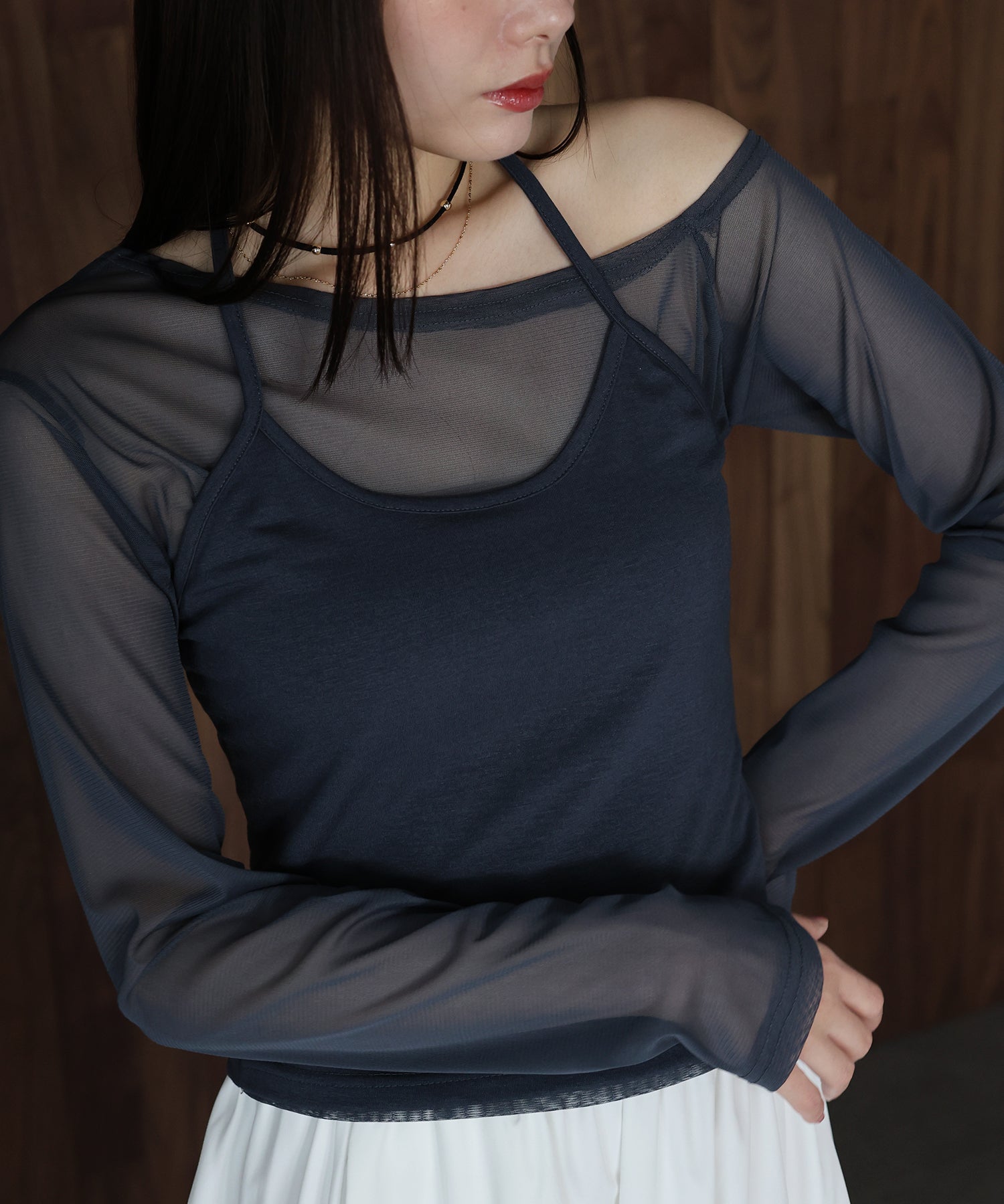 チュールインナーにホルターネックキャミソールをレイヤードしたようなデザインがこなれた印象を与えてくれます。