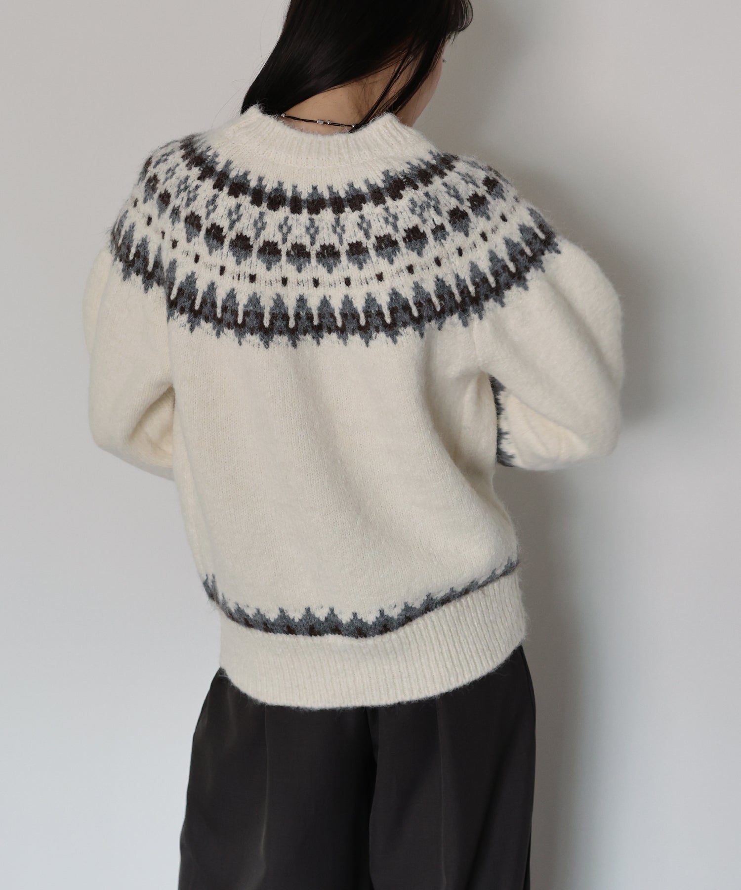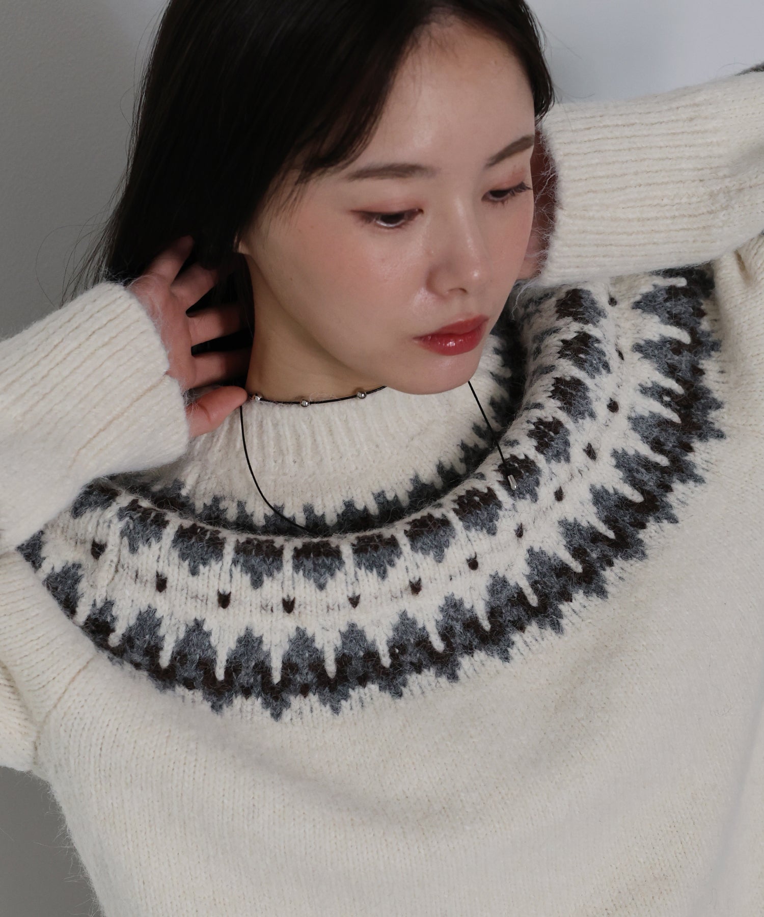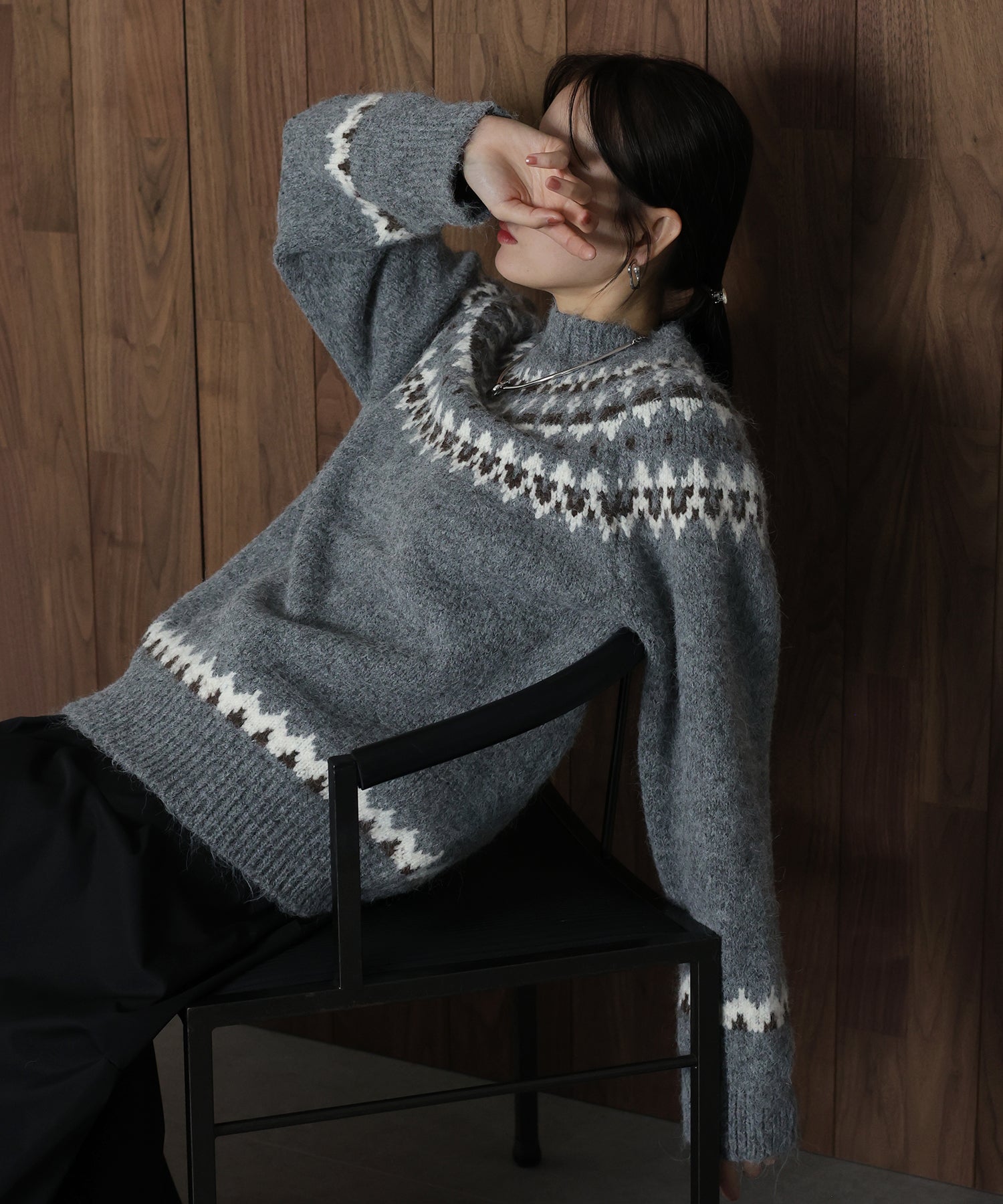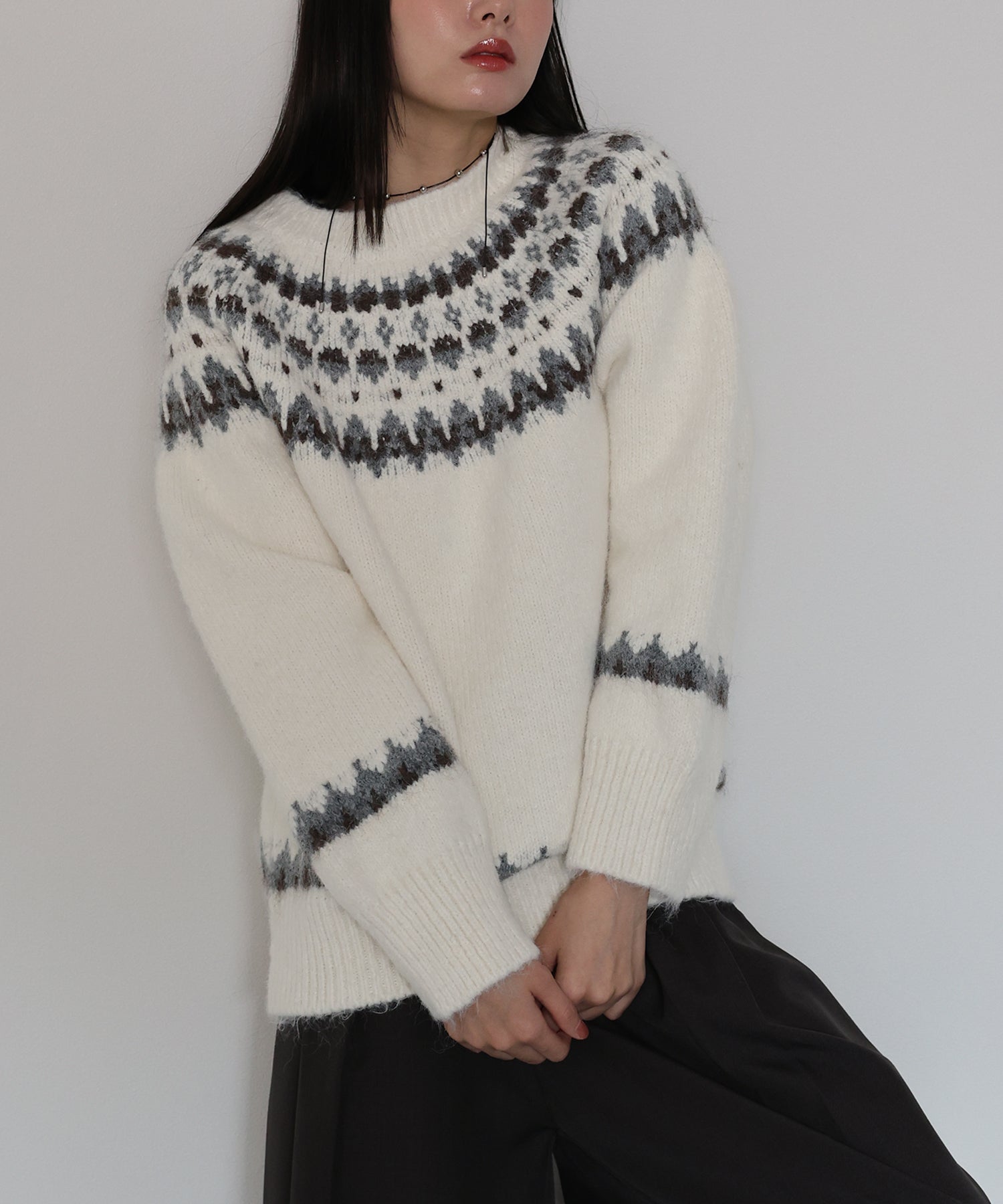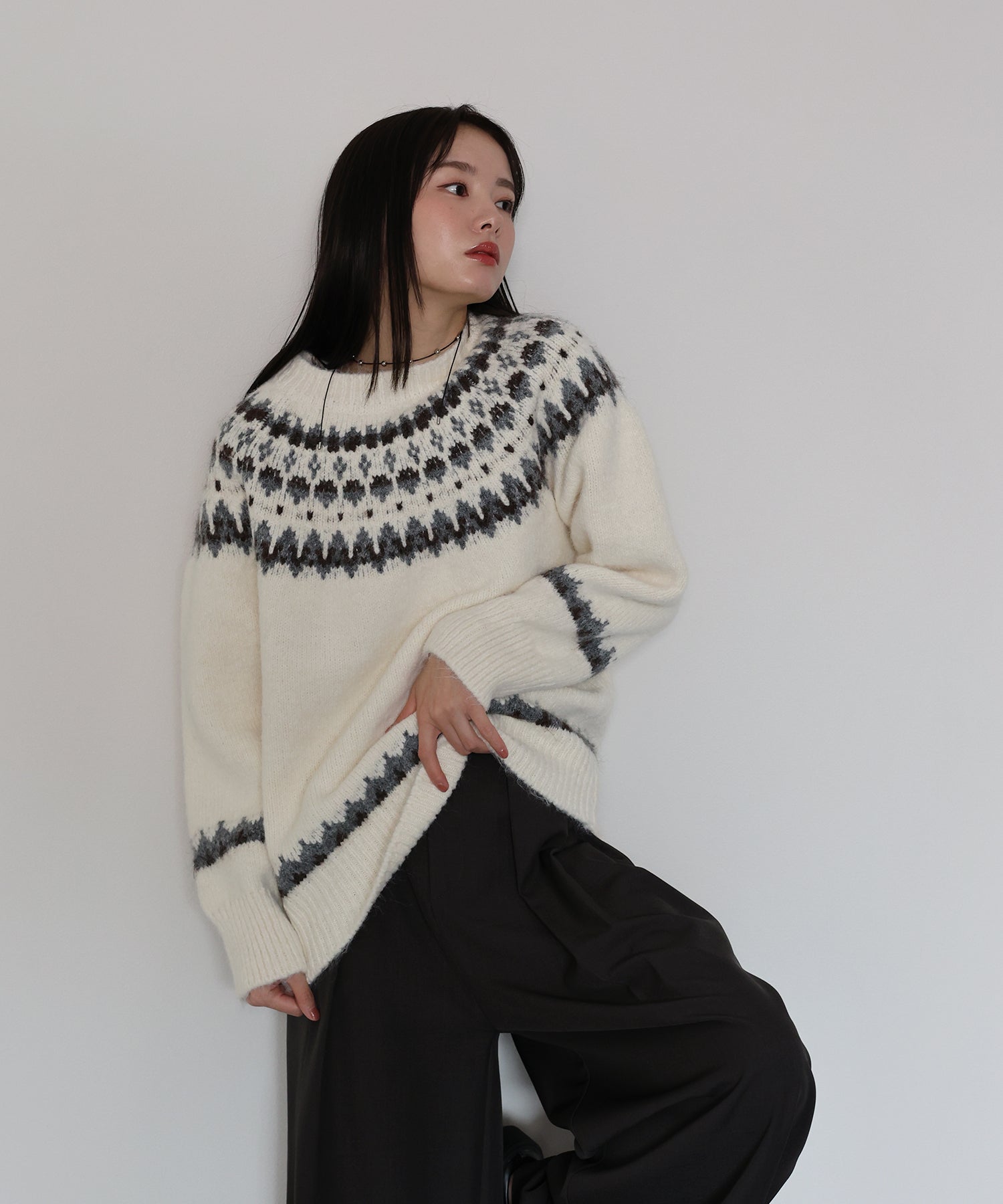秋冬らしいノルディック調デザインが目を惹く、大人可愛いニットプルオーバー。