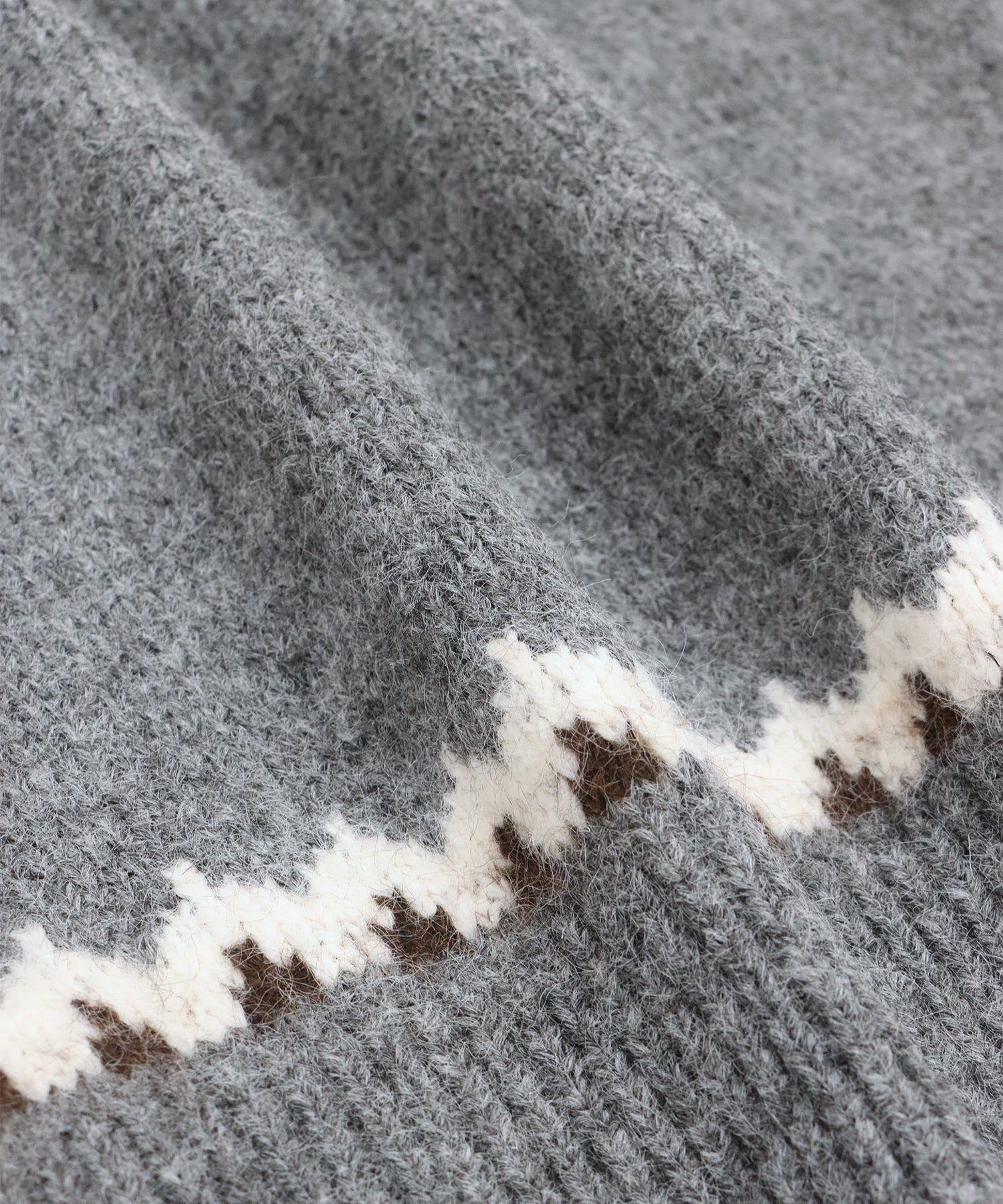 顔周りを明るく見せてくれるグレーベースに、赤やブラウンを効かせた編み込み柄がコーデの主役に。