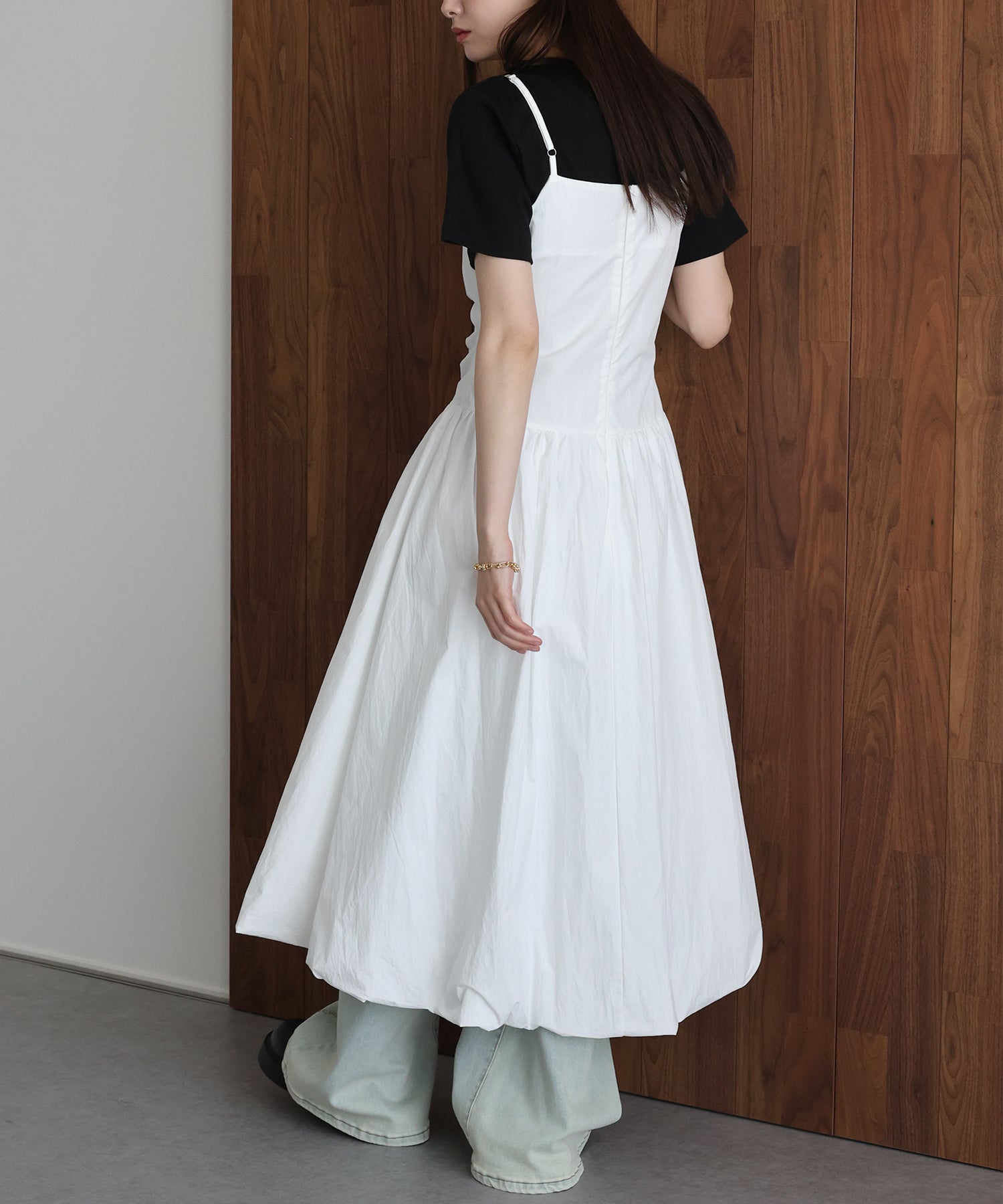 アシンメトリーギャザーが描く、モードなバルーンキャミワンピース
