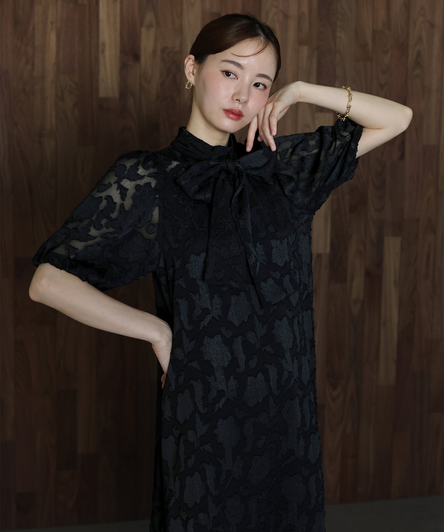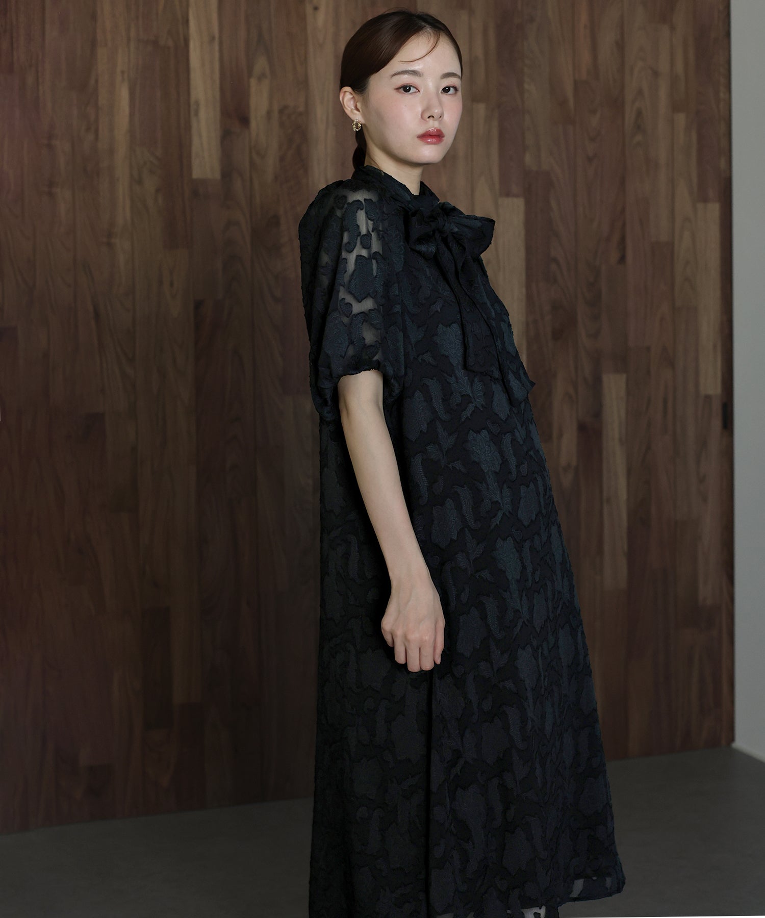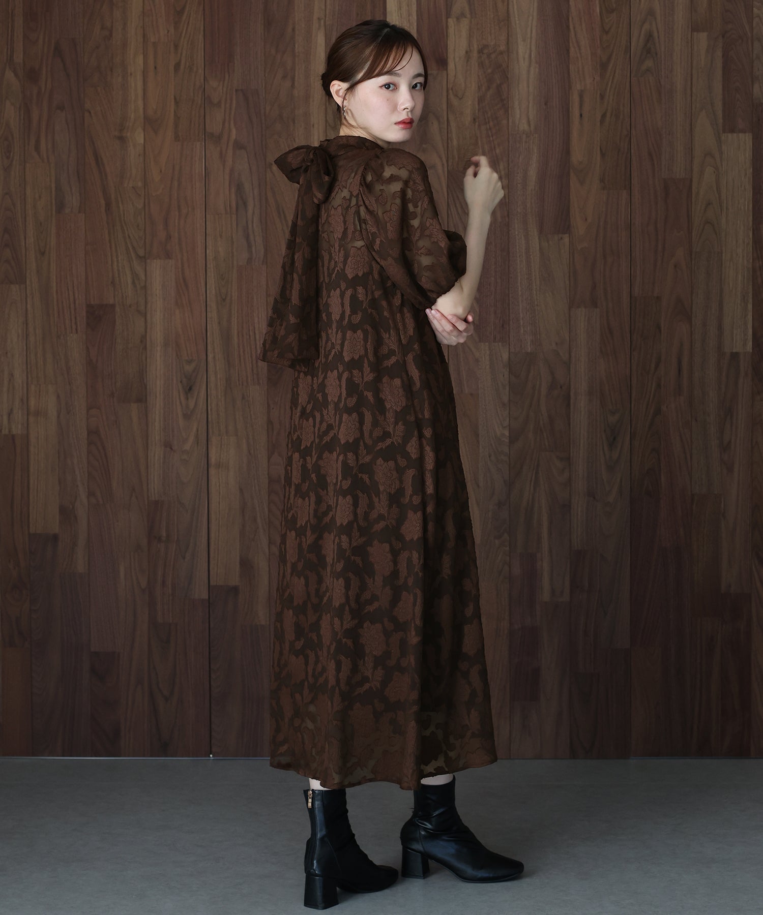 쉬폰 자카드가 적당한 투명감과 입체감을 연출해주는 백 리본 롱 길이 원피스 파티 원피스 결혼식 원피스