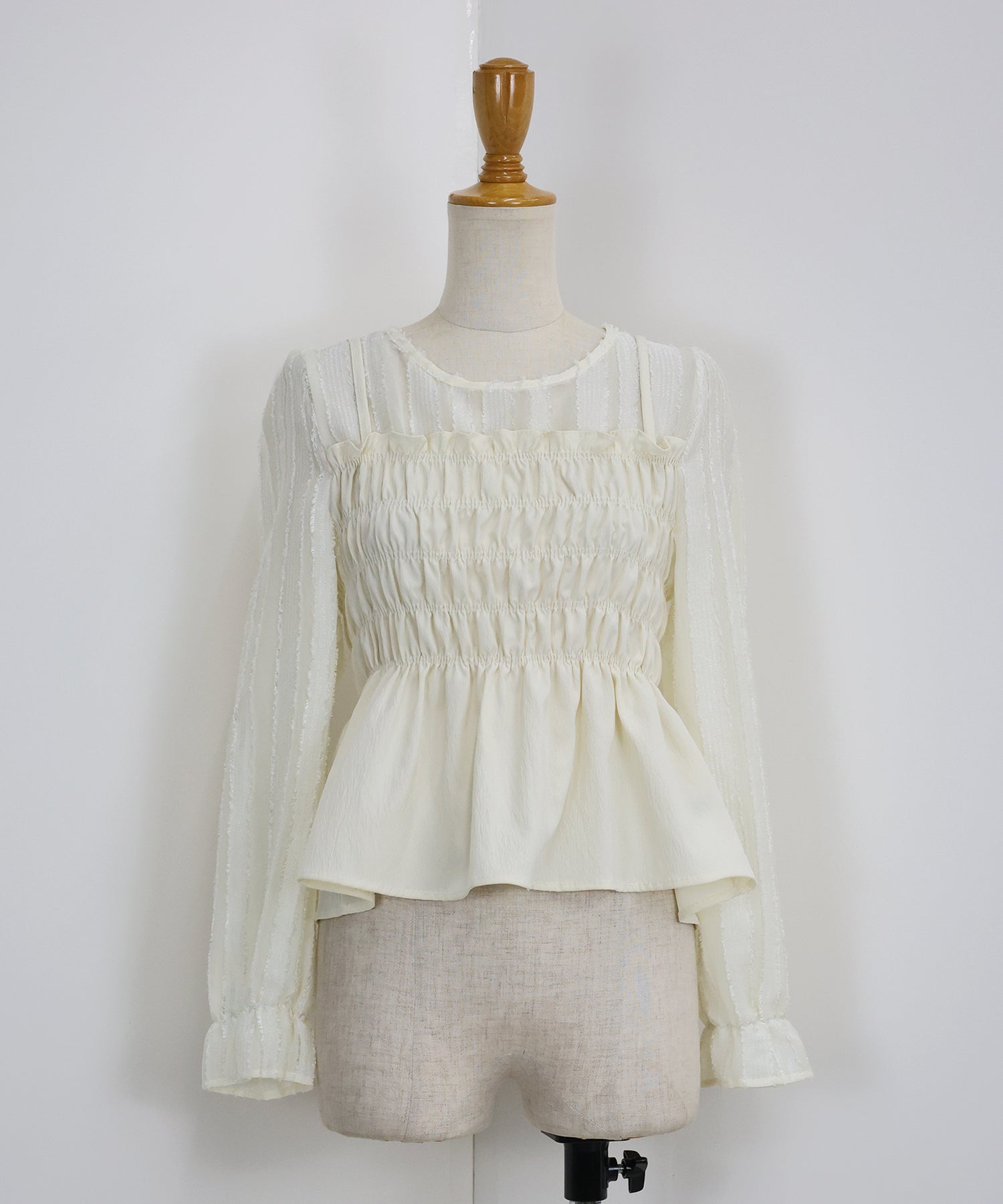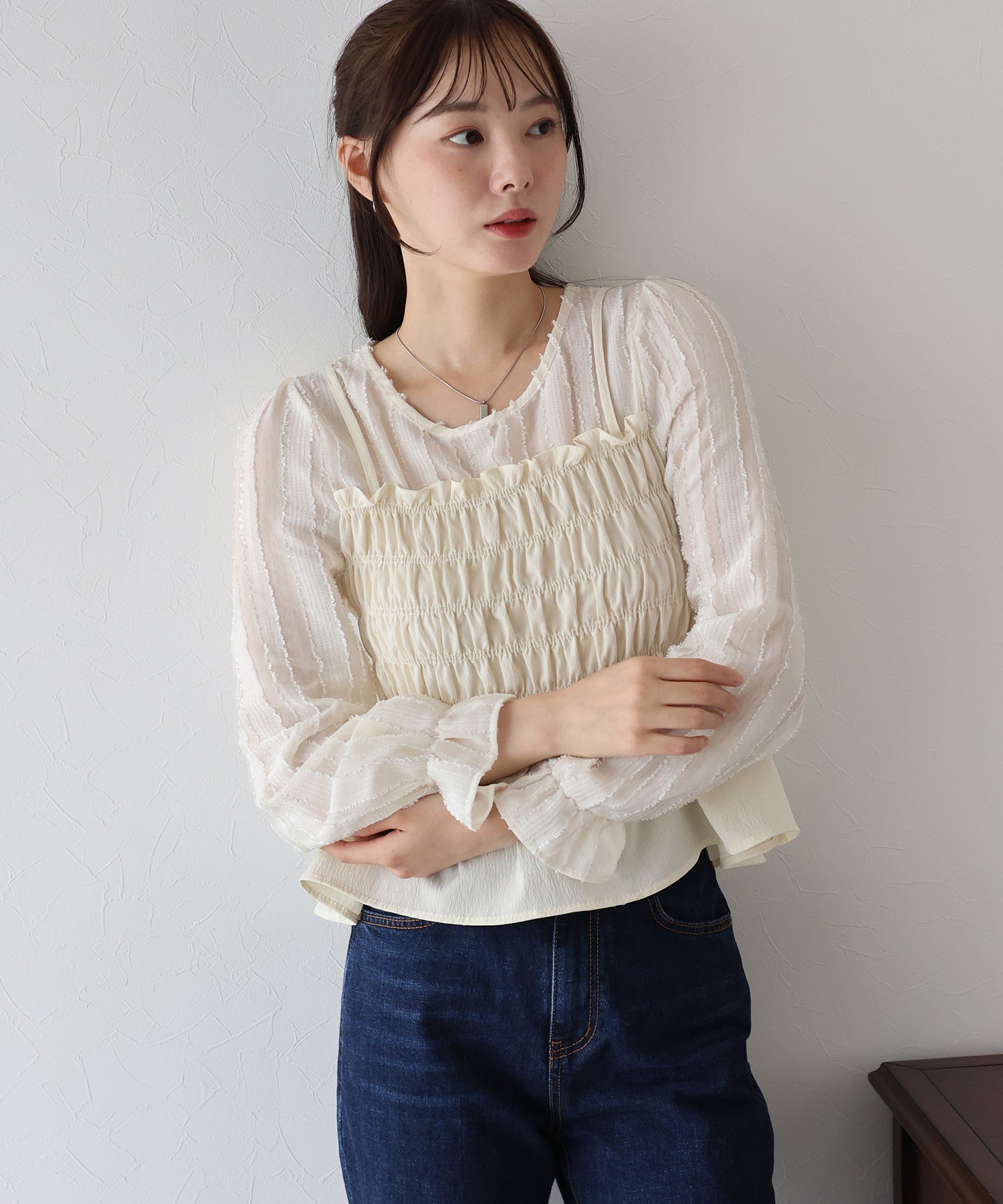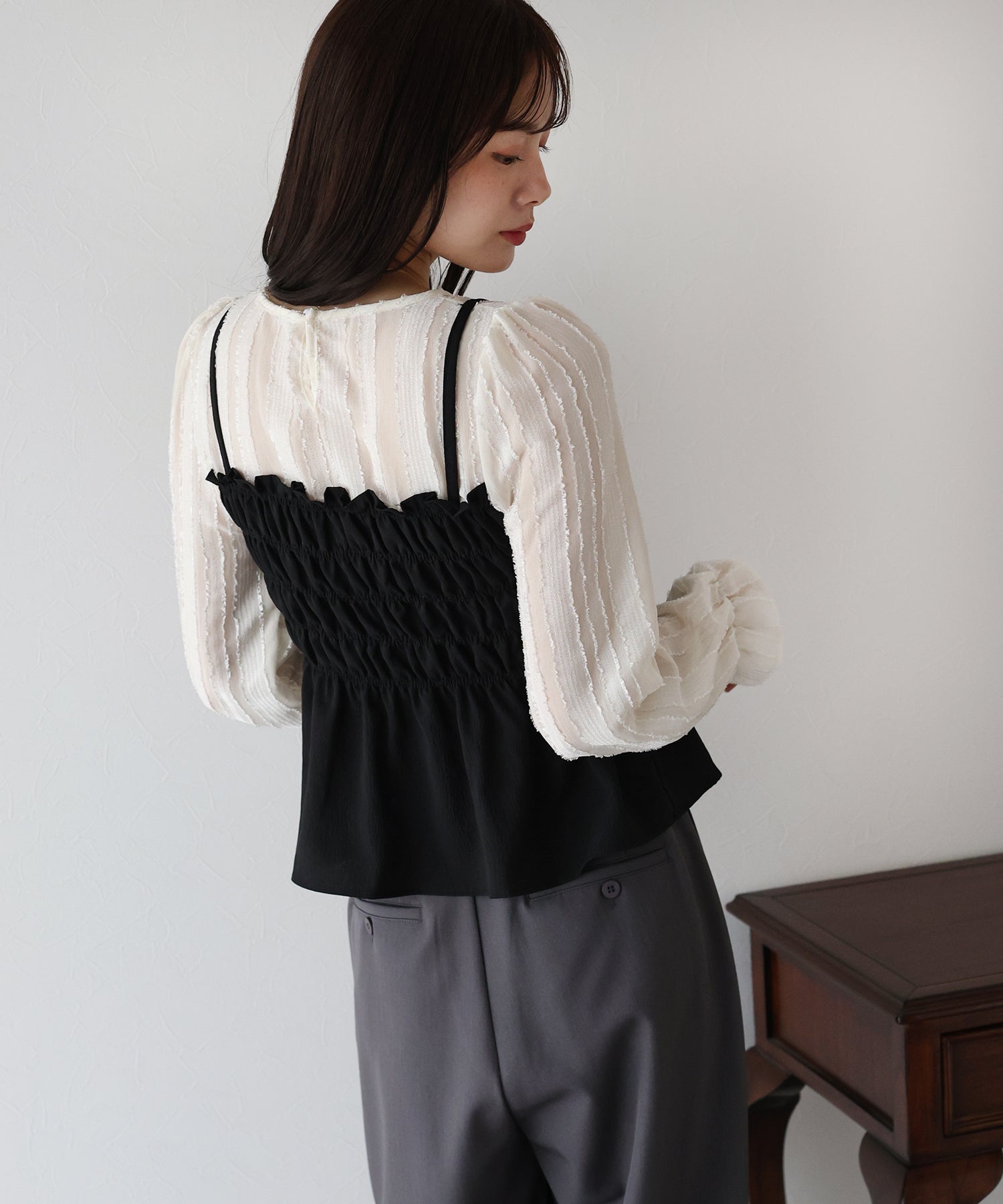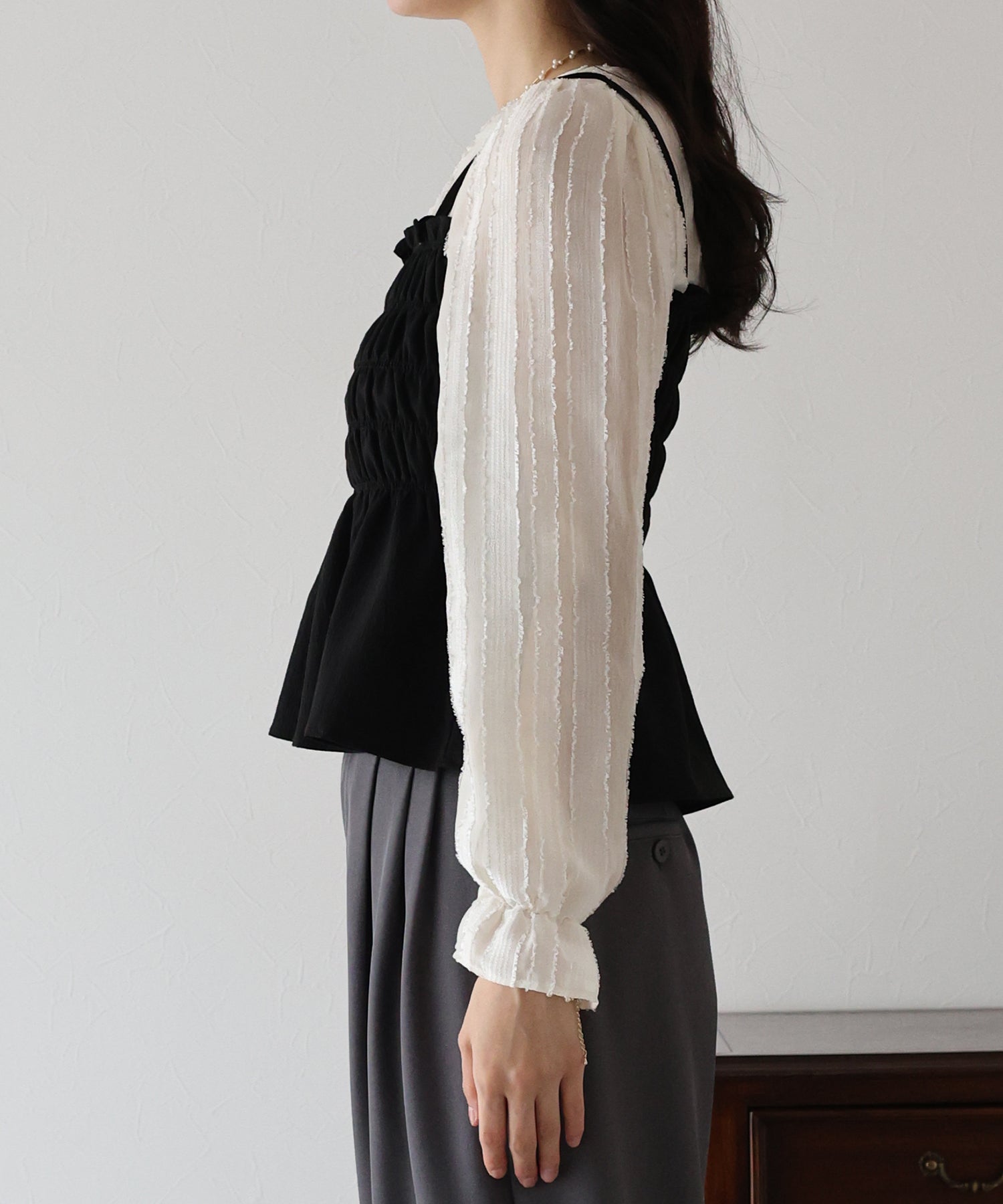 ストライプフリンジ×シャーリングビスチェがお洒落なドッキングブラウス
