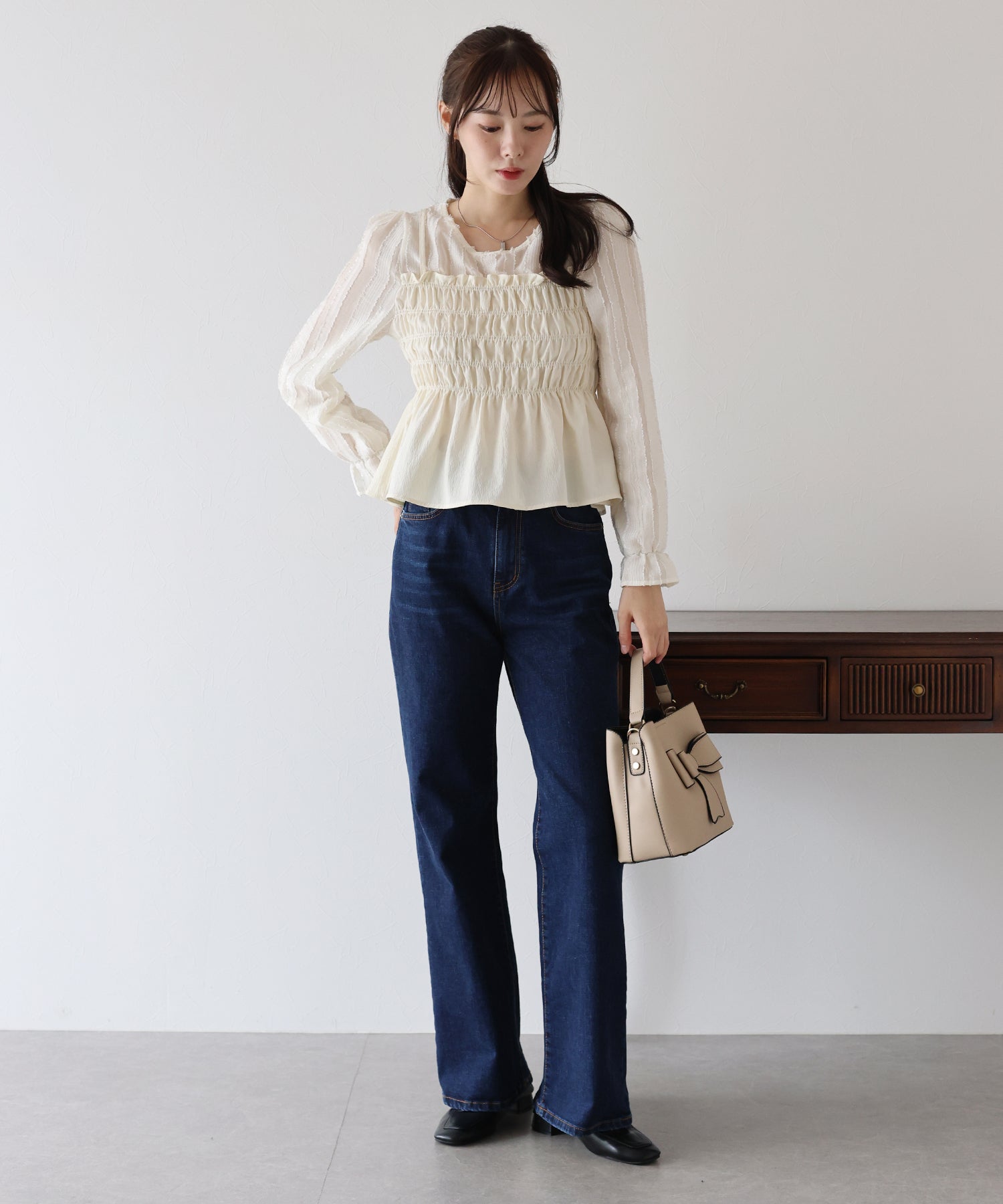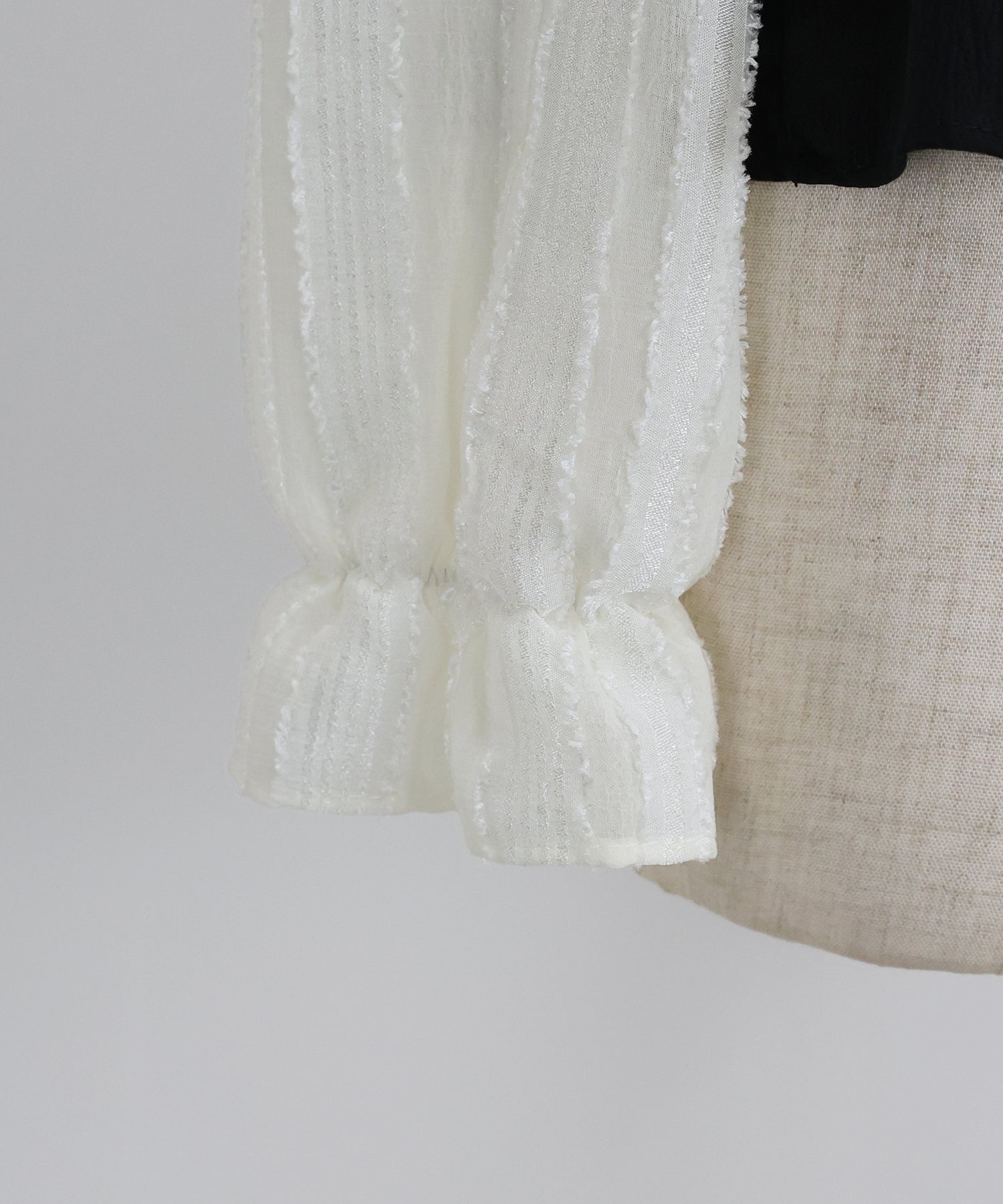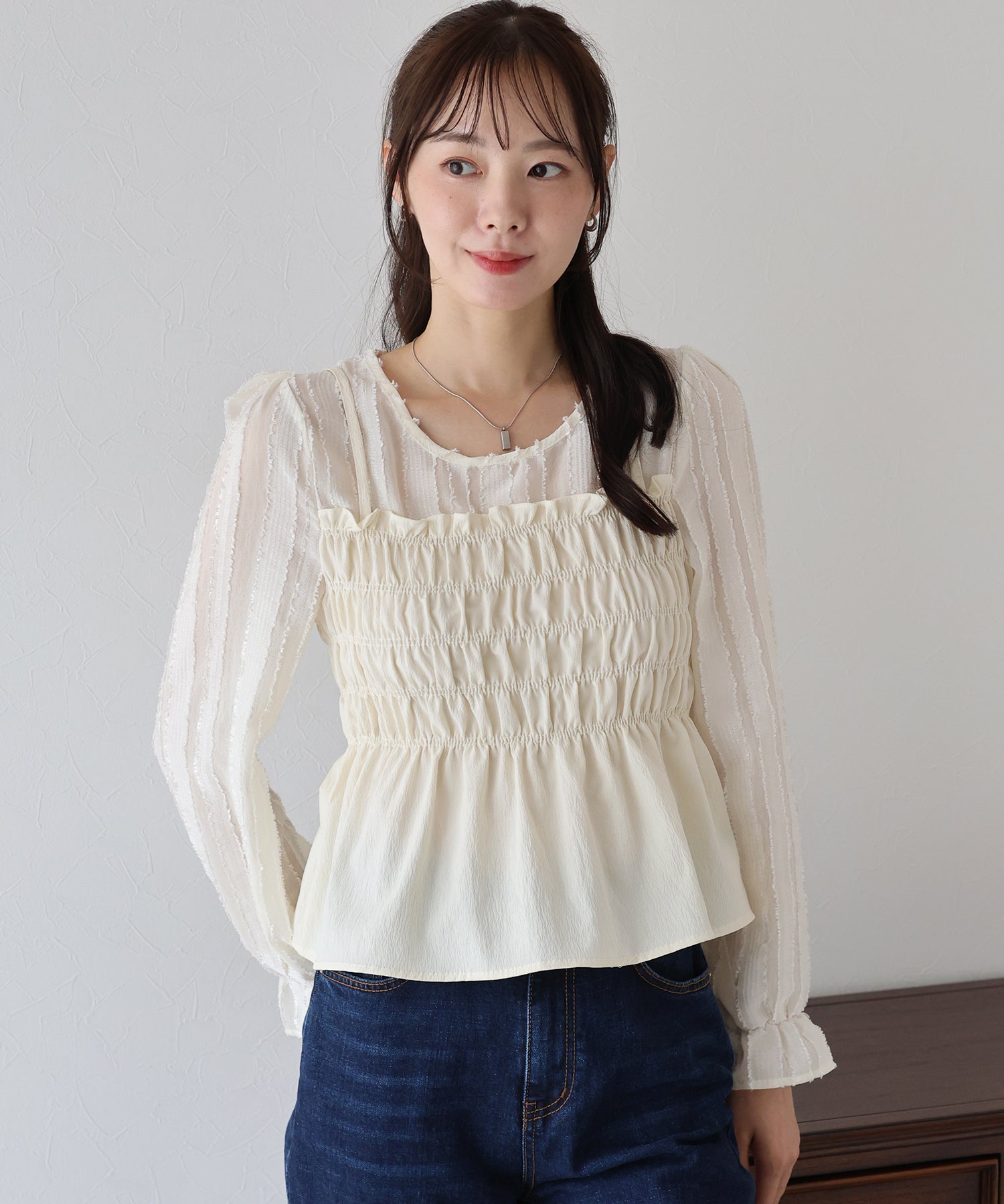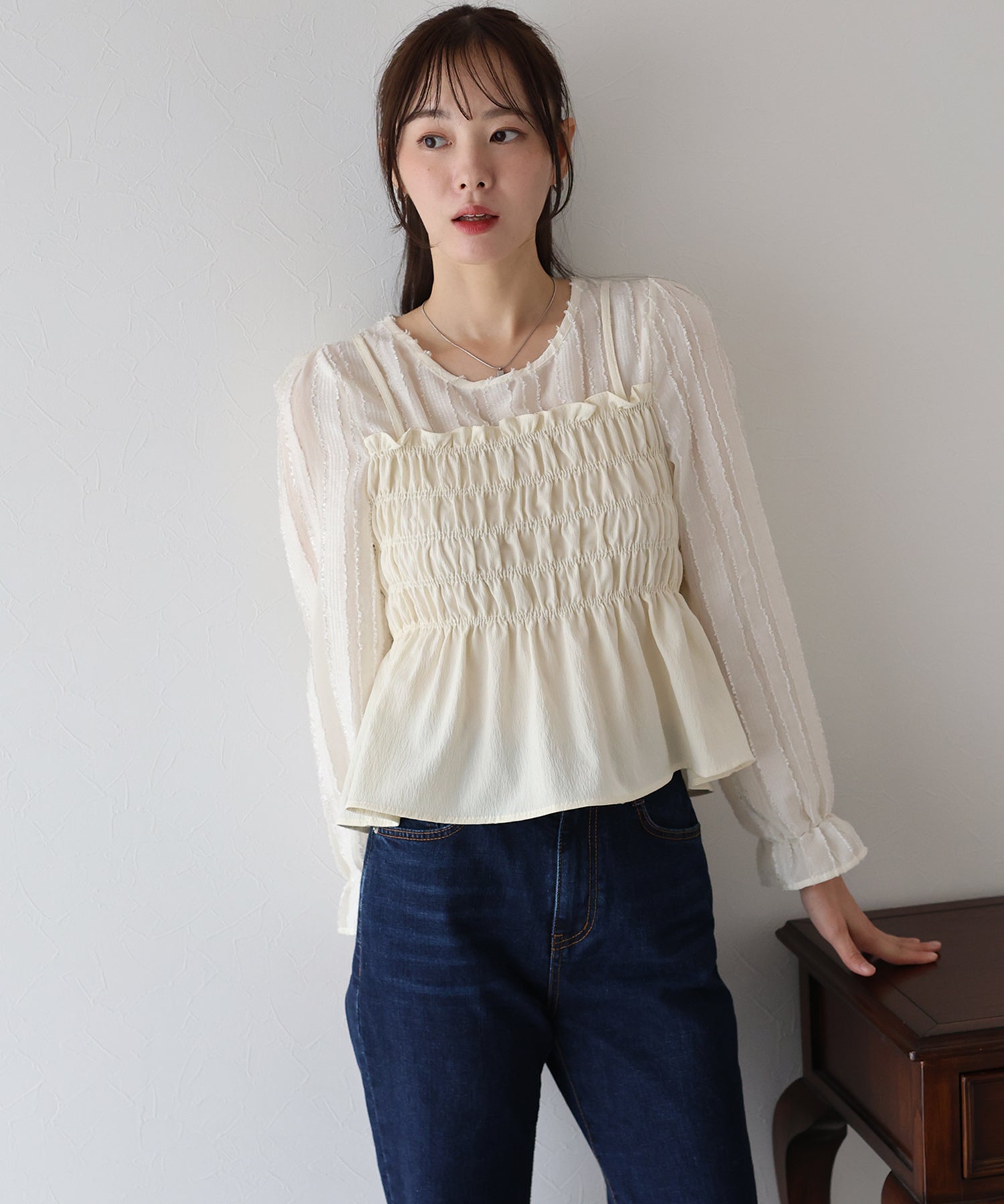ストライプフリンジ×シャーリングビスチェがお洒落なドッキングブラウス