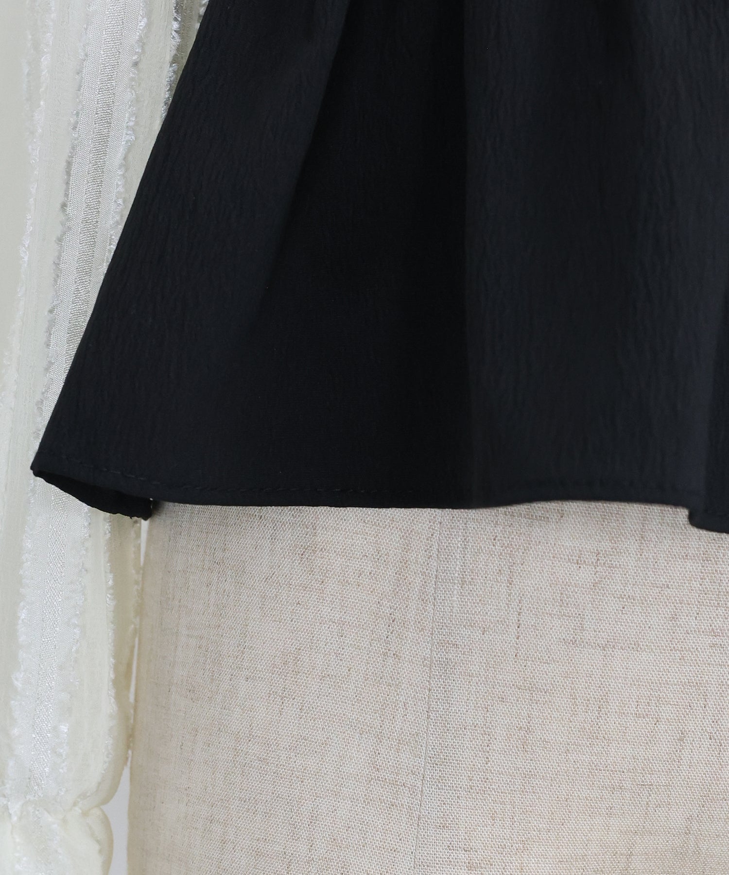 【ブラウス部分】サラッとした透け感のあるブラウス素材 【ビスチェ部分】表面に凹凸感のあるさらっとしたポリエステル素材 |