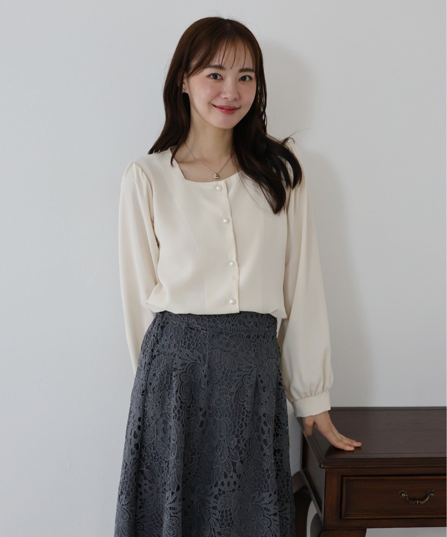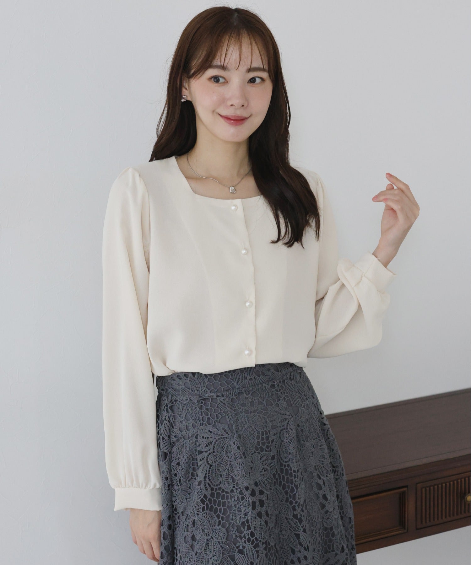 【早割5%OFF】スクエアネックパールボタンブラウス【ネコポス】