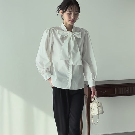 首元の大きめリボンが目を惹くボウタイシャツ。
