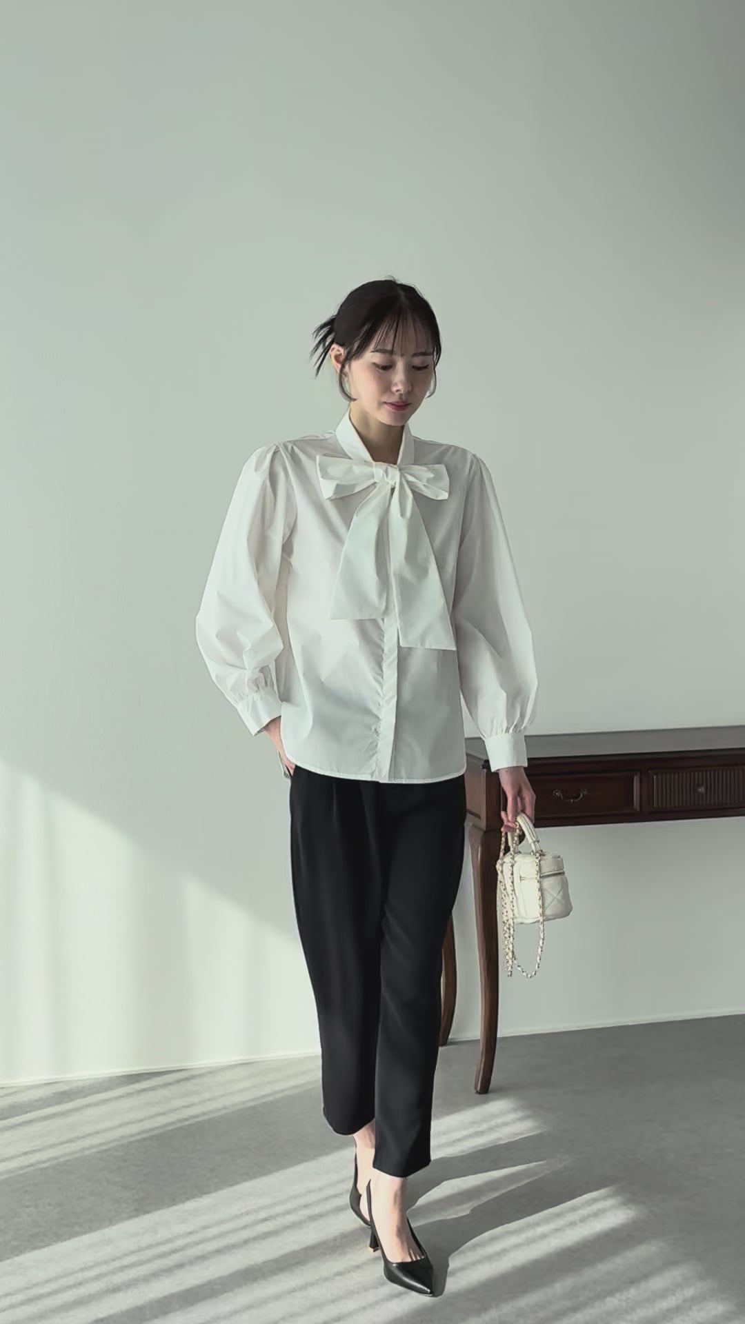 上品でクラシカルな雰囲気を漂わせるボウタイブラウス