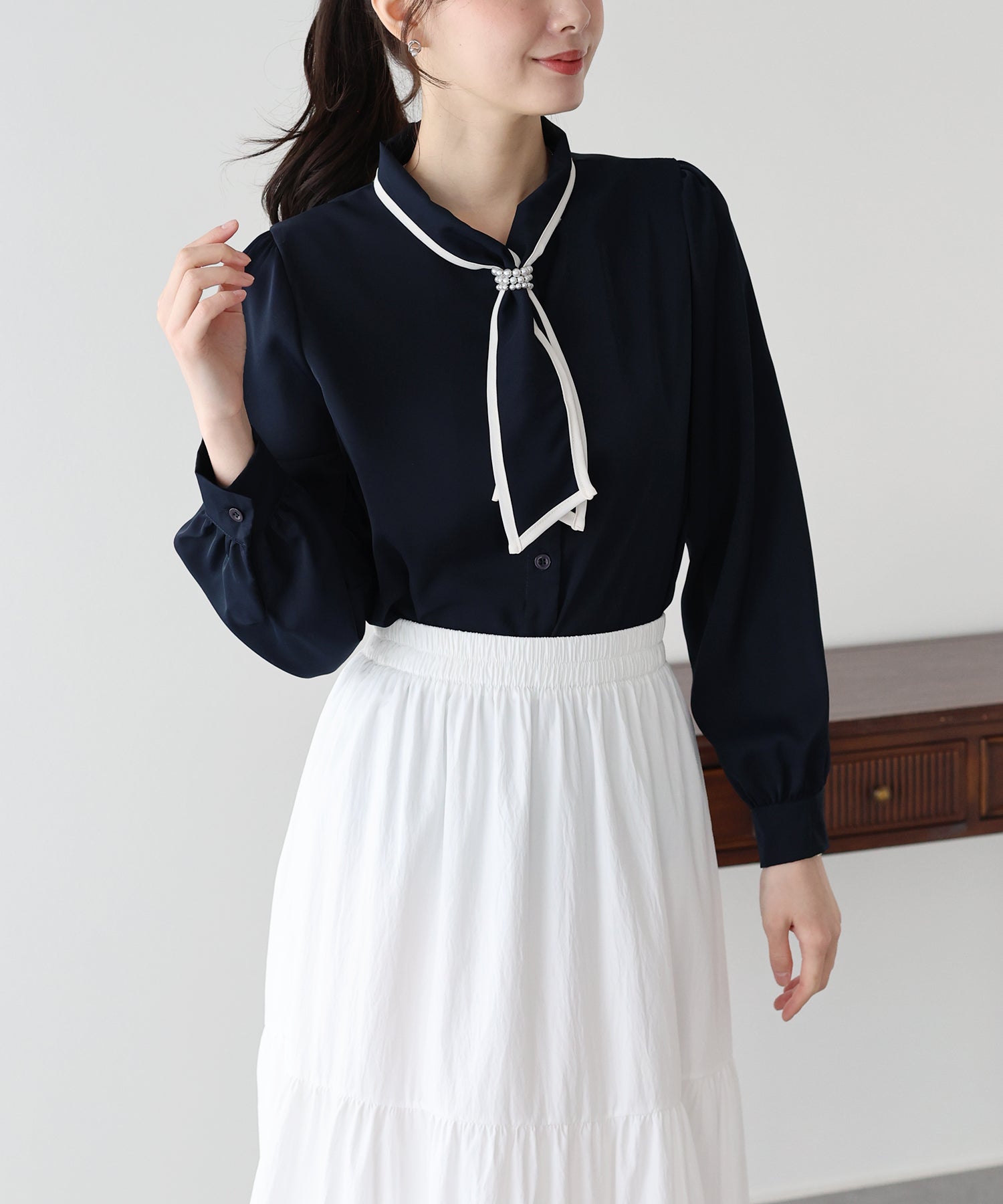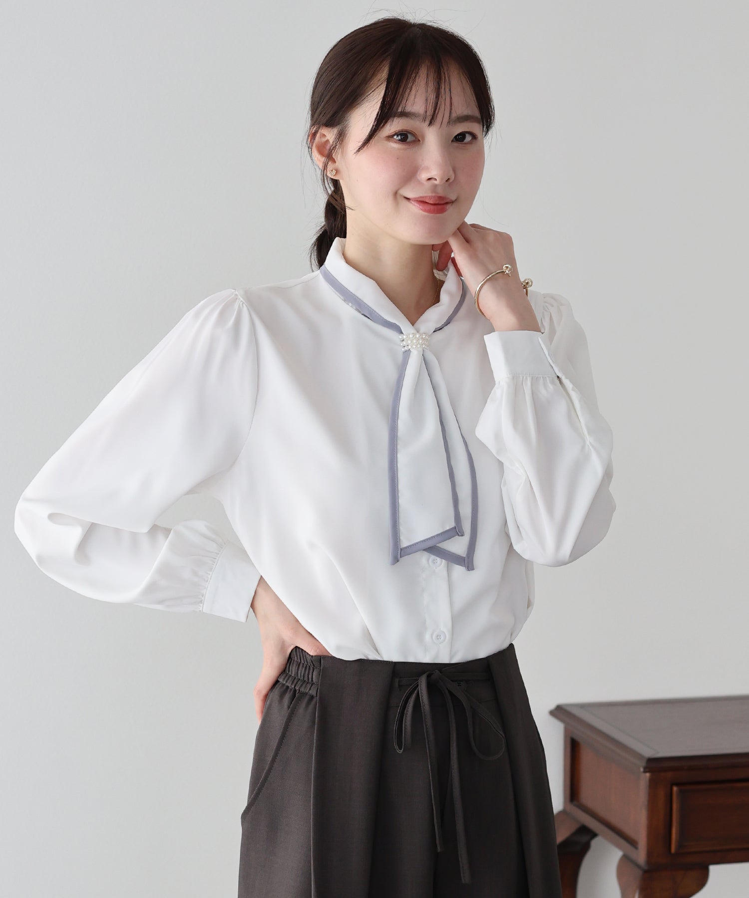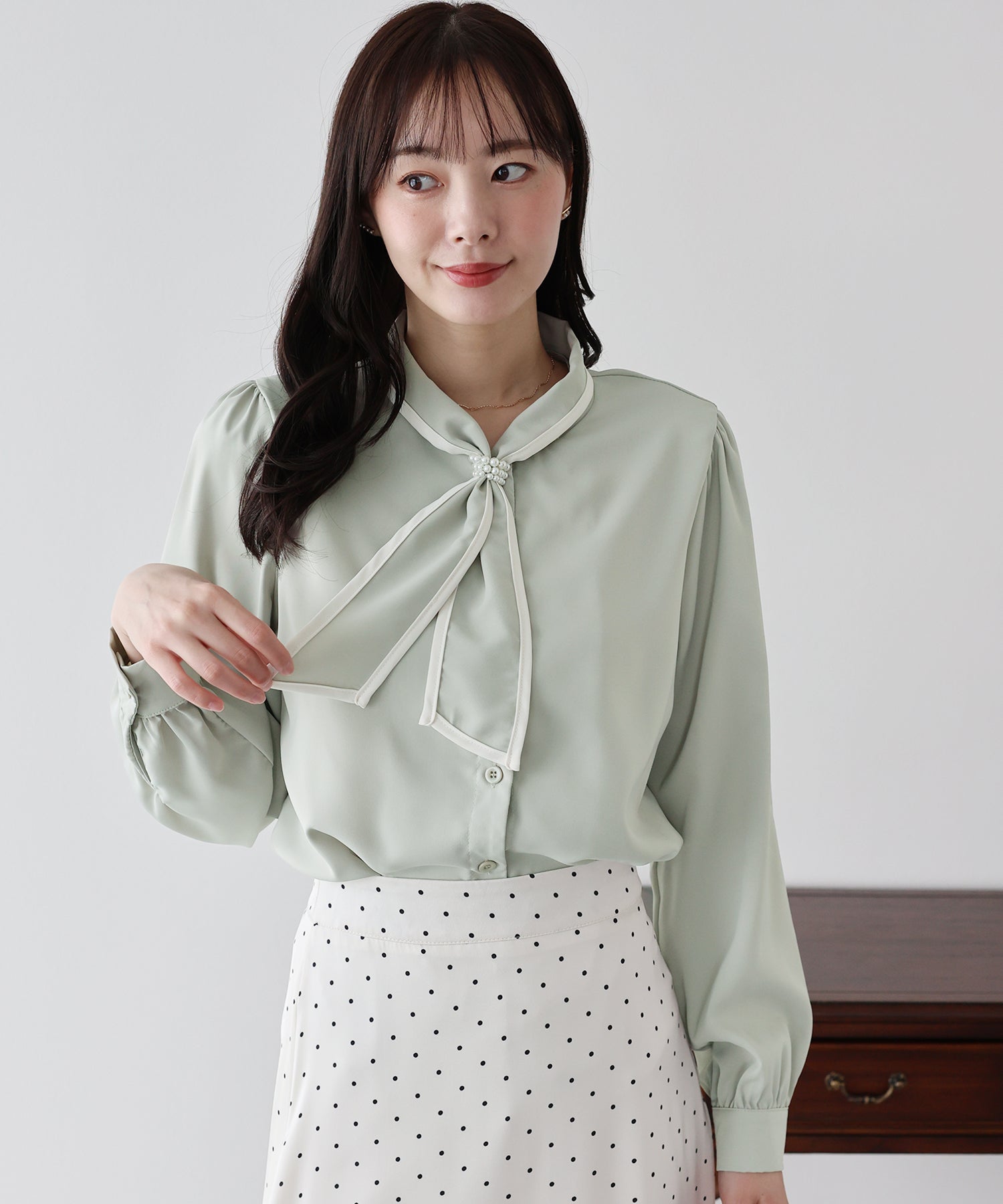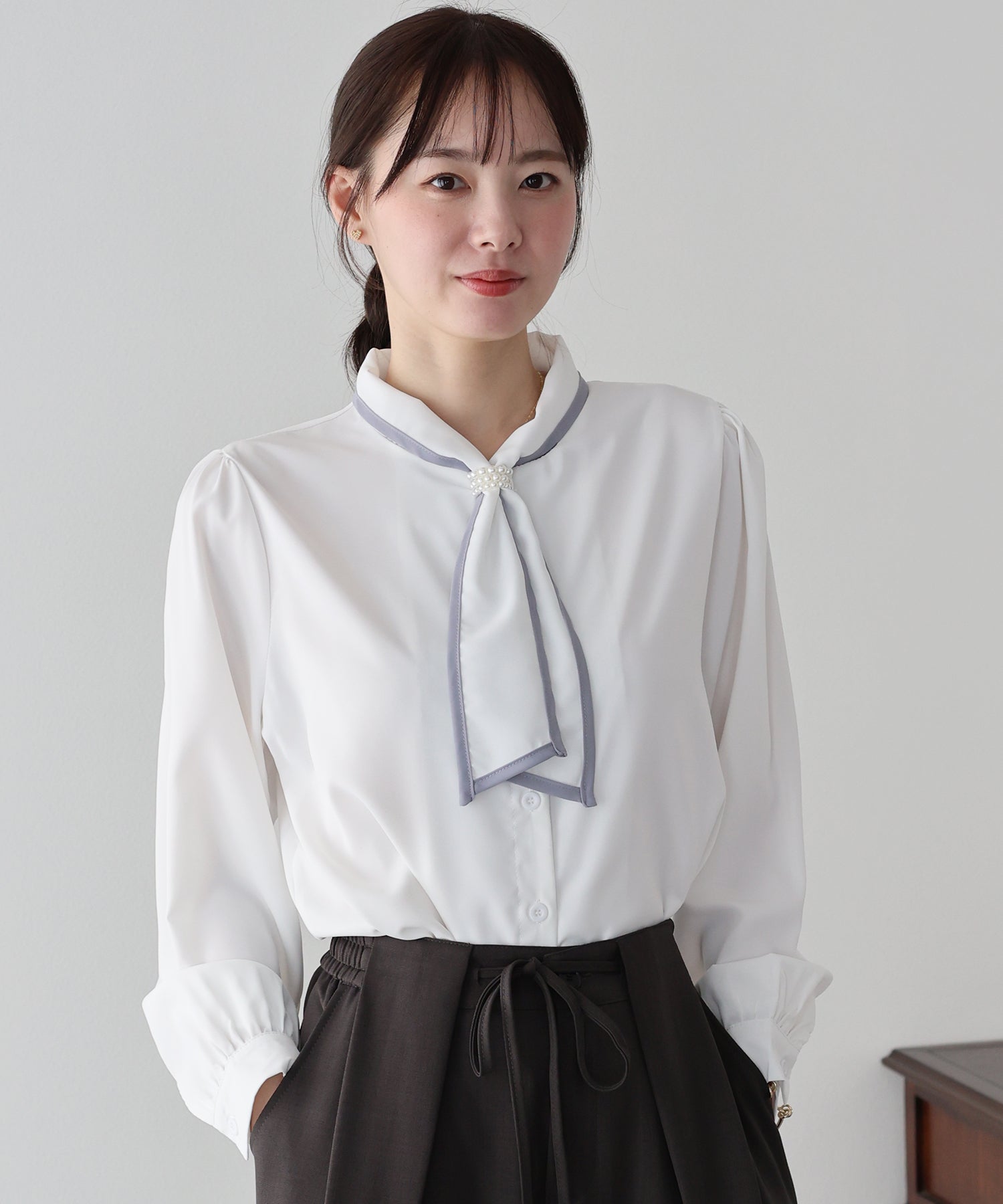 パールのリボンループとリボンタイで上品な女性らしさをプラス。
