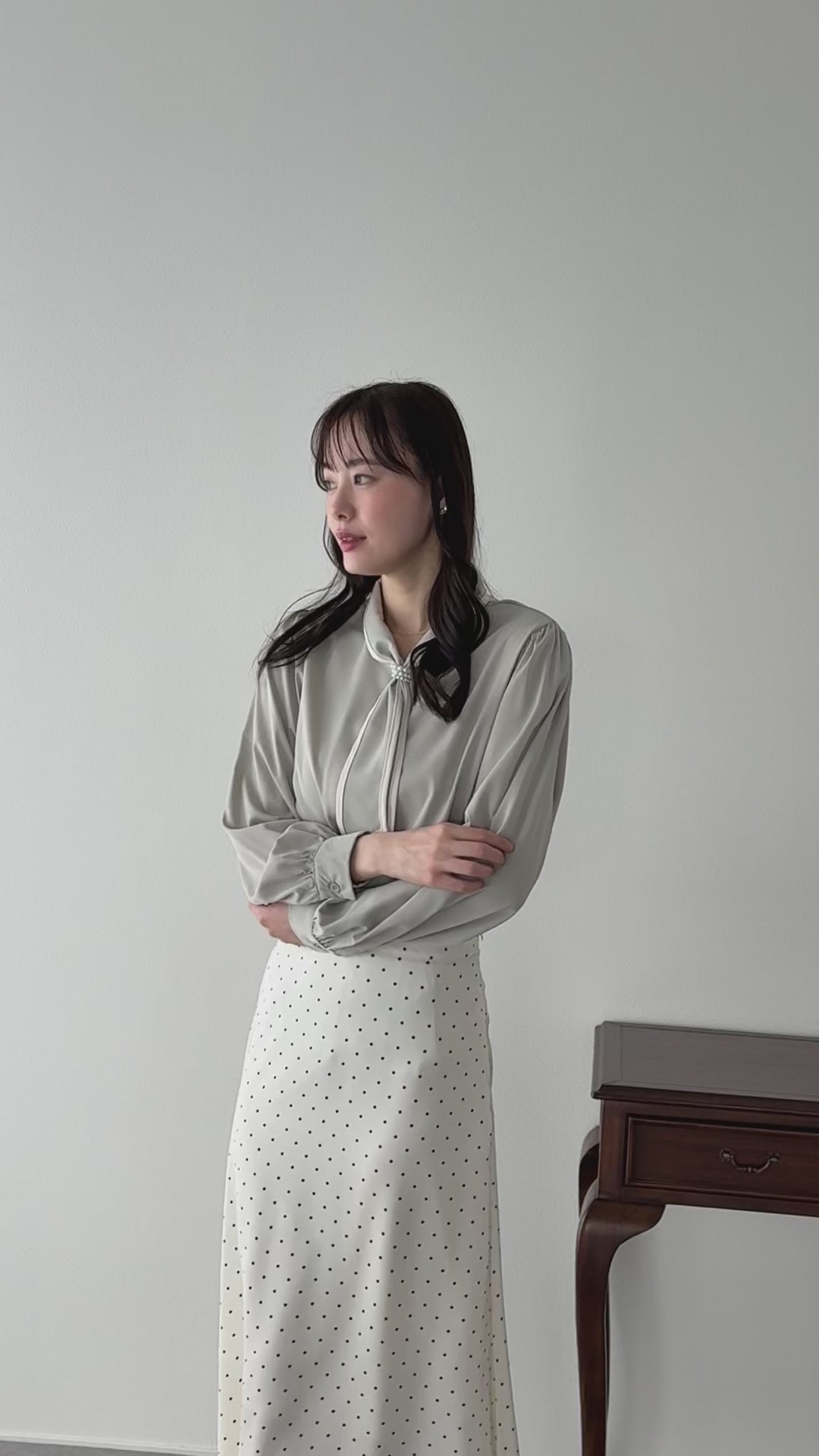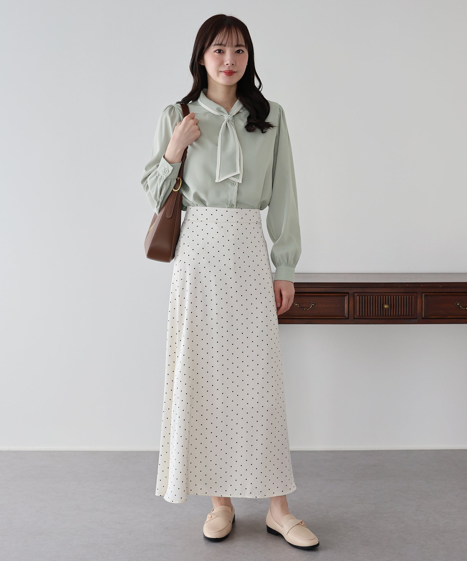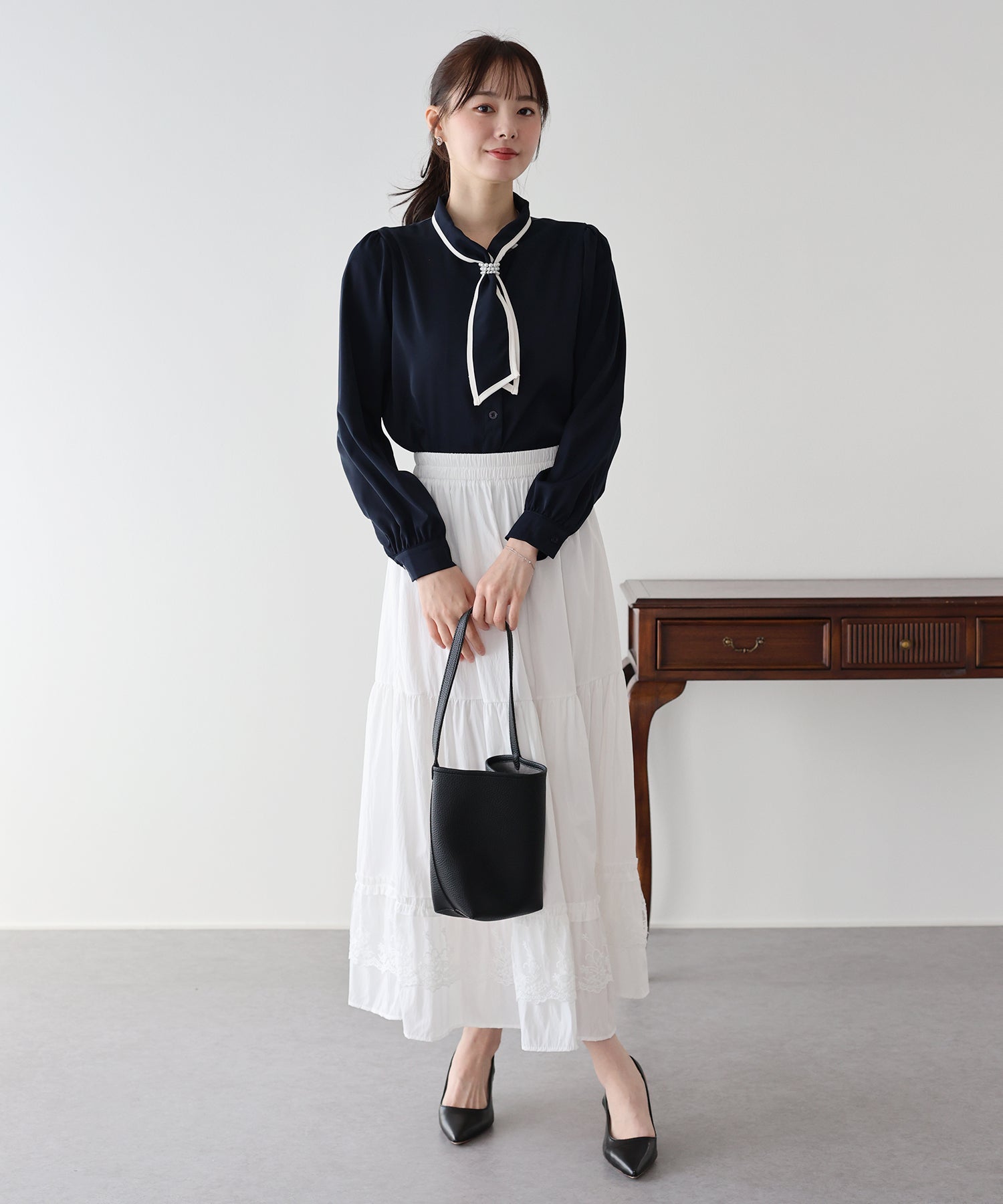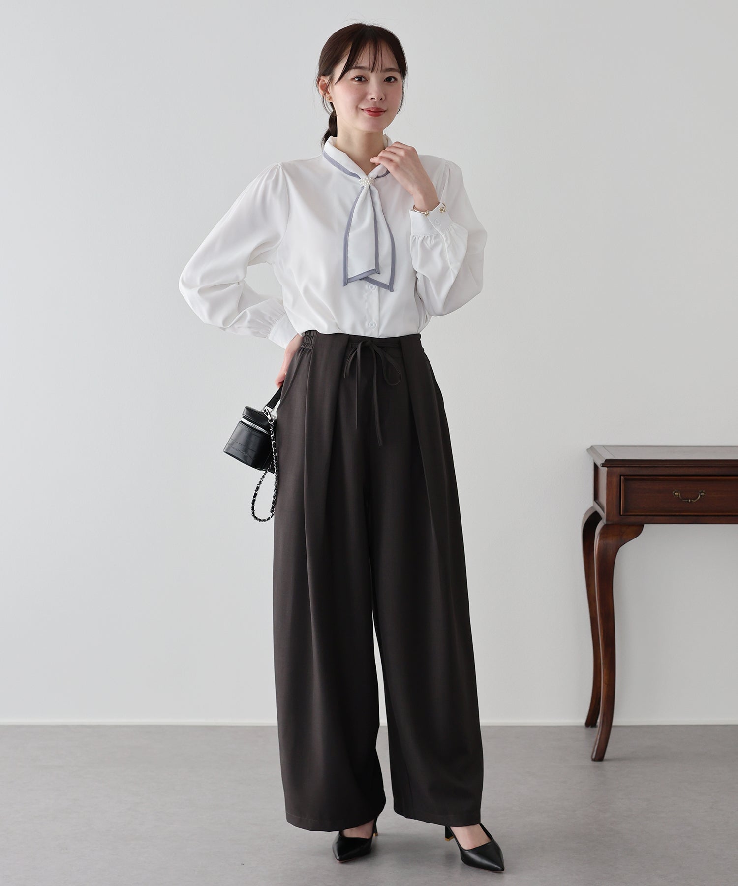 パールのリボンループとリボンタイで上品な女性らしさをプラス。