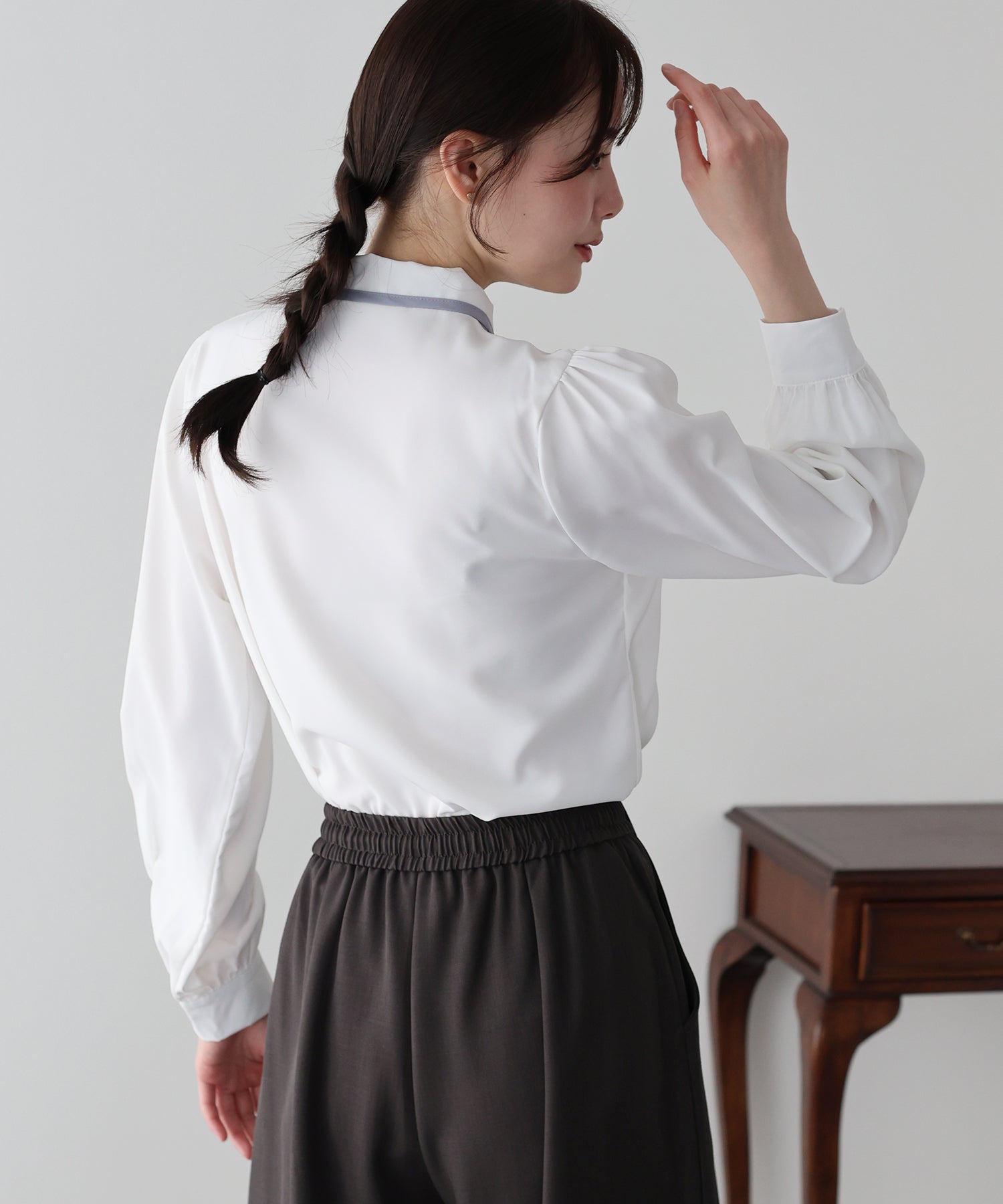 一枚でも、オフィスカジュアルにぴったりのジャケットインでも決まるキレイめブラウス。