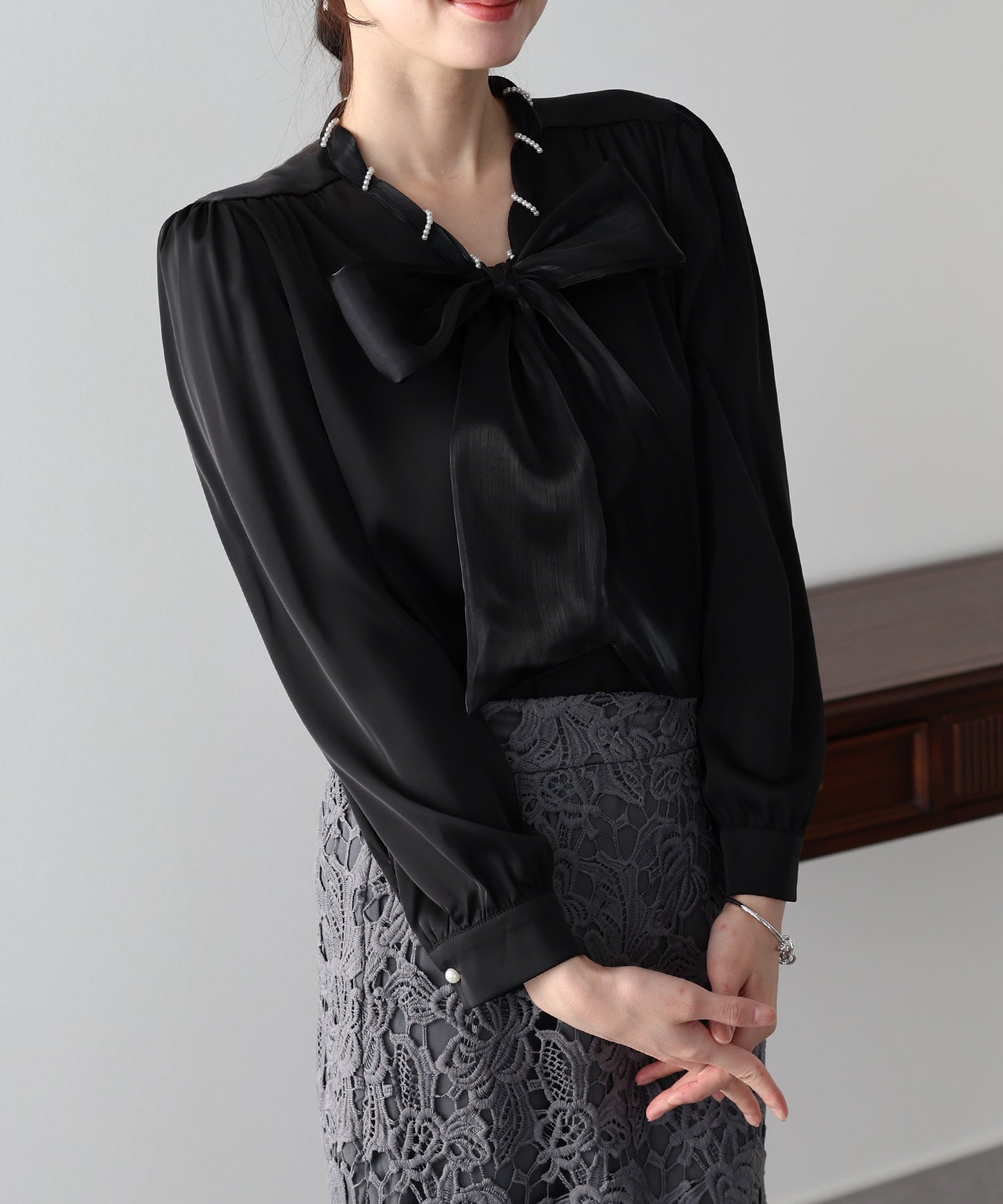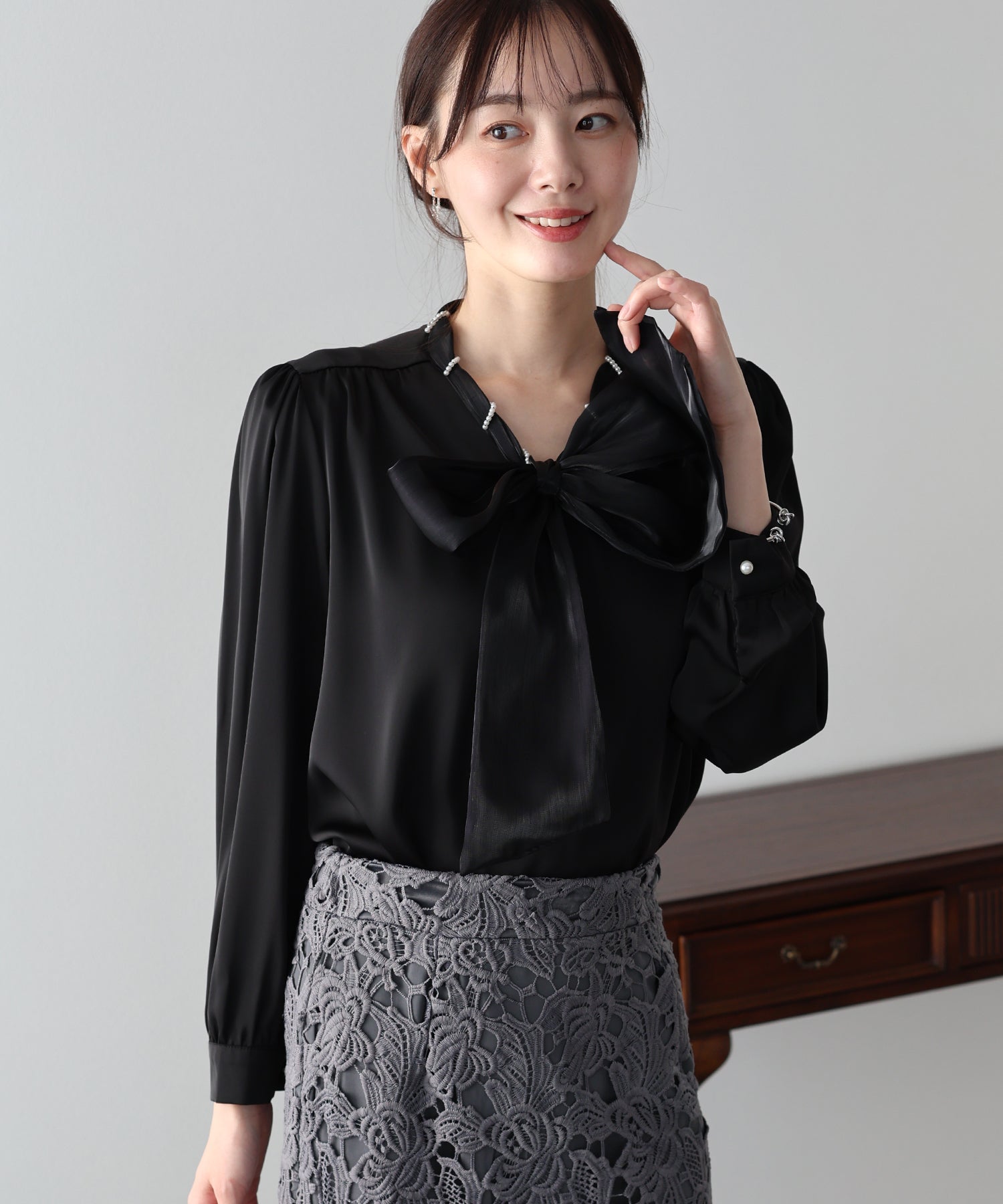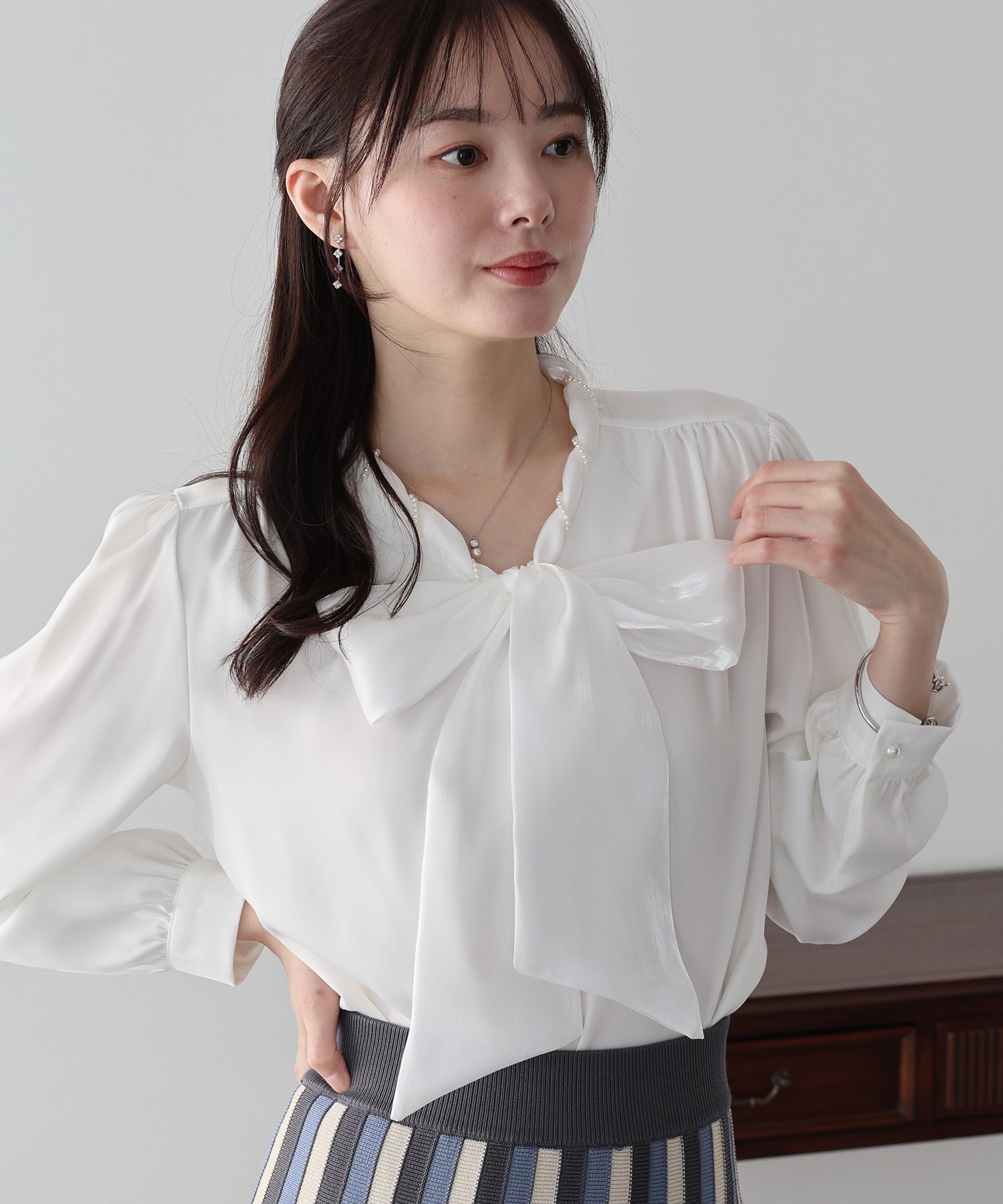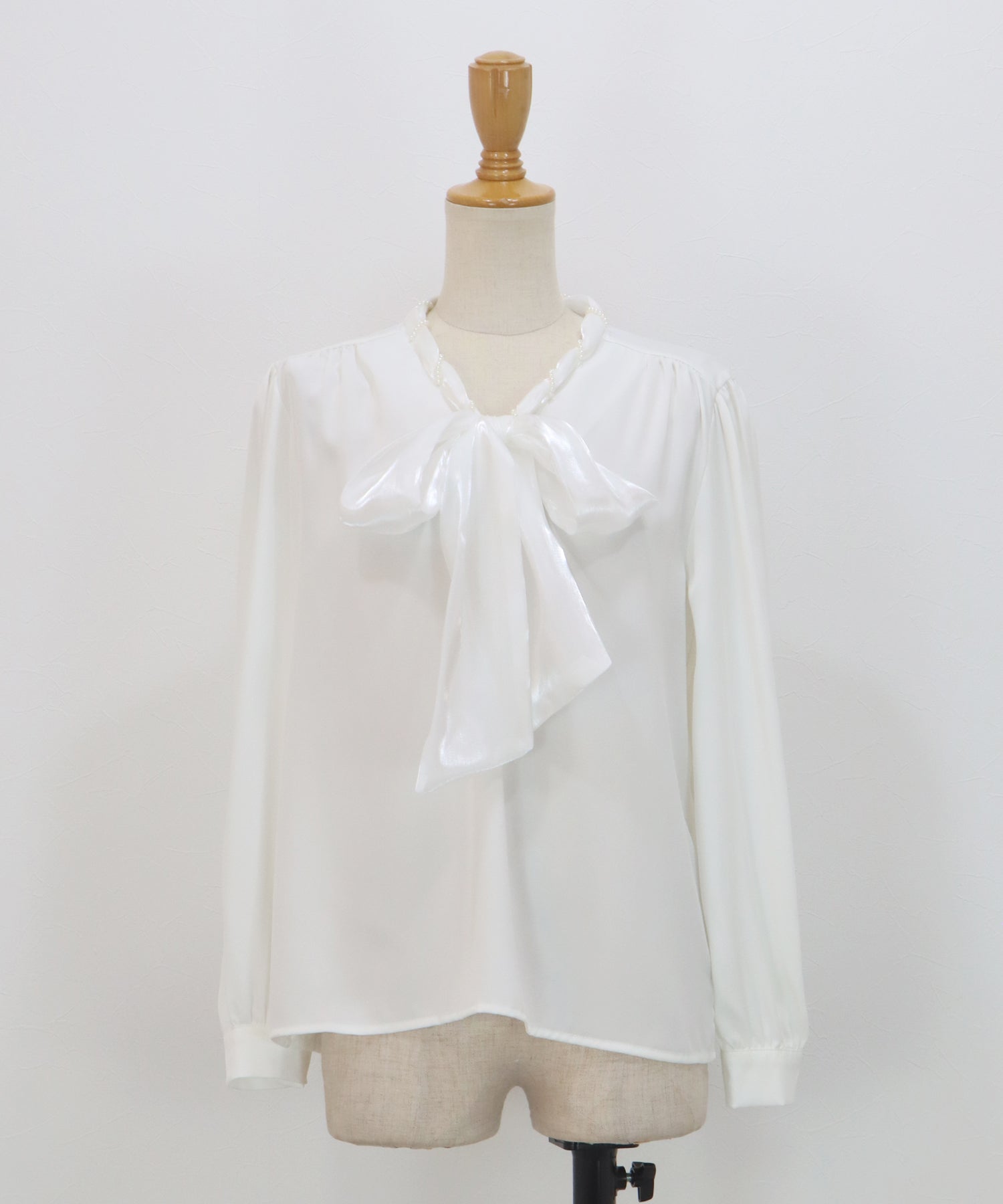 一枚でレディに仕上がるパールボウタイブラウス