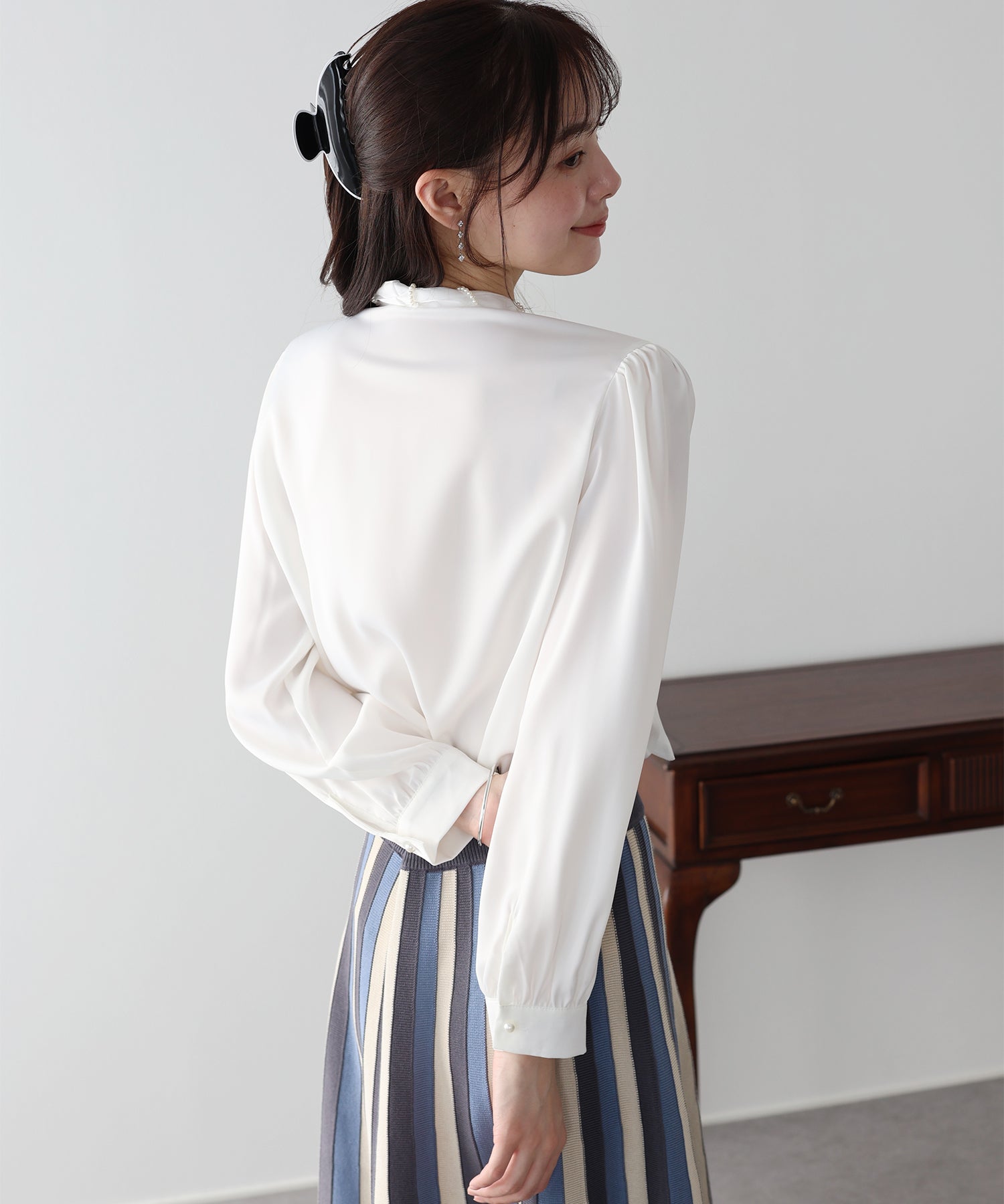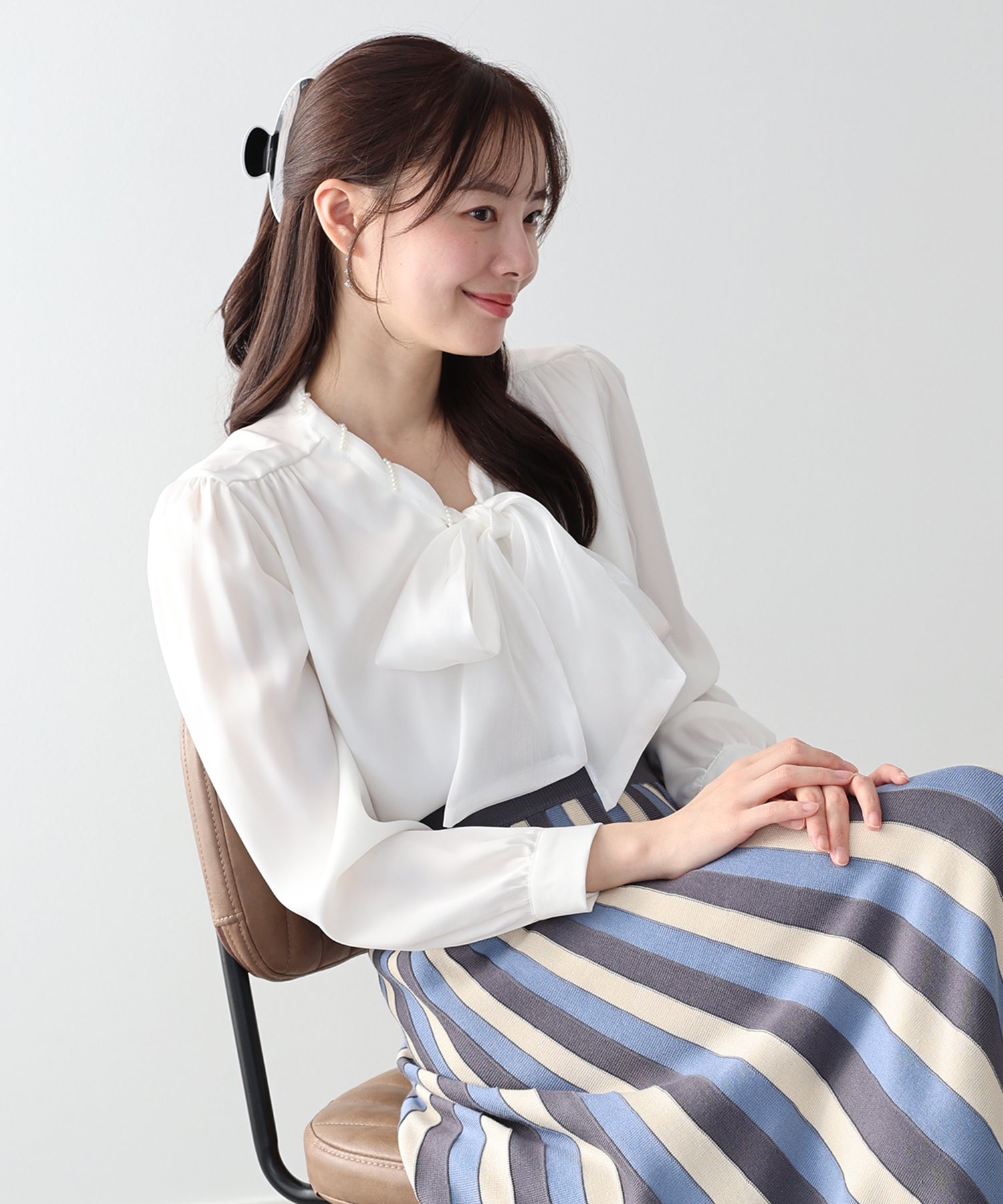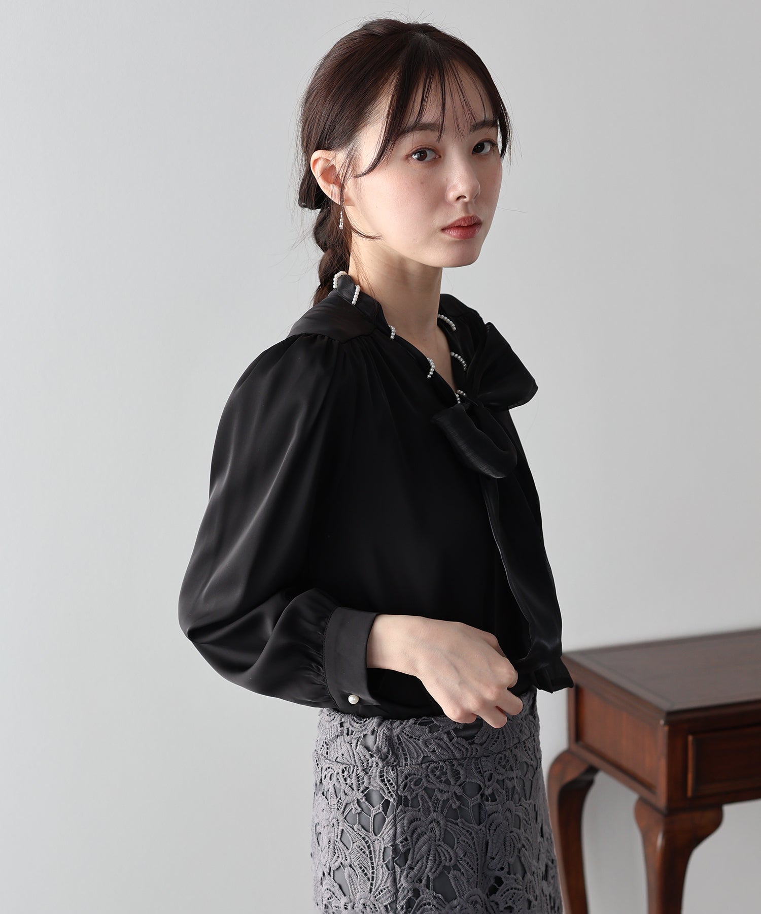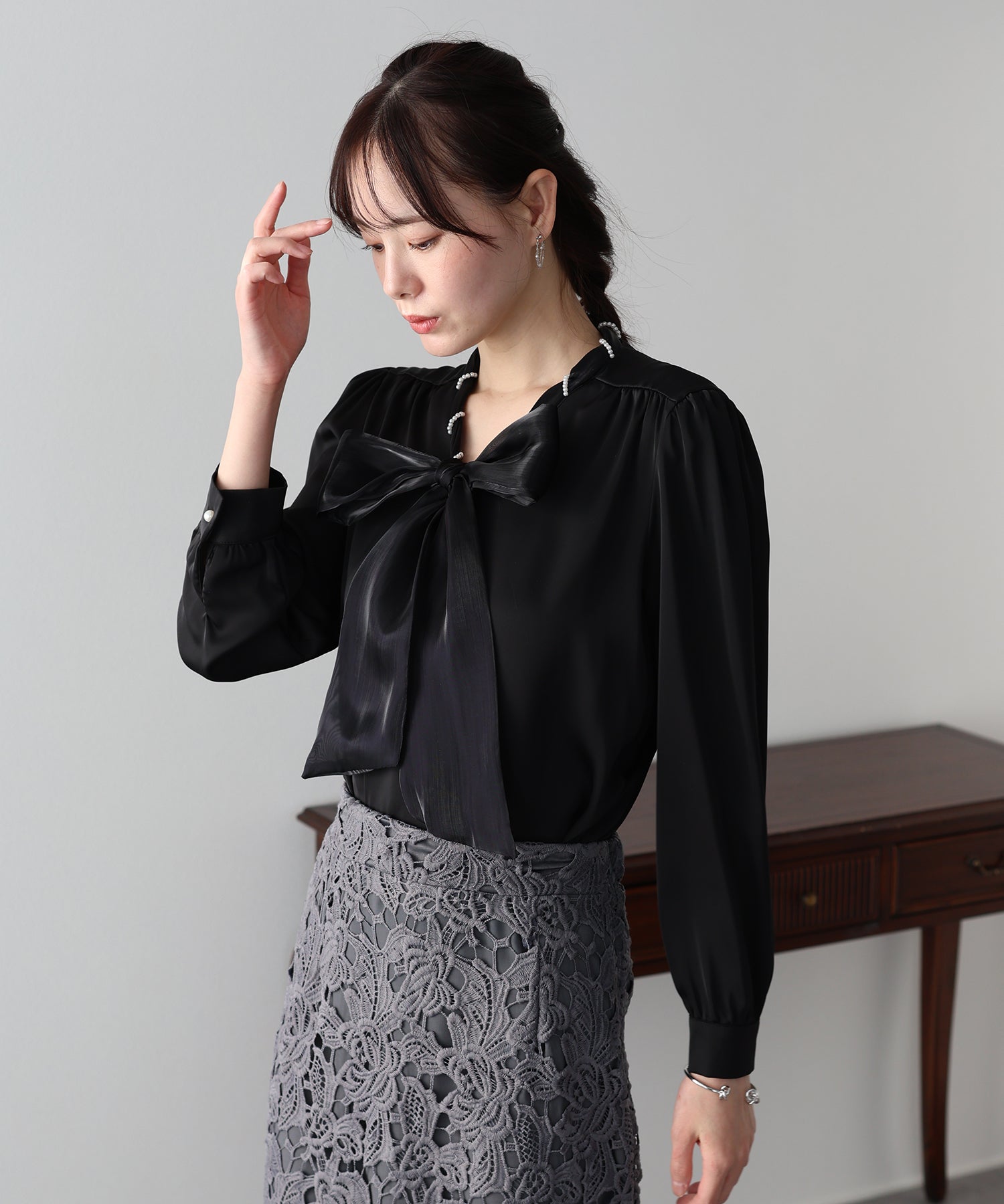 一枚でレディに仕上がるパールボウタイブラウス