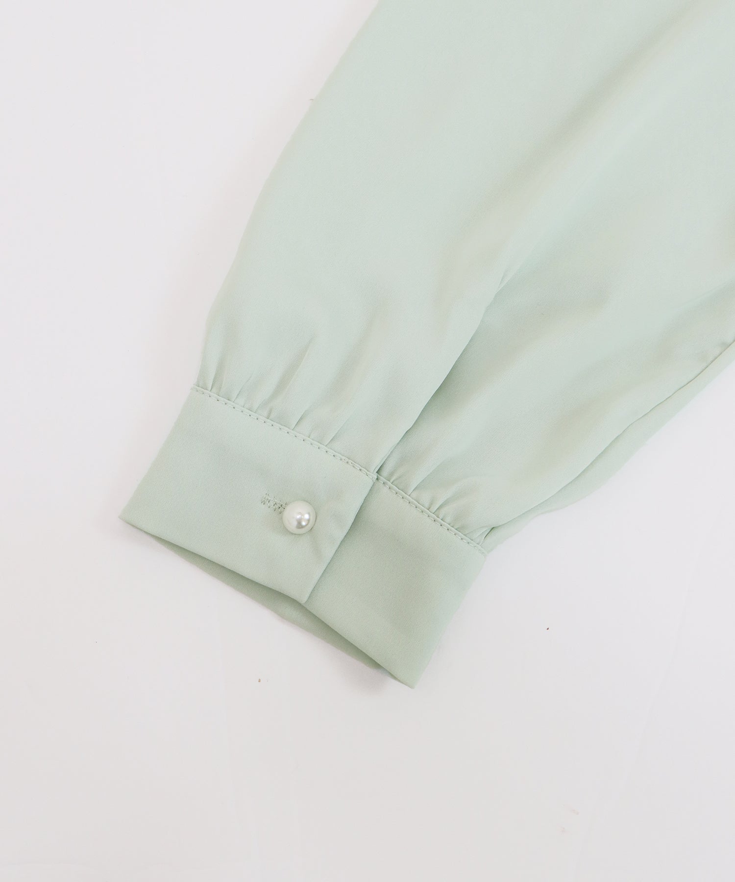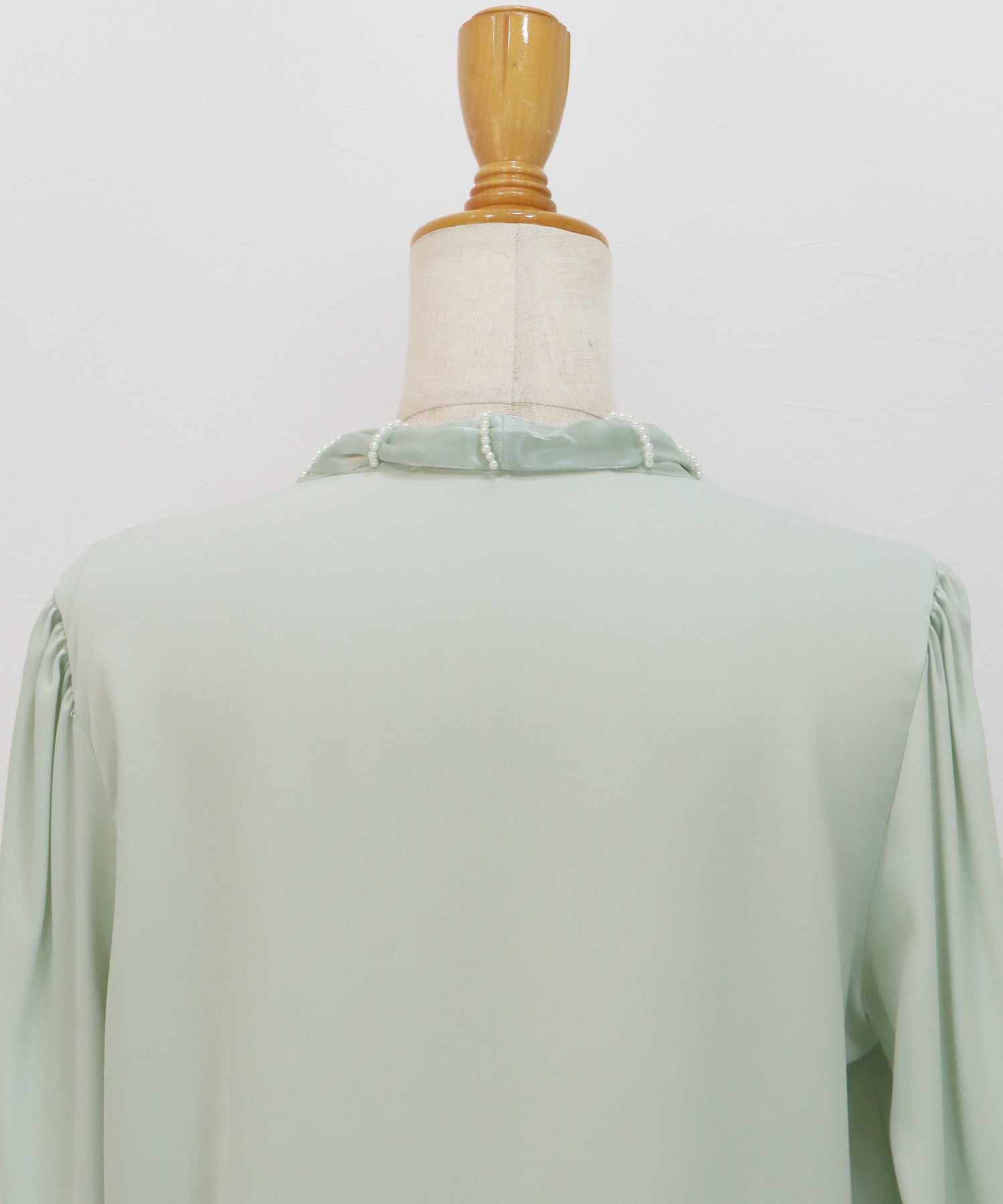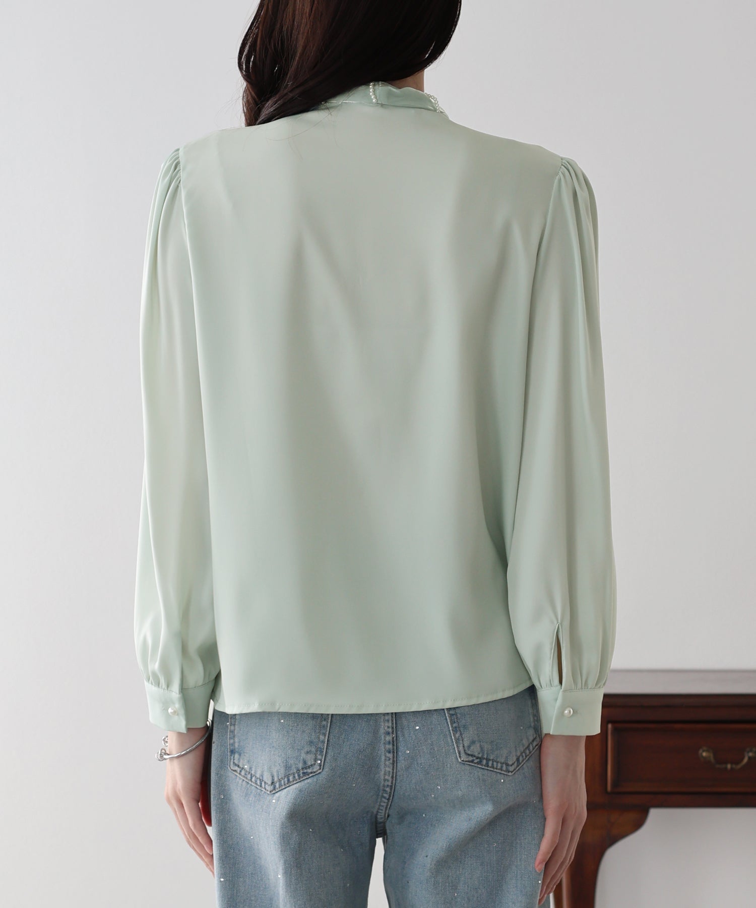 襟元に施された小粒のパールが、アクセサリーなしでも顔周りをパッと華やかに、そして清楚な印象に演出します。