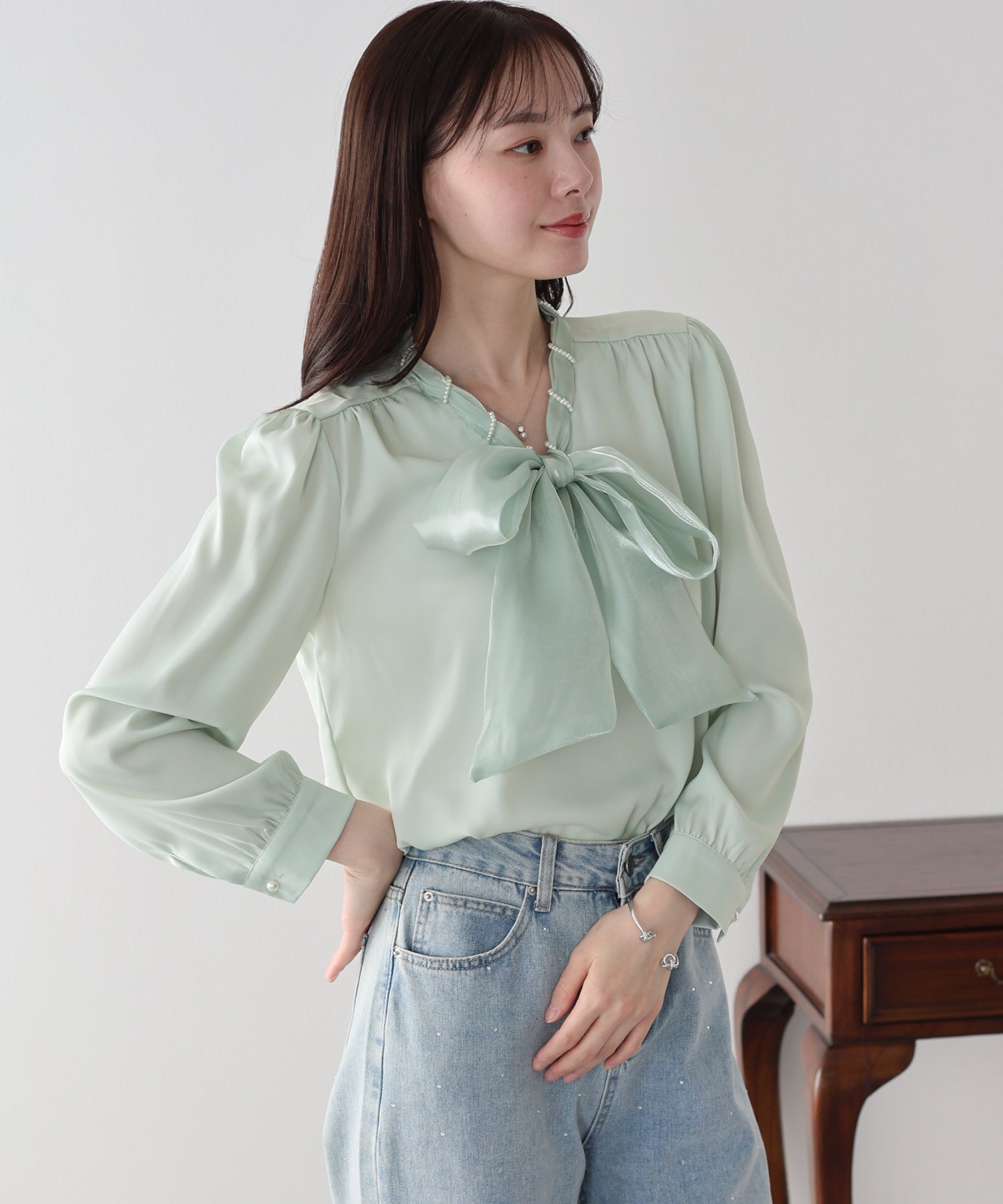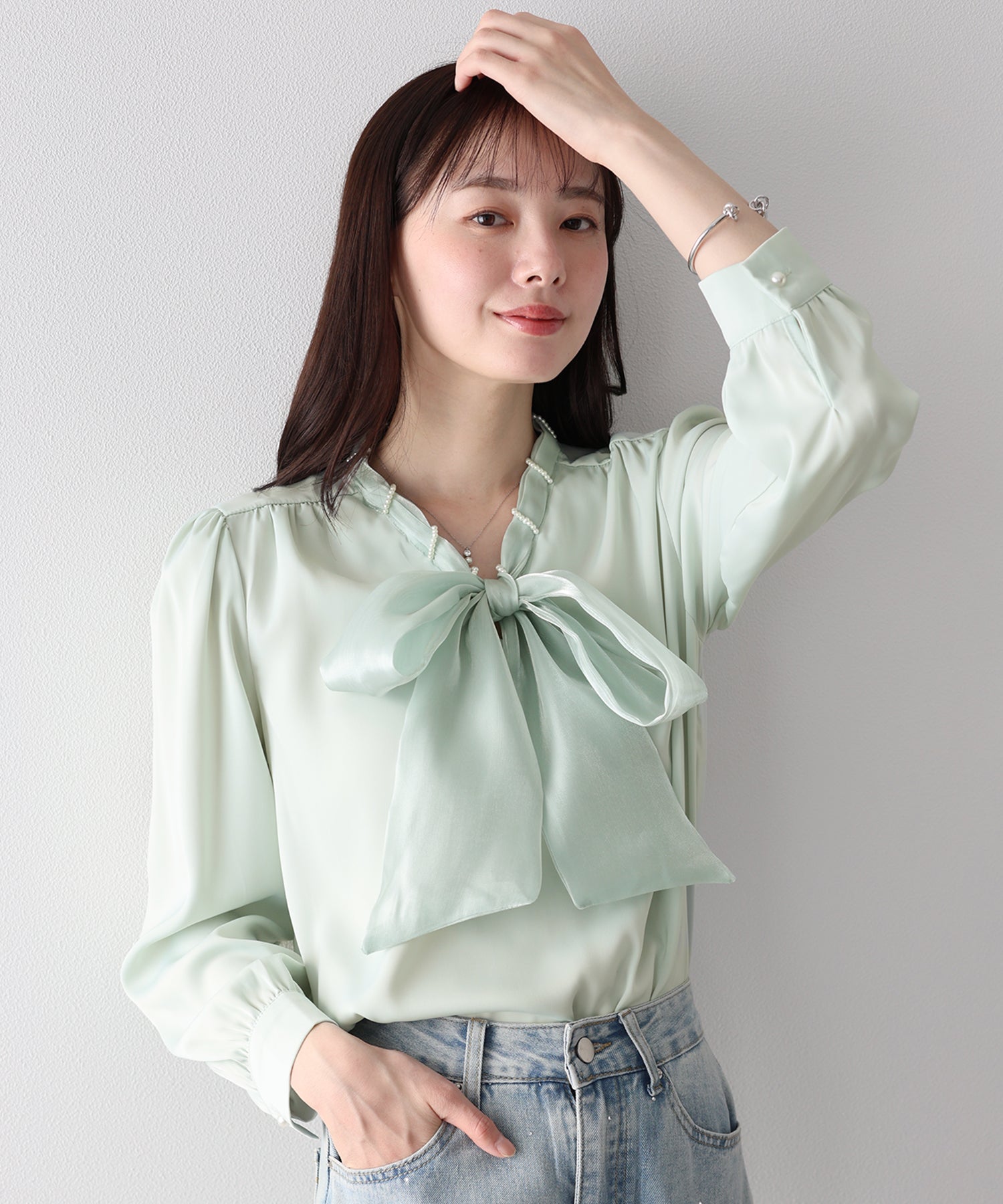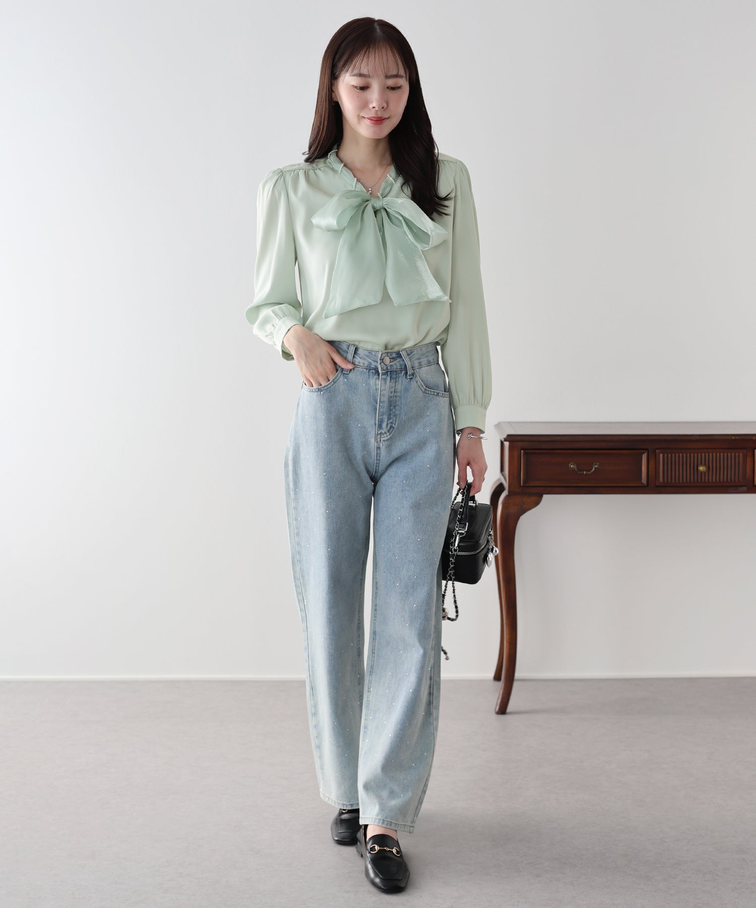 デニムと合わせれば、パールとボウタイの甘さが程よく中和された、洗練された大人カジュアルが完成します。