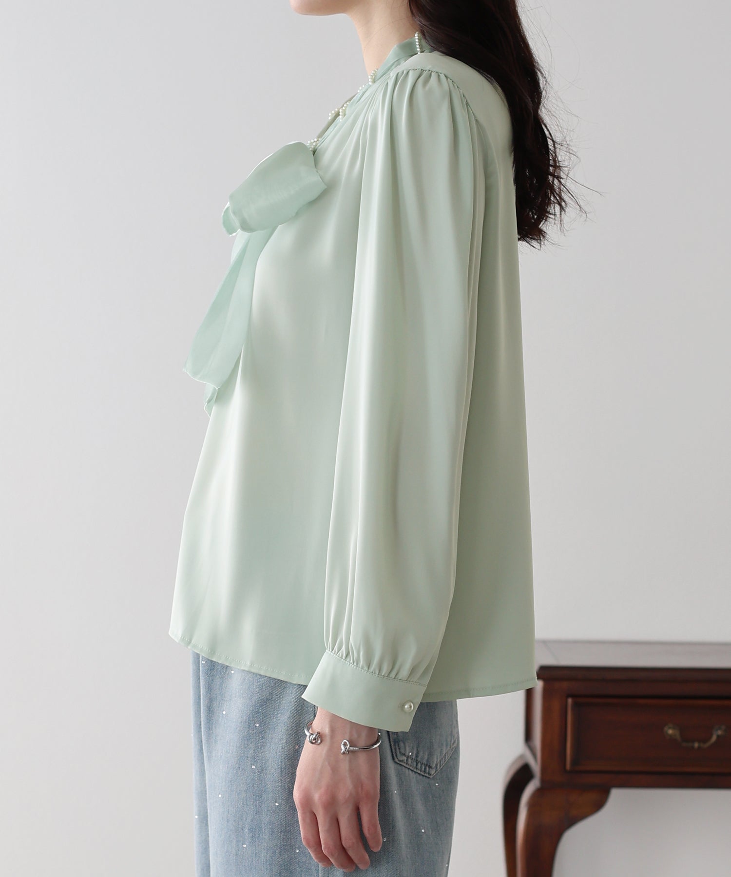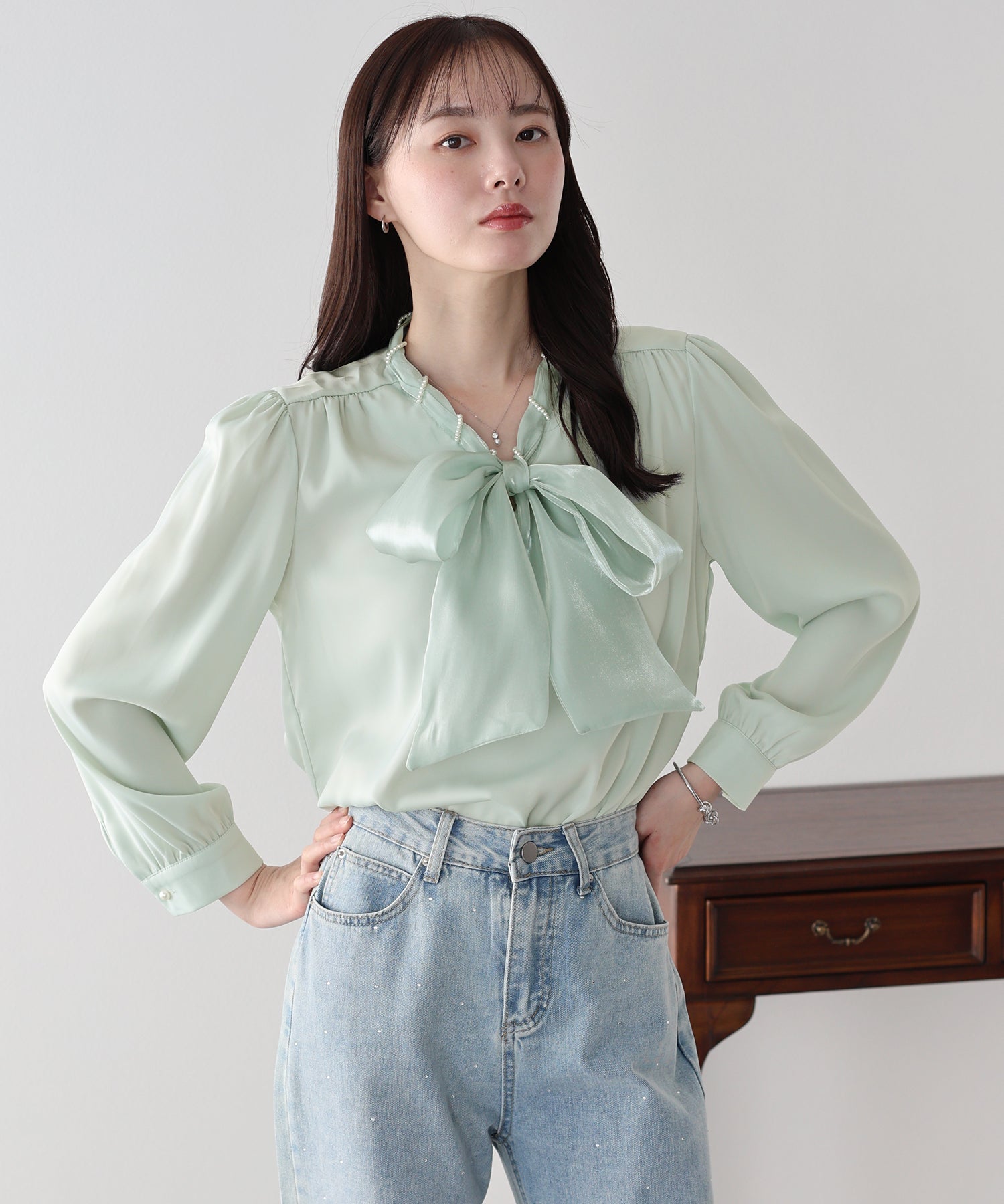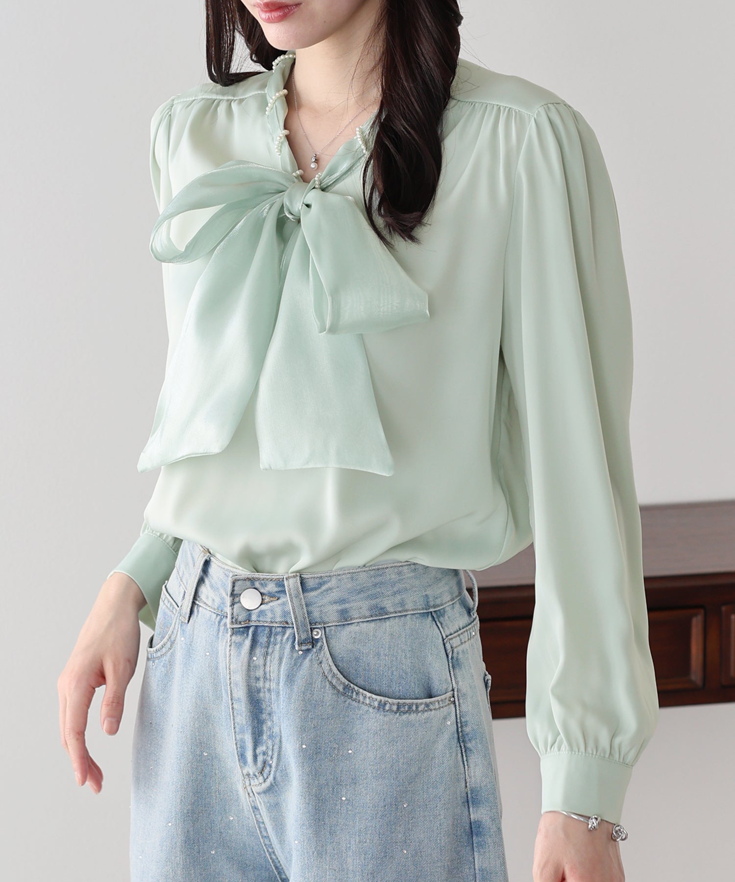 デニムと合わせれば、パールとボウタイの甘さが程よく中和された、洗練された大人カジュアルが完成します。