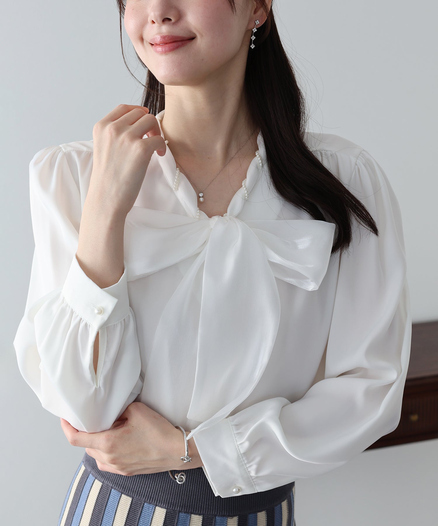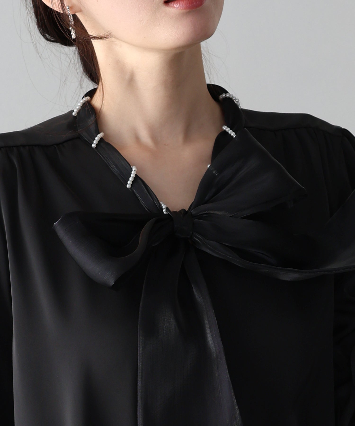 クラシカルなボウタイブラウスに、繊細なミニパールを贅沢にあしらった、上品かつトレンド感溢れる一着。
