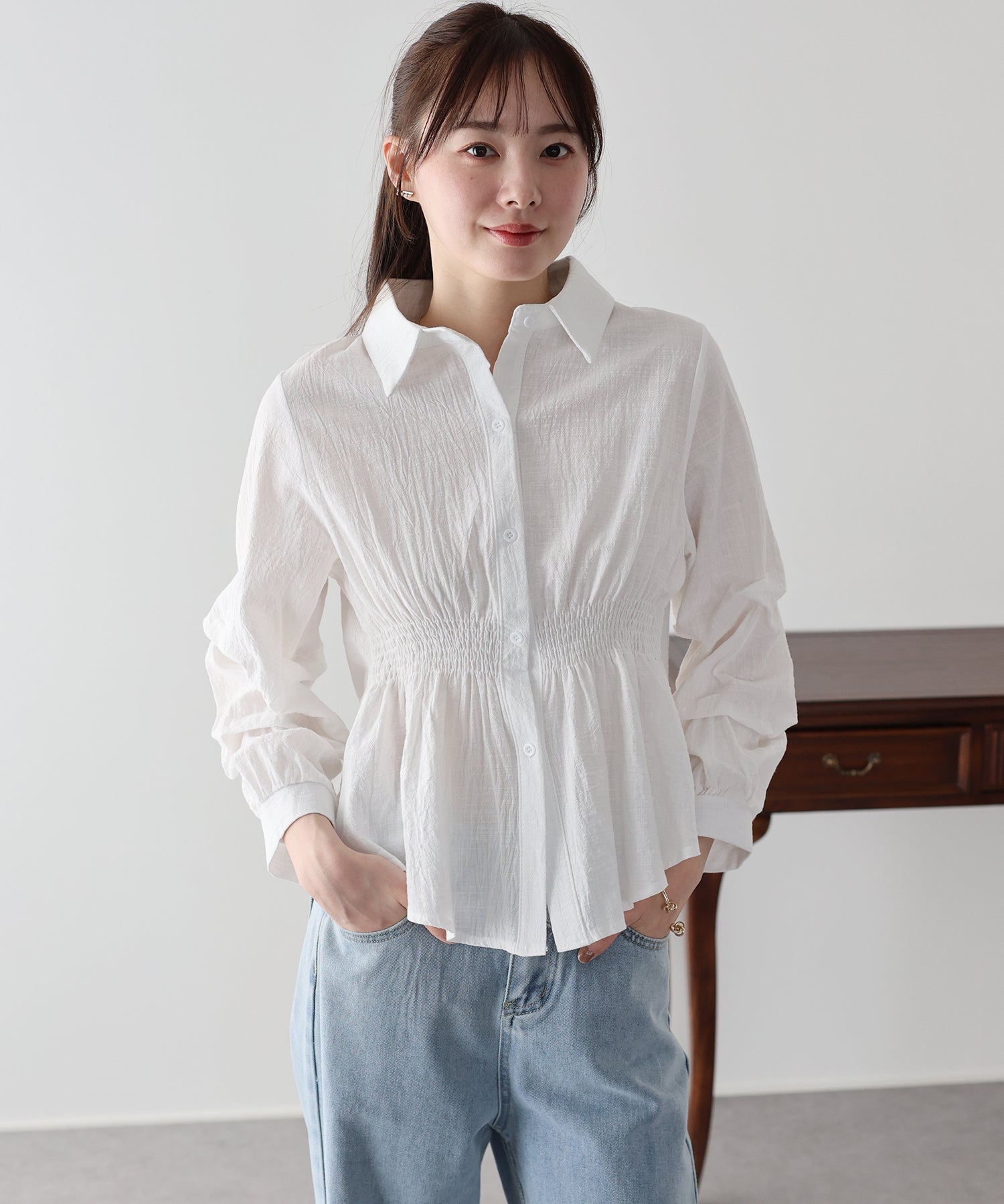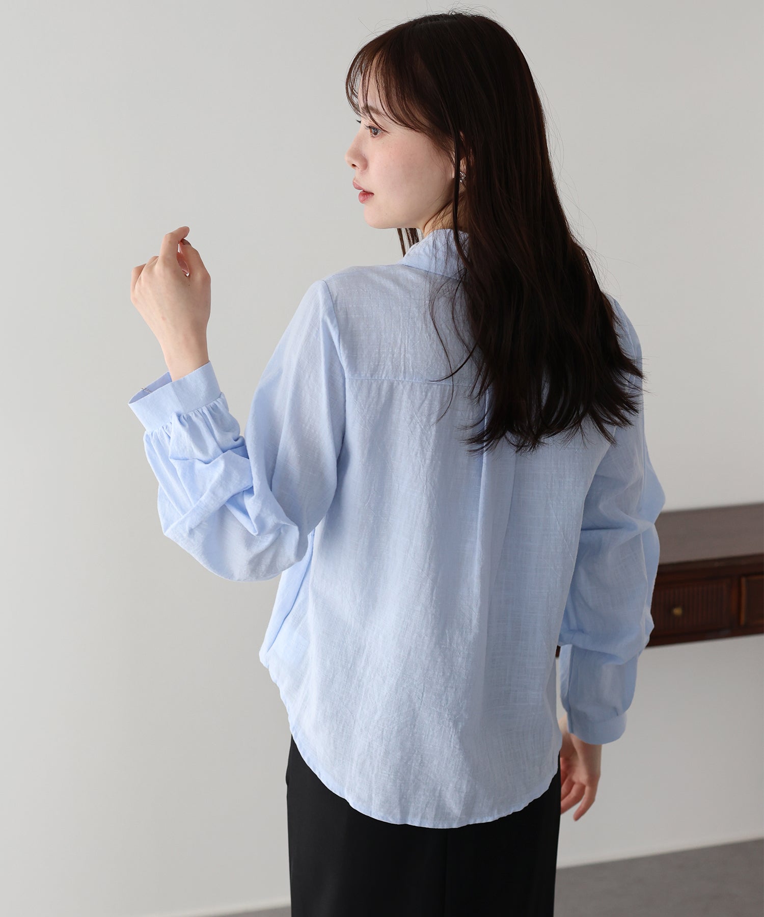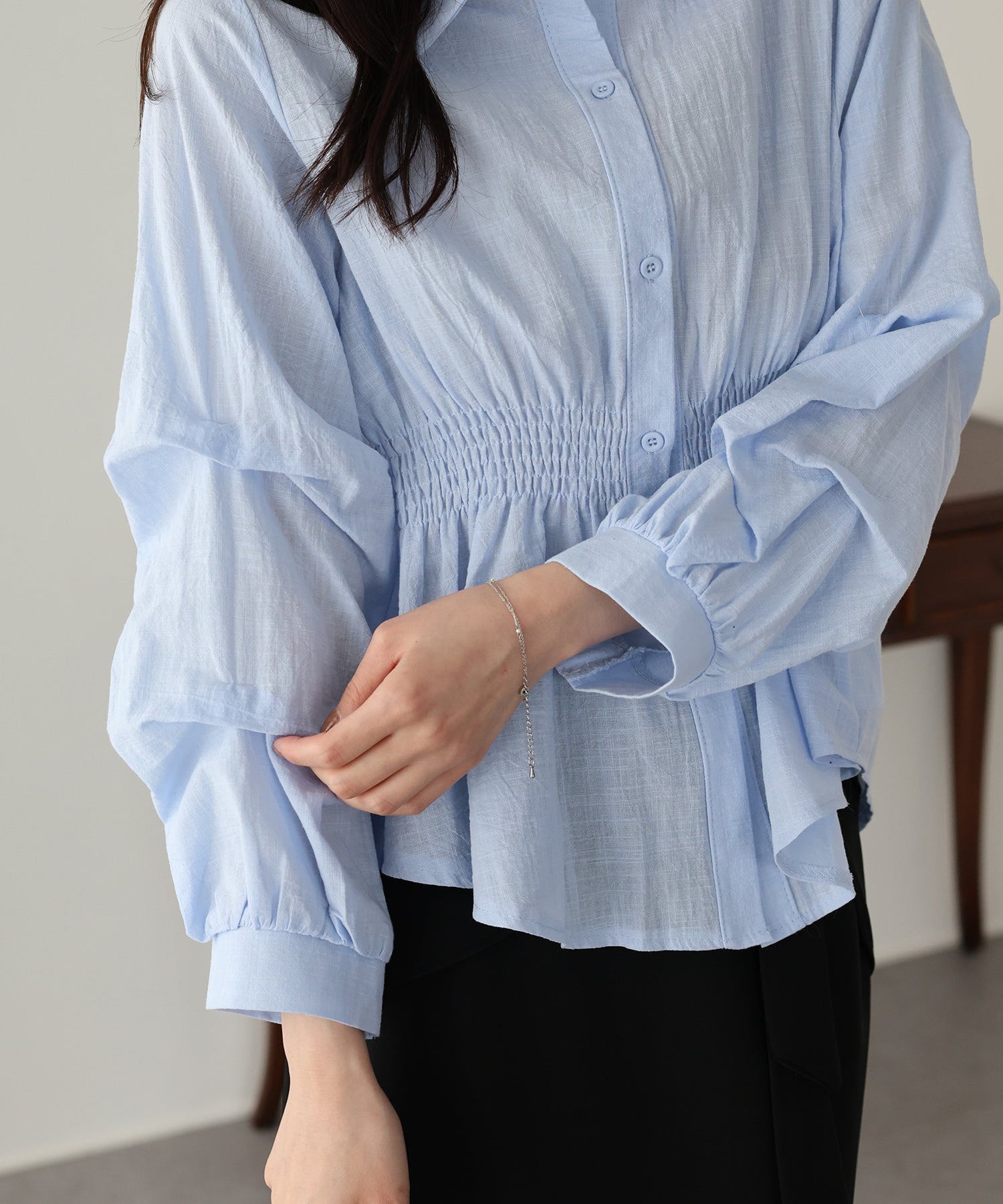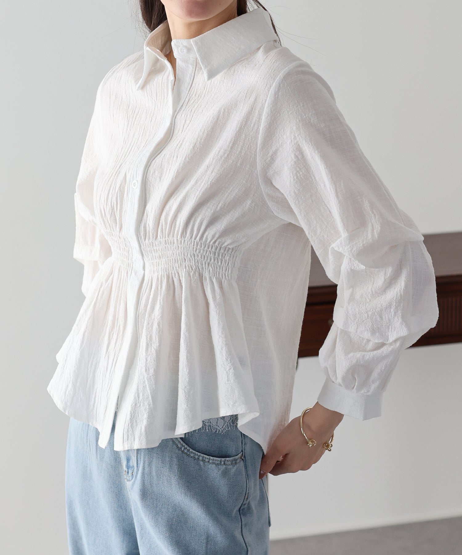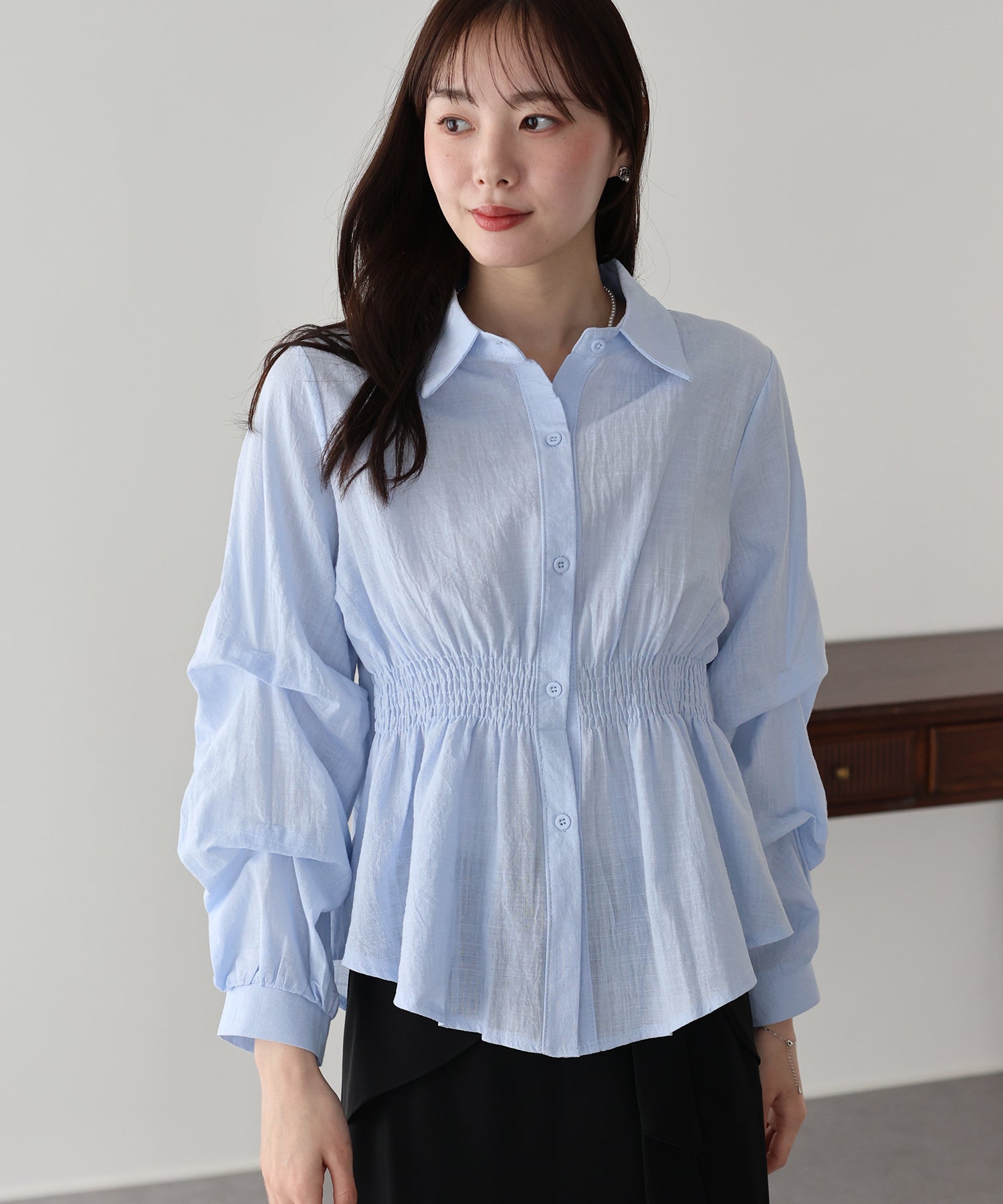 袖に施された立体的なタックが、上品で華やかなシルエットを描く主役級ブラウス。